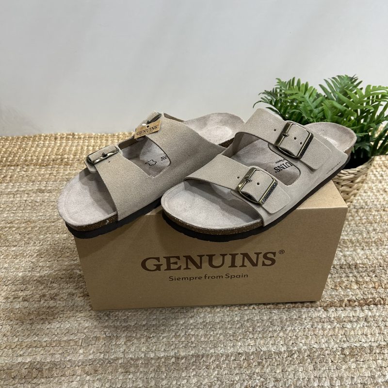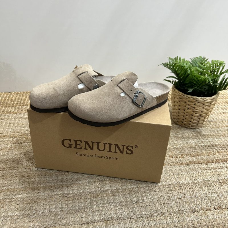 Zueco de piel serraje en 5 colores con planta anatómica Genuins y hebilla ajustable. Piel certificada por proveedores del Leather Working Group (LWG) con estatus oro. Está diseñado y fabricado en fábricas de Elche ( España ), bajo una producción sostenible y proveedores locales. El corte es de piel, la planta de corcho y foam ( la capa superior de la plantilla también es de piel ) y la suela es de EVA. La plantilla anatómica ofrece soporte, reduce la presión, mejora la alineación y estabilización, disminuye la fatiga y previene lesiones, proporcionando confort y protección al caminar.