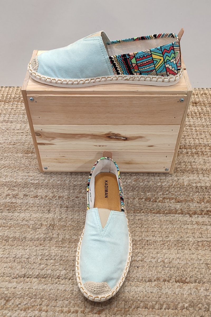 Espardeñas para hombre con suela de goma. Se compone por dos tipos de tela. Por un lado, en su parte delantera, contiene un tejido de ante de color azul celeste. Por otro lado, en la parte trasera del zapato, está compuesta por una tela de algodón con estampado de mosaicos que combina entre diferentes colores. Esta composición de diferentes telas y colores transforman la alpargata clásica común en las islas baleares en un artículo más arriesgado, digno de seleccionar con cualquier outfit en los días de verano.
