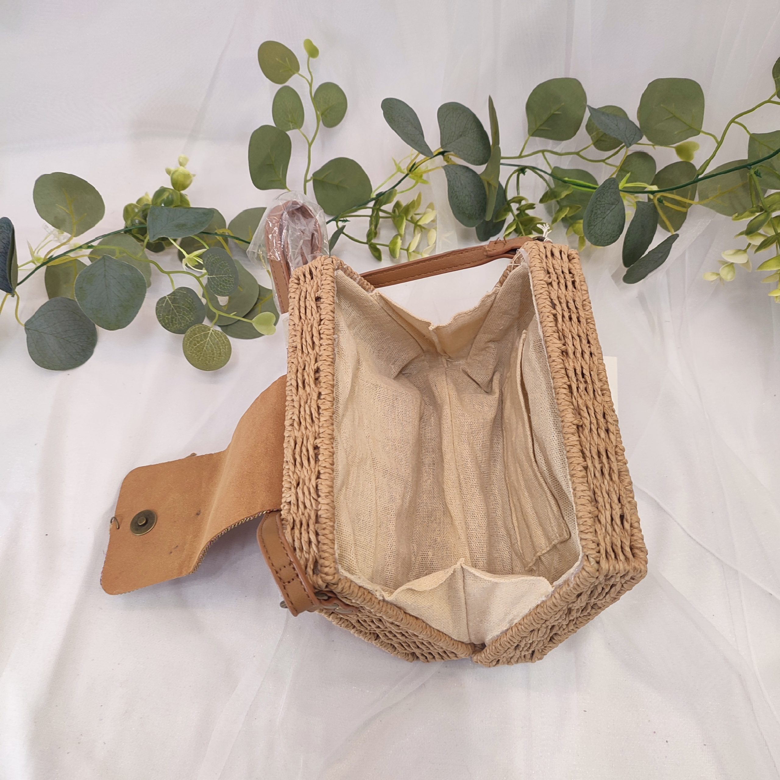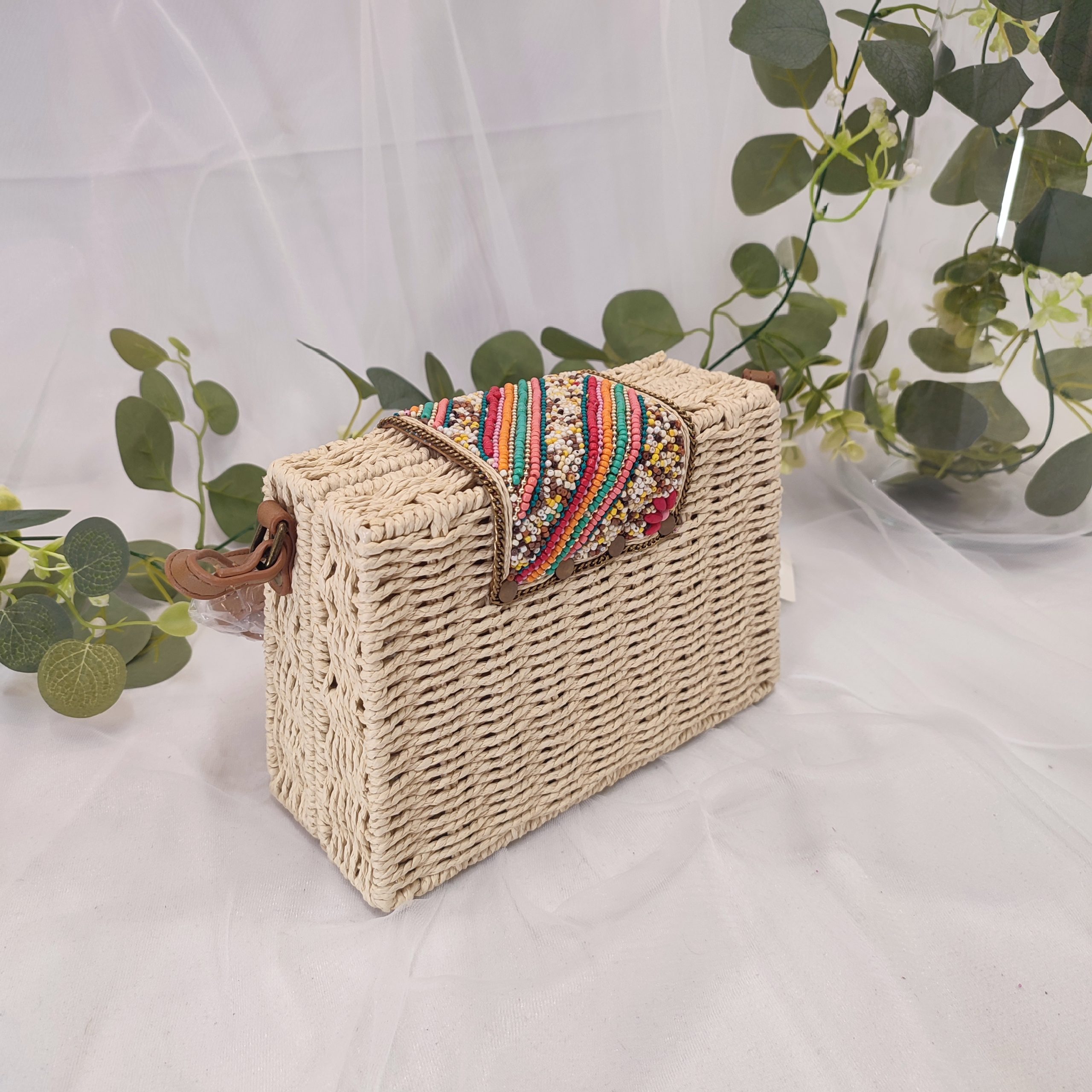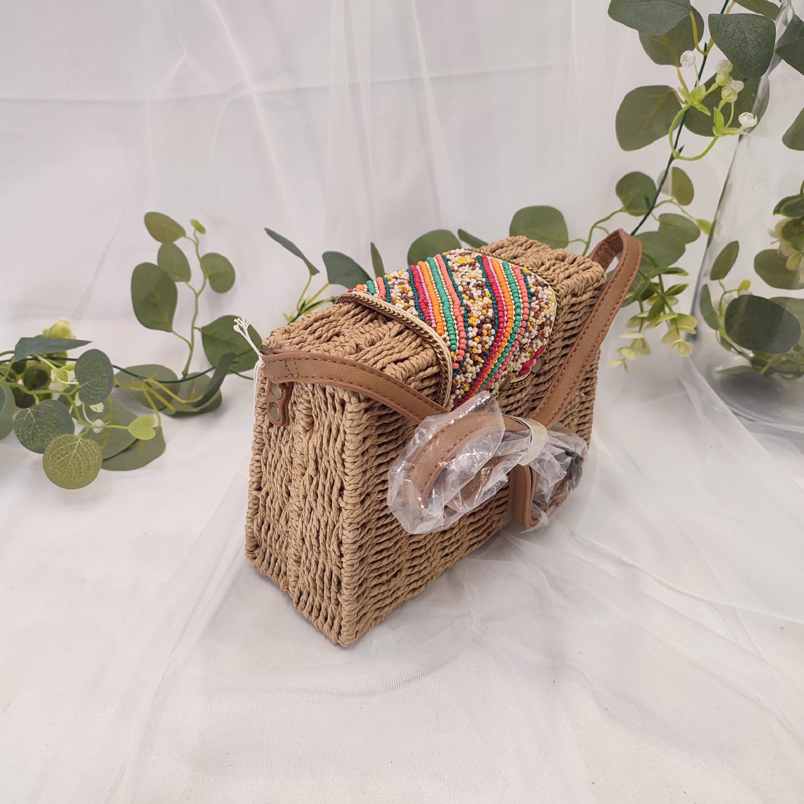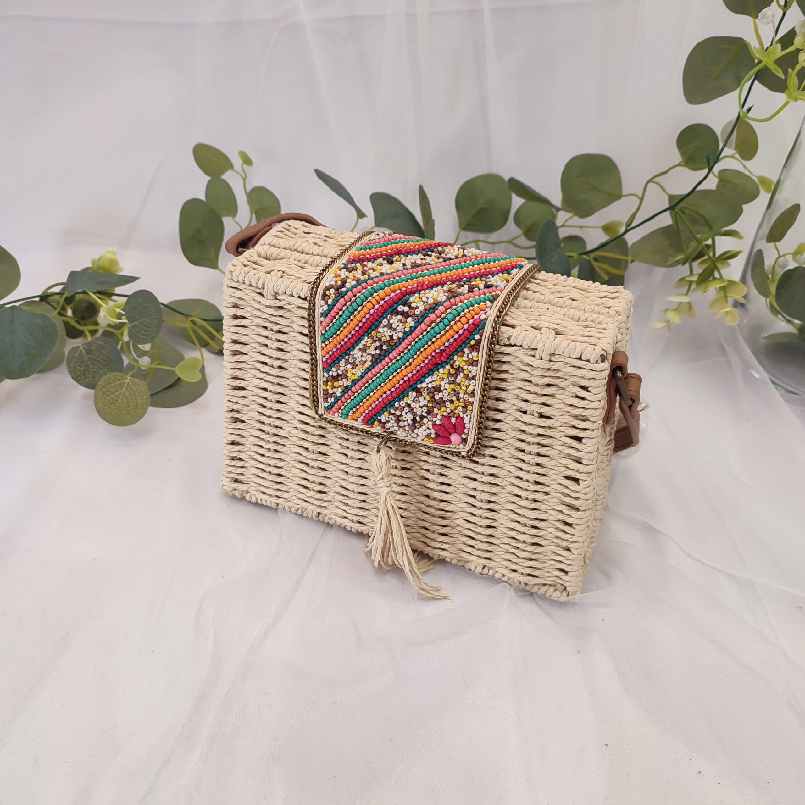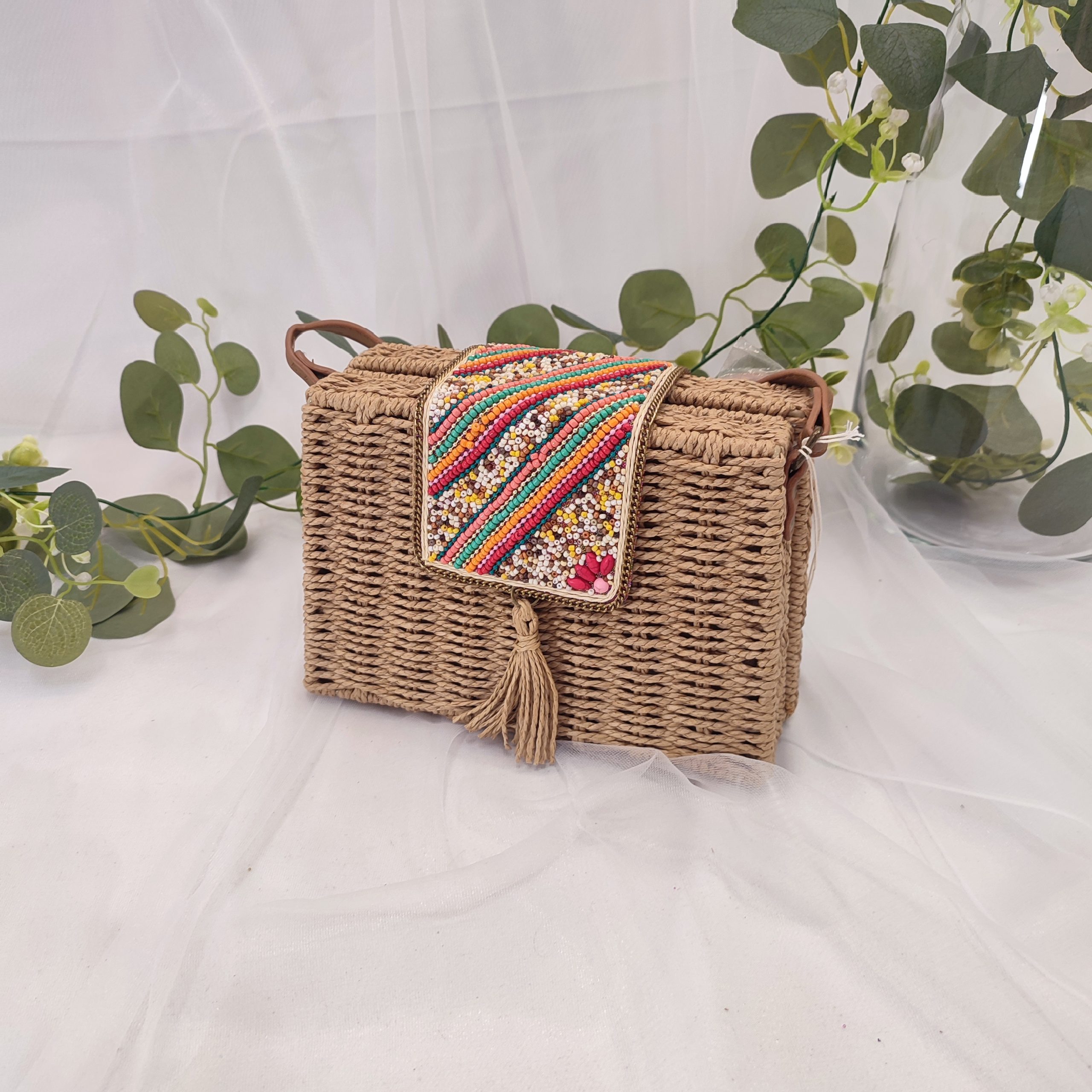 Este elegante bolso semi cuadrado está confeccionado con materiales naturales de alta calidad, como el ratán y la palma, que le dan un toque orgánico y sofisticado. Su interior está forrado con una suave tela de yute, que no solo aporta una sensación de frescura, sino que también incluye un pequeño bolsillo abierto, ideal para guardar tus objetos esenciales con comodidad. El cierre del bolso se distingue por un botón metálico oculto, asegurado a través de una solapa adornada con mostacillas y canutillos en colores vibrantes, lo que otorga un diseño etéreo y bohemio con un toque étnico muy característico del estilo ibicenco. La correa, de polipiel marrón, es completamente ajustable, lo que permite llevarlo de forma cómoda y a tu gusto. Además, la cadena de metal dorado, fina y delicada, complementa el diseño aportando un aire de elegancia sutil. Este bolso es perfecto para quienes buscan un accesorio único, que combine lo natural y lo artesanal con el diseño moderno y atemporal. Ideal para cualquier ocasión, añadiendo un toque chic y distintivo a tu look.