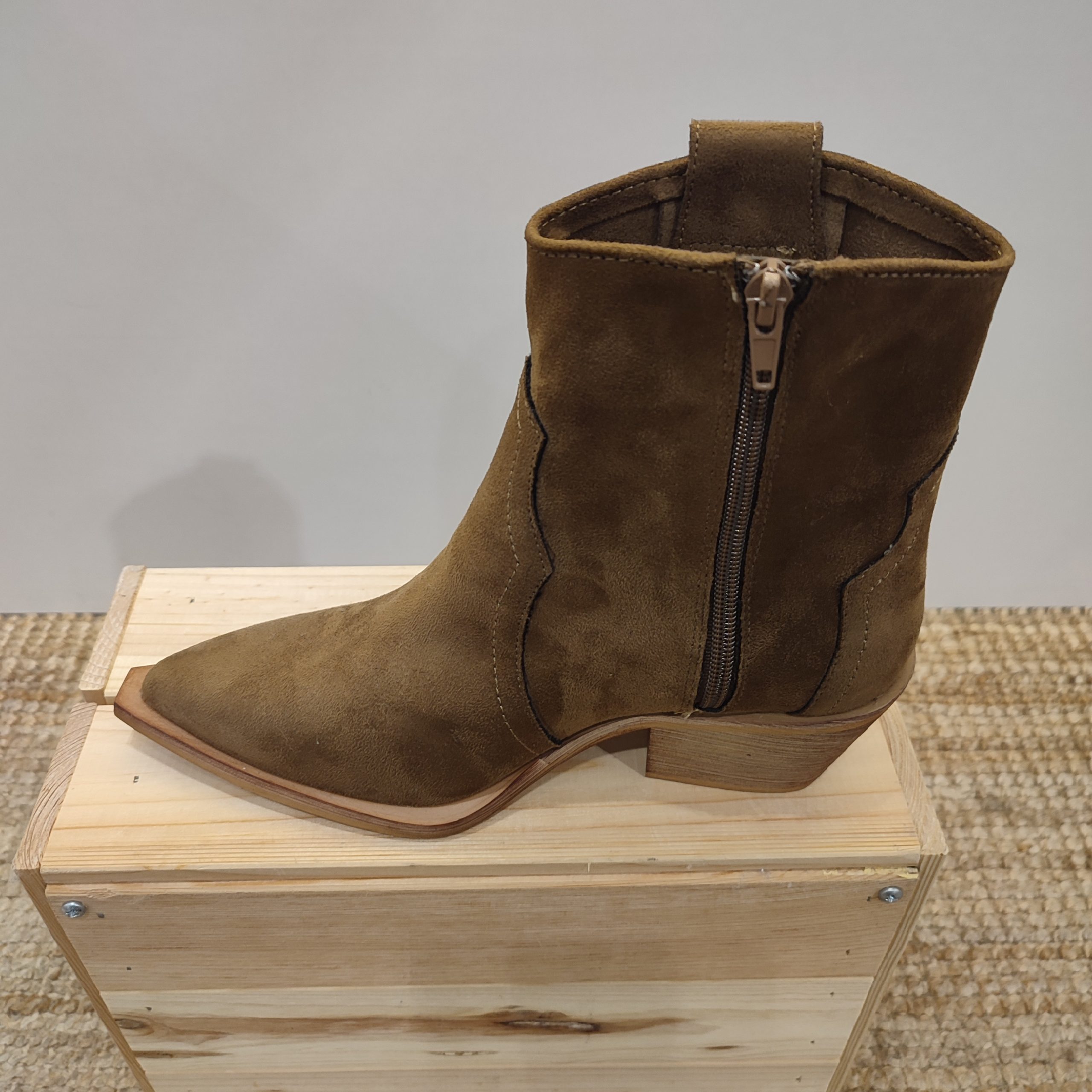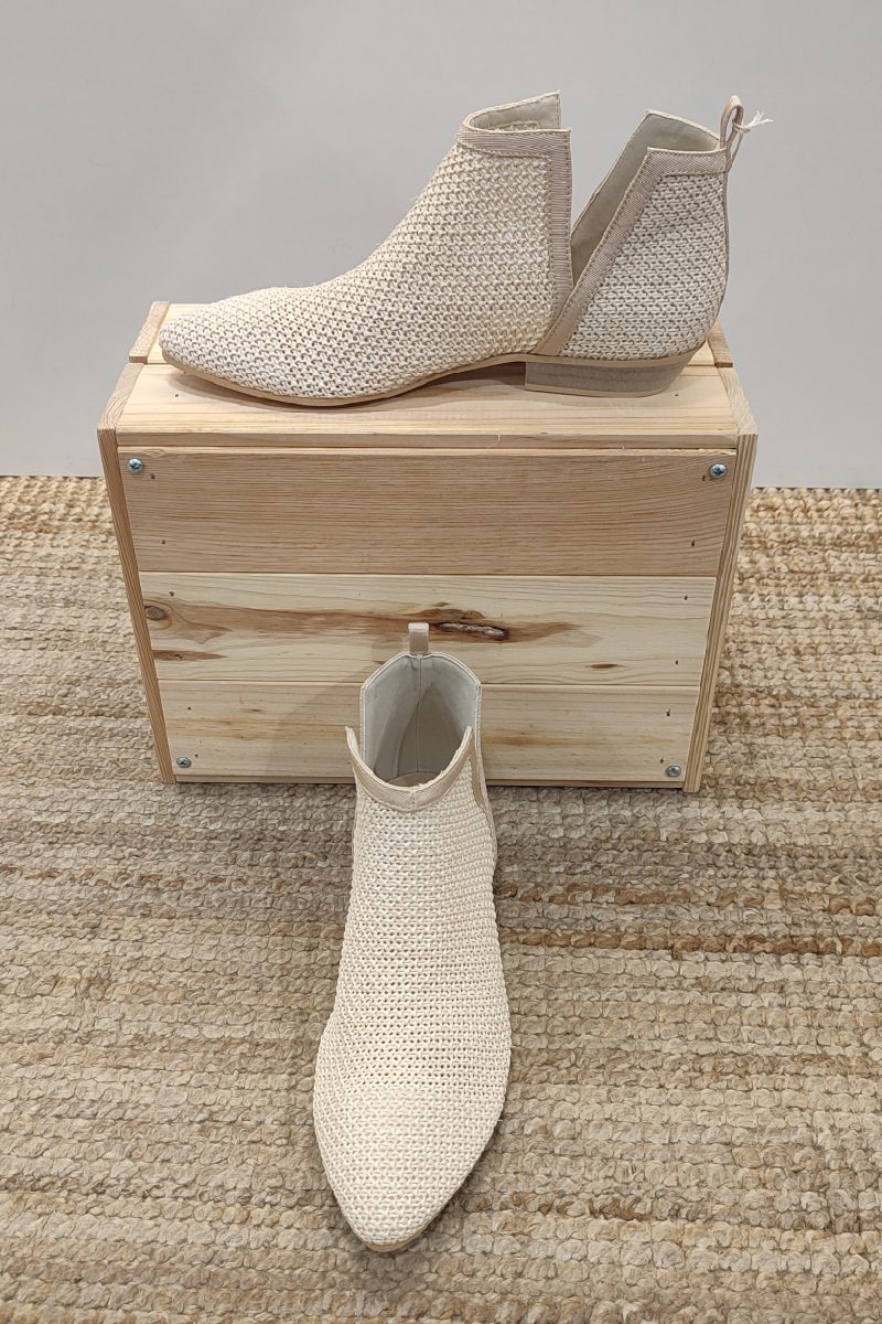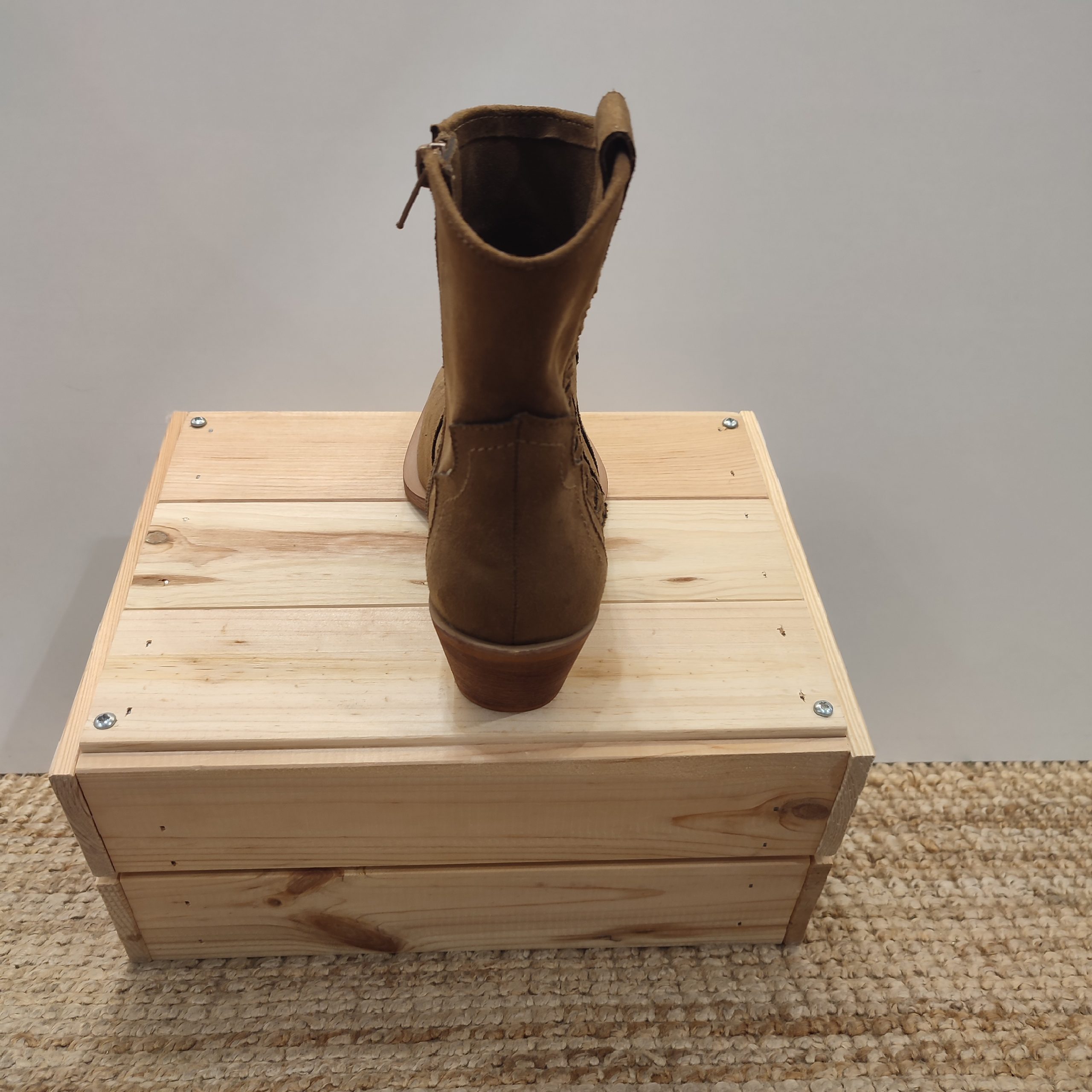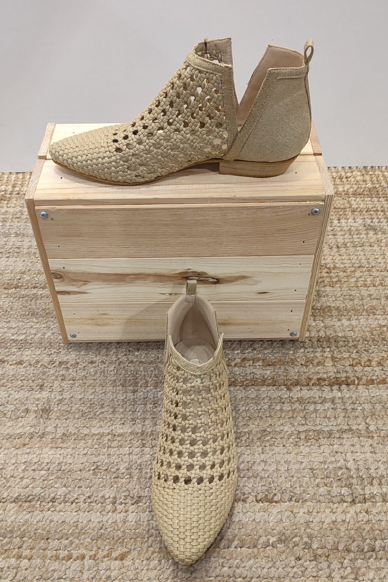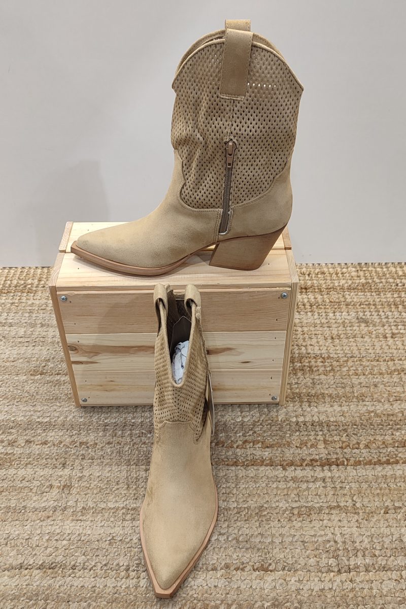 Botas de ante con caña baja de 15 cm. Con un reborde de la misma tela de ante en el empeine y en el talón , delimitado con un pespunte en hilo del mismo tono. Contiene cierre en un lateral y un trenzado del mismo material en el otro lado. Tacón de 5 cm.  El color neutro y la textura del ante los hacen especialmente adecuados para looks de otoño y primavera, para combinar con faldas, pantalones de lino o vaqueros.