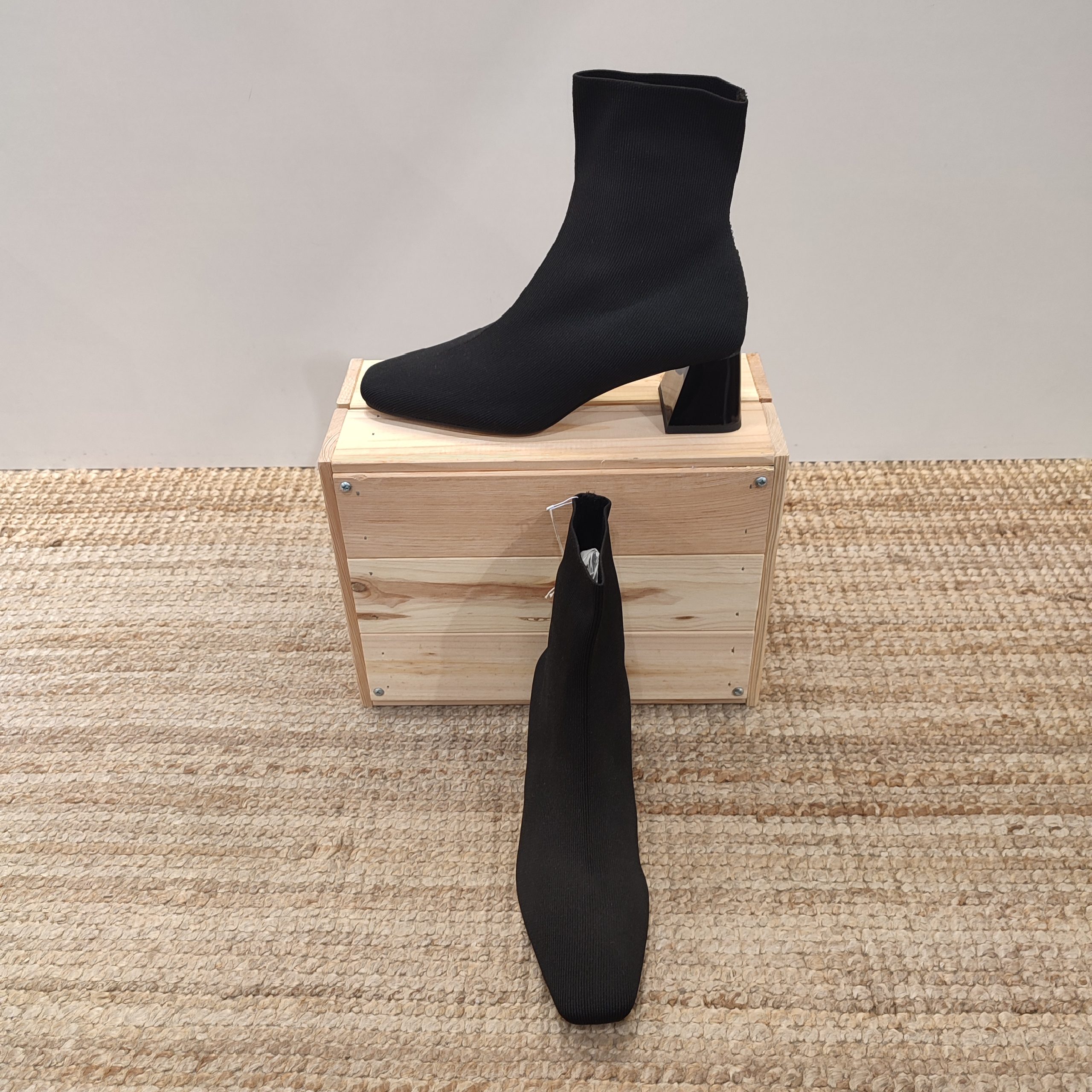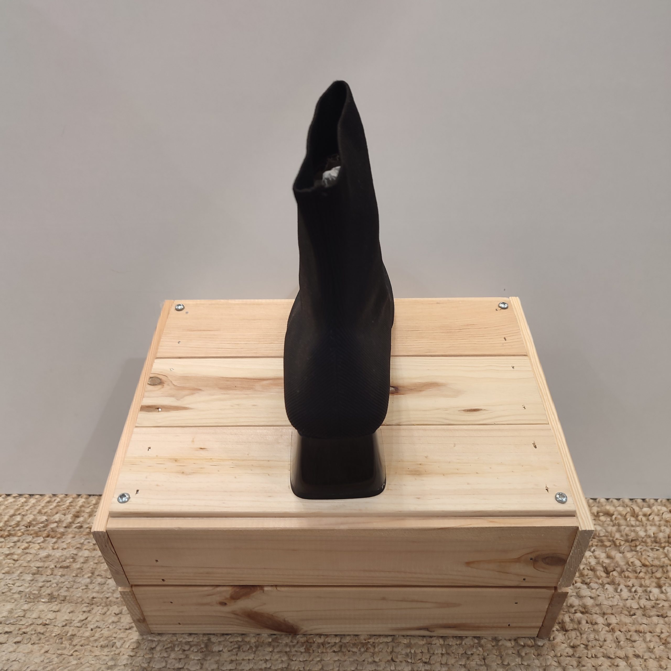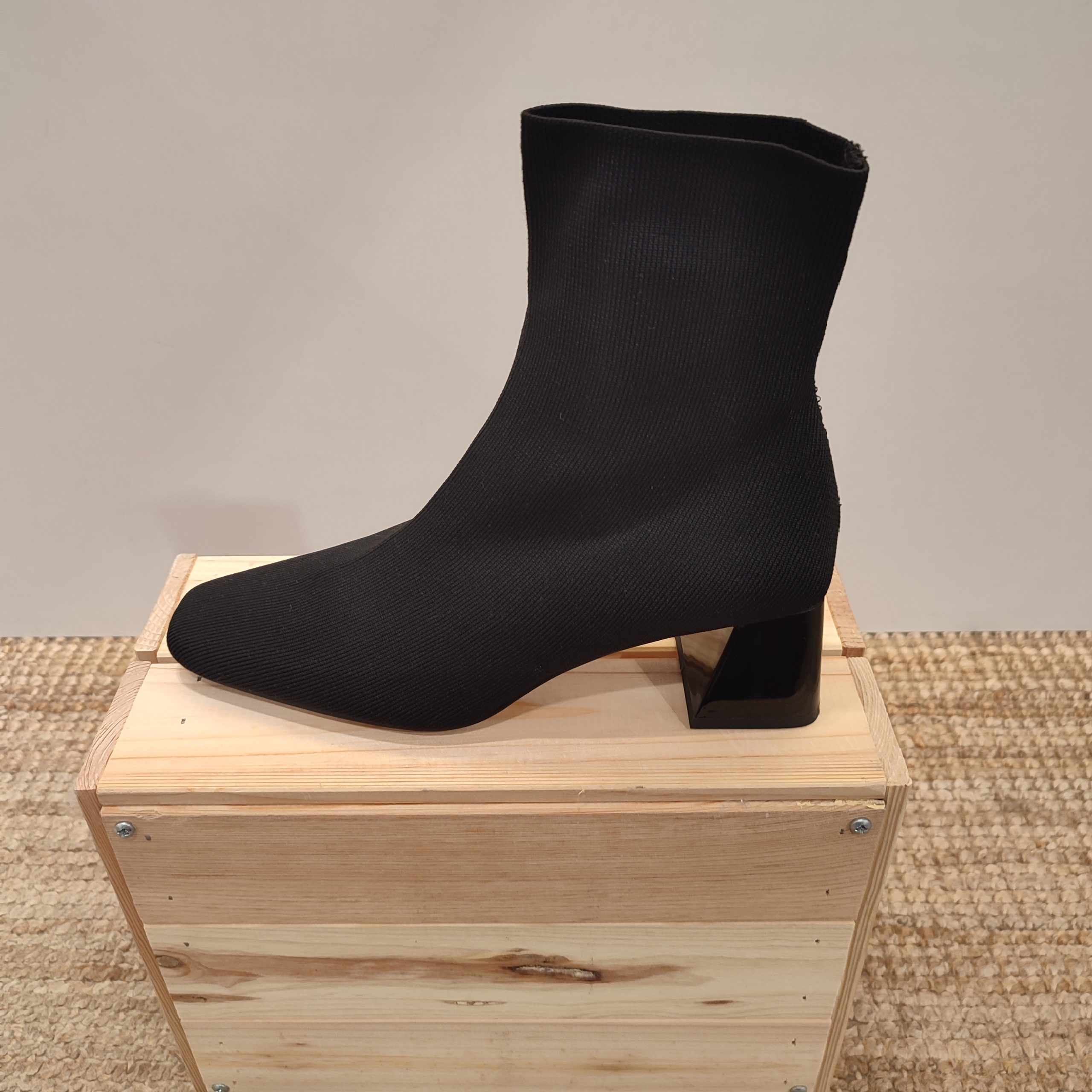 Bota baja para mujer con tela elástica, ceñida al pie y al tobillo. Es de color negro. Además, cuenta con un tacón de charol cuadrado con 5cm también de tonalidad oscura. El material usado hace que se ajuste perfectamente a su extremidad, siendo muy cómodo en su uso. Su diseño angosto y de punta cuadrada la convierte en una pieza elegante y sofisticada.