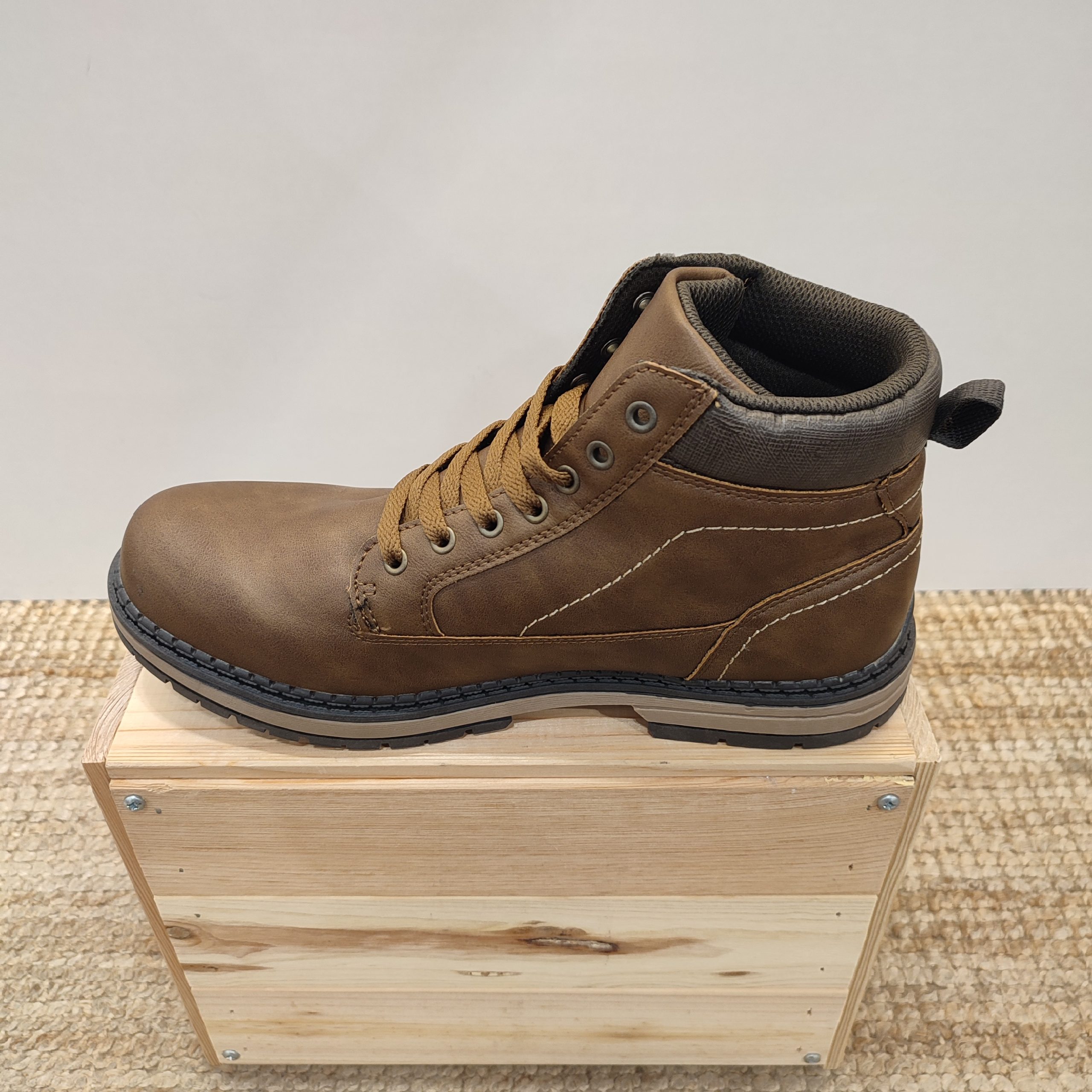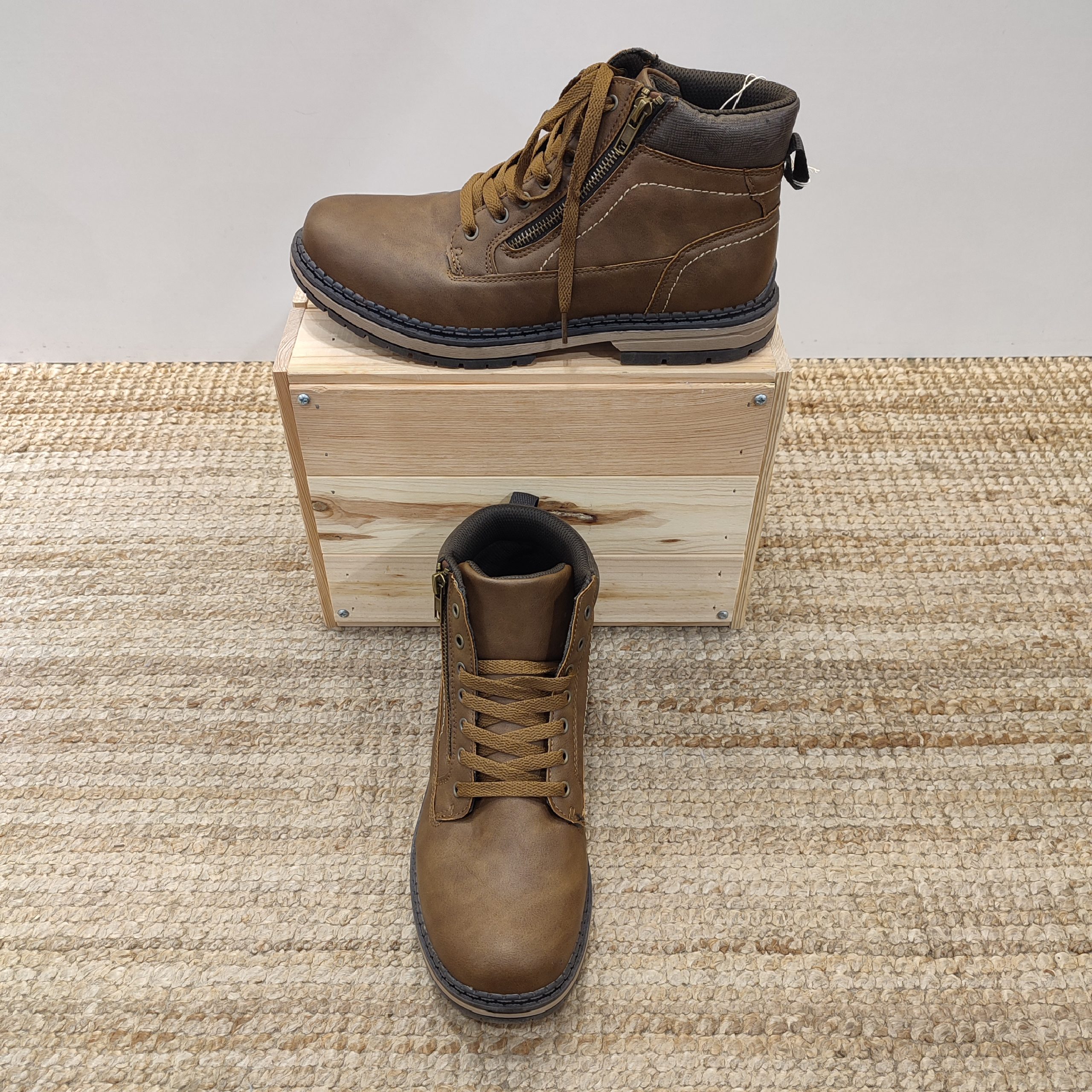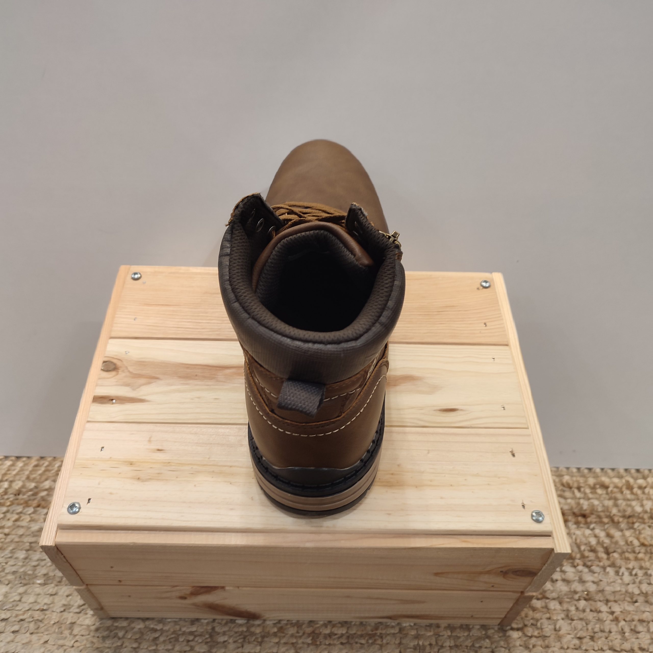 Botas de polipiel para hombres de color marrón. Tienen un estilo de montaña aunque su uso puede ser más estético, si así lo desea el cliente, como por ejemplo dar un paseo por la ciudad en invierno con frio o lluvia ya que son resistentes al agua y esta no traspasa al interior del calzado. Contiene un cierre estético de cremallera en el lateral y cordonera de siete pasados. Es una bota muy cálida para los días más fríos de invierno. Además posee una suela de caucho con un taco de 2 cm por lo que la convierte en antideslizante.