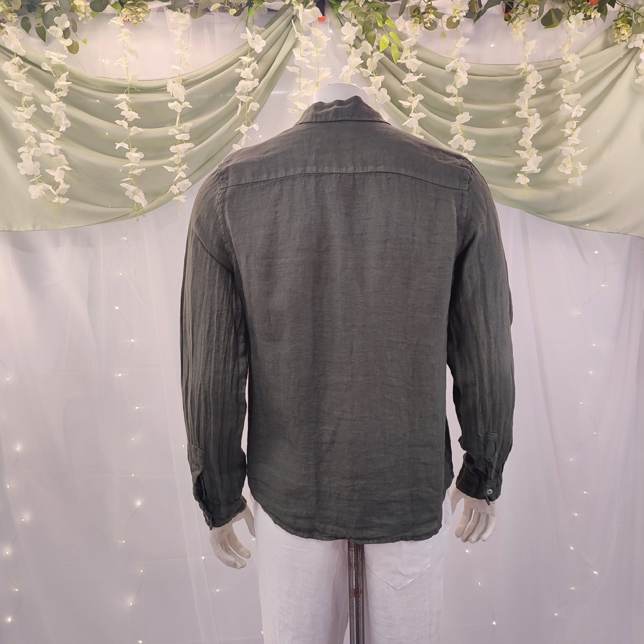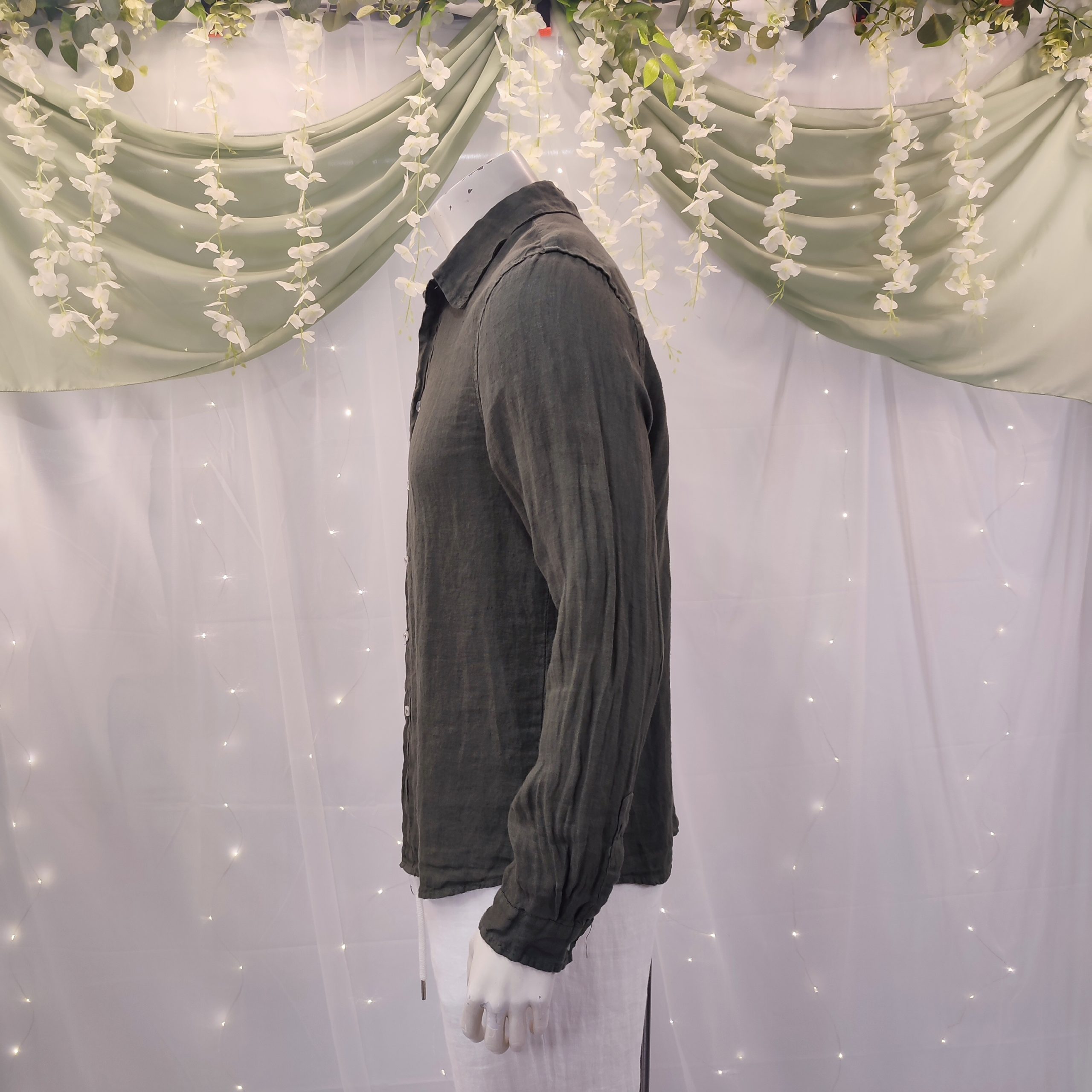 Descubre la elegancia atemporal con nuestra camisa de lino para hombre, confeccionada con lino italiano de la más alta calidad. Su diseño minimalista, completamente liso, y el sofisticado cuello italiano, hacen de esta prenda una opción ideal tanto para ocasiones formales como informales.