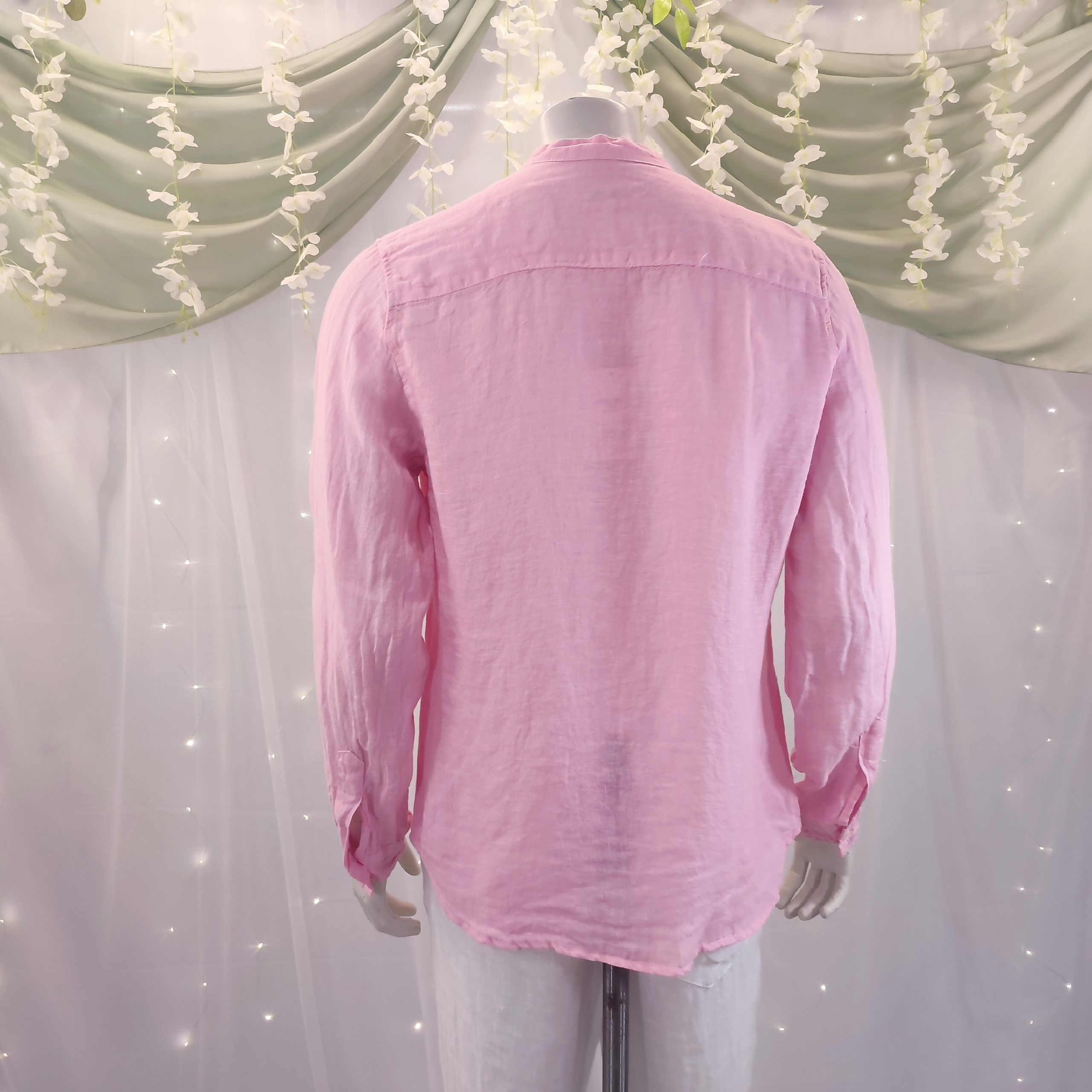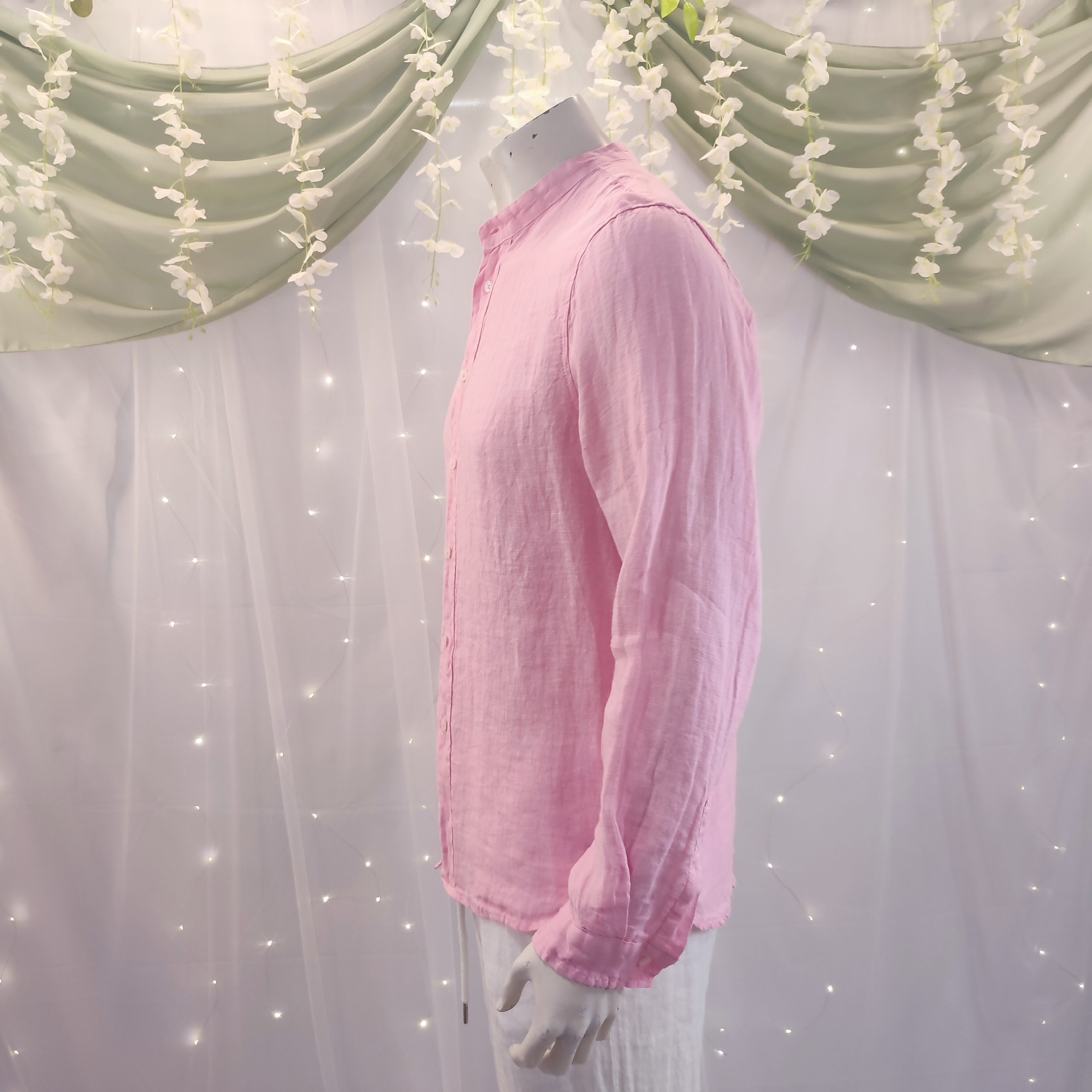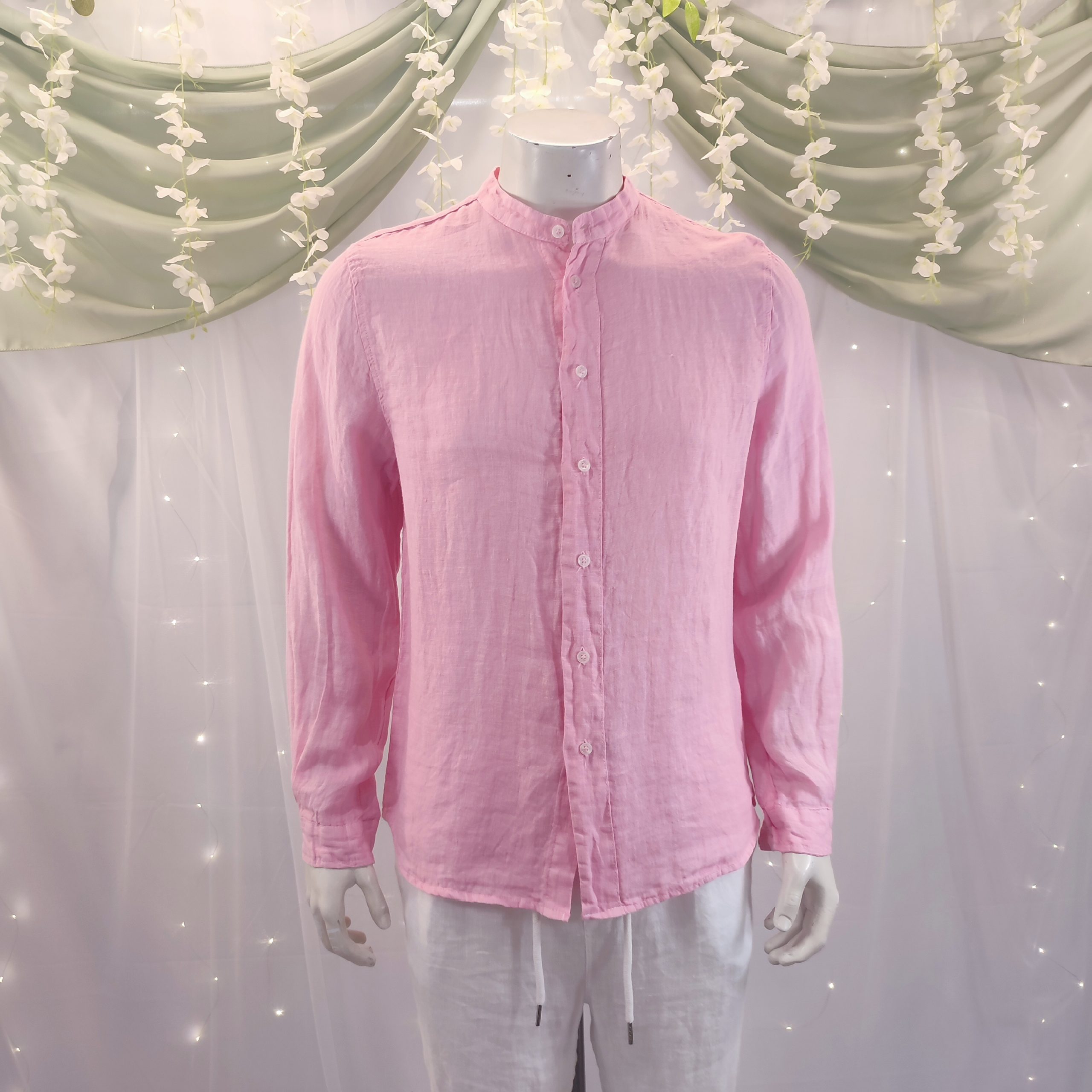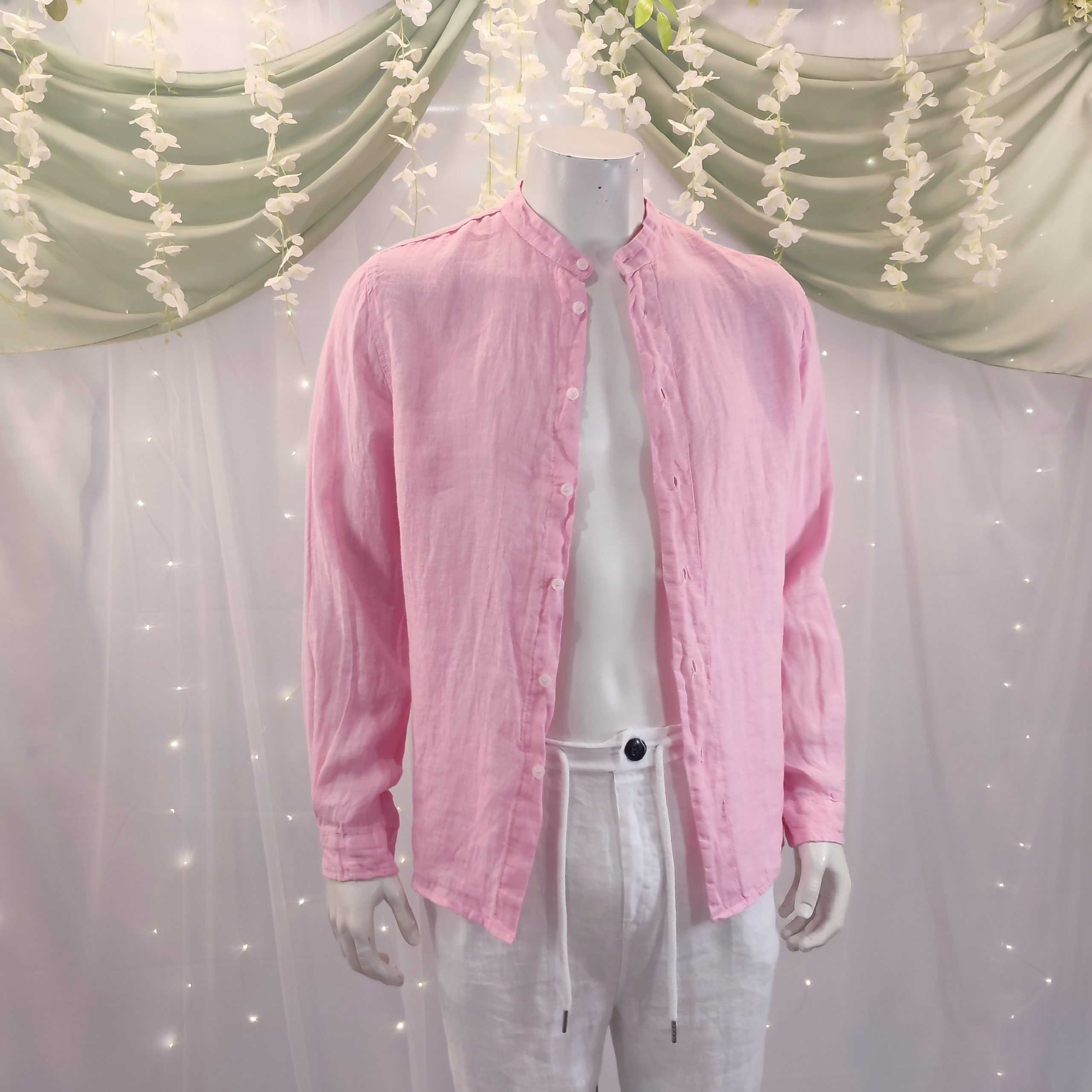 Esta elegante camisa de manga larga con cuello mao es una opción perfecta para los días cálidos de verano. Fabricada al 100% en lino, su material ligero y transpirable la convierte en una prenda ideal para disfrutar del clima de Mallorca con total comodidad. El suave color rosa le aporta un aire fresco y luminoso, mientras que su diseño liso y sencillo resalta por su sofisticación.