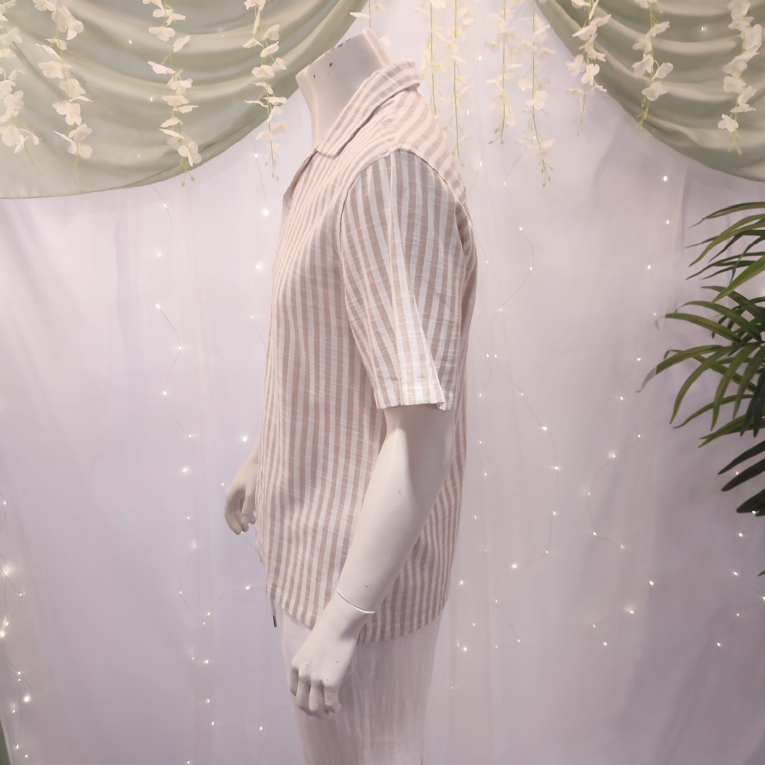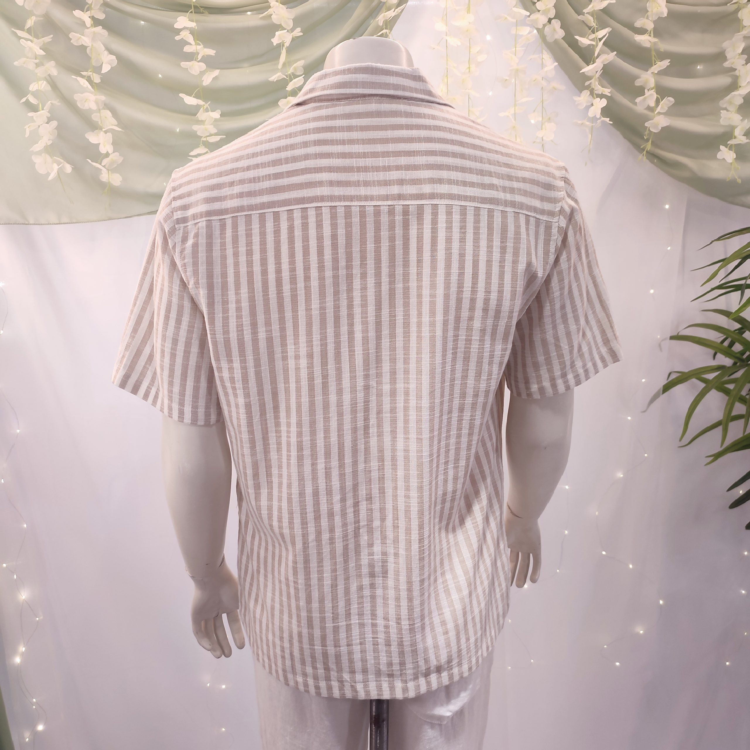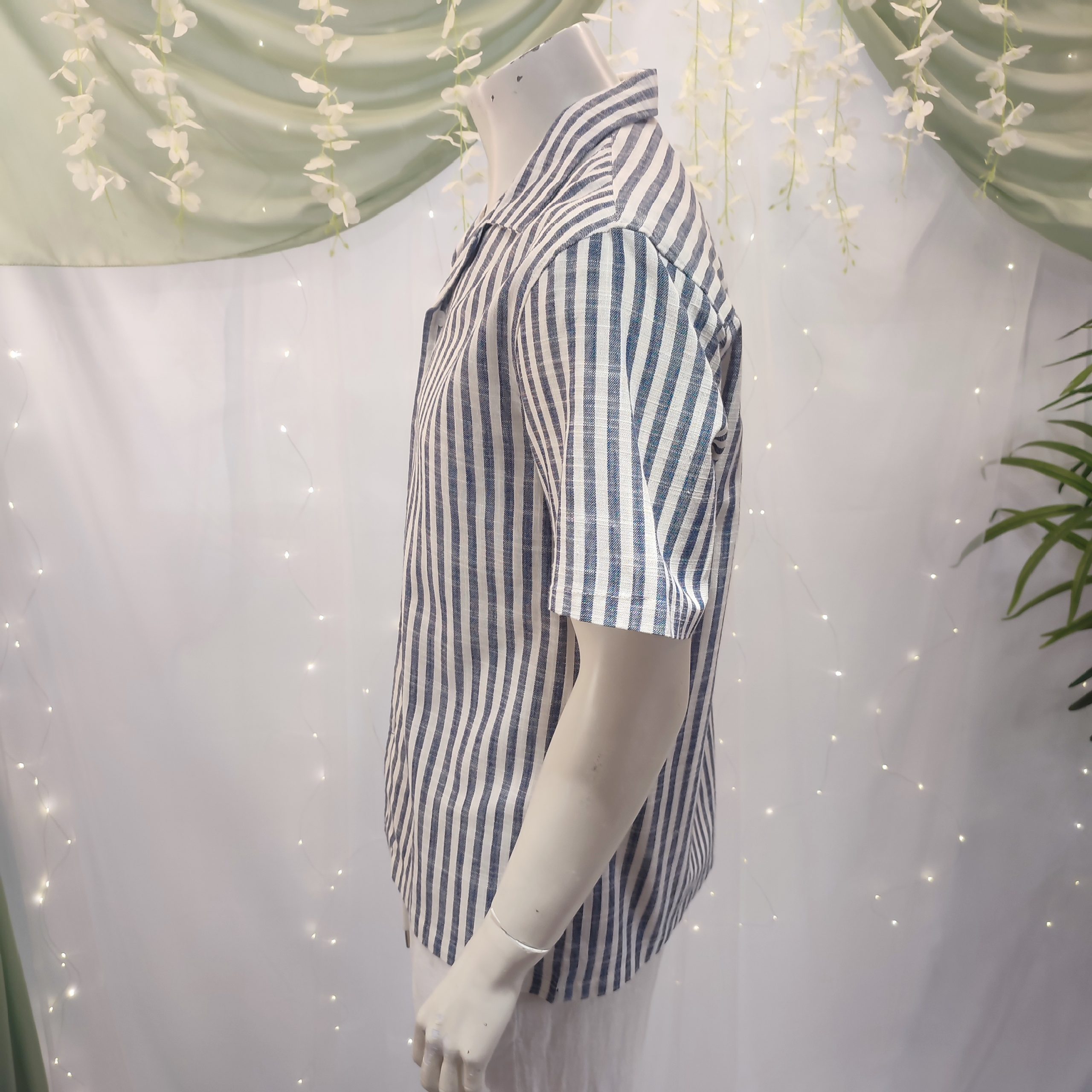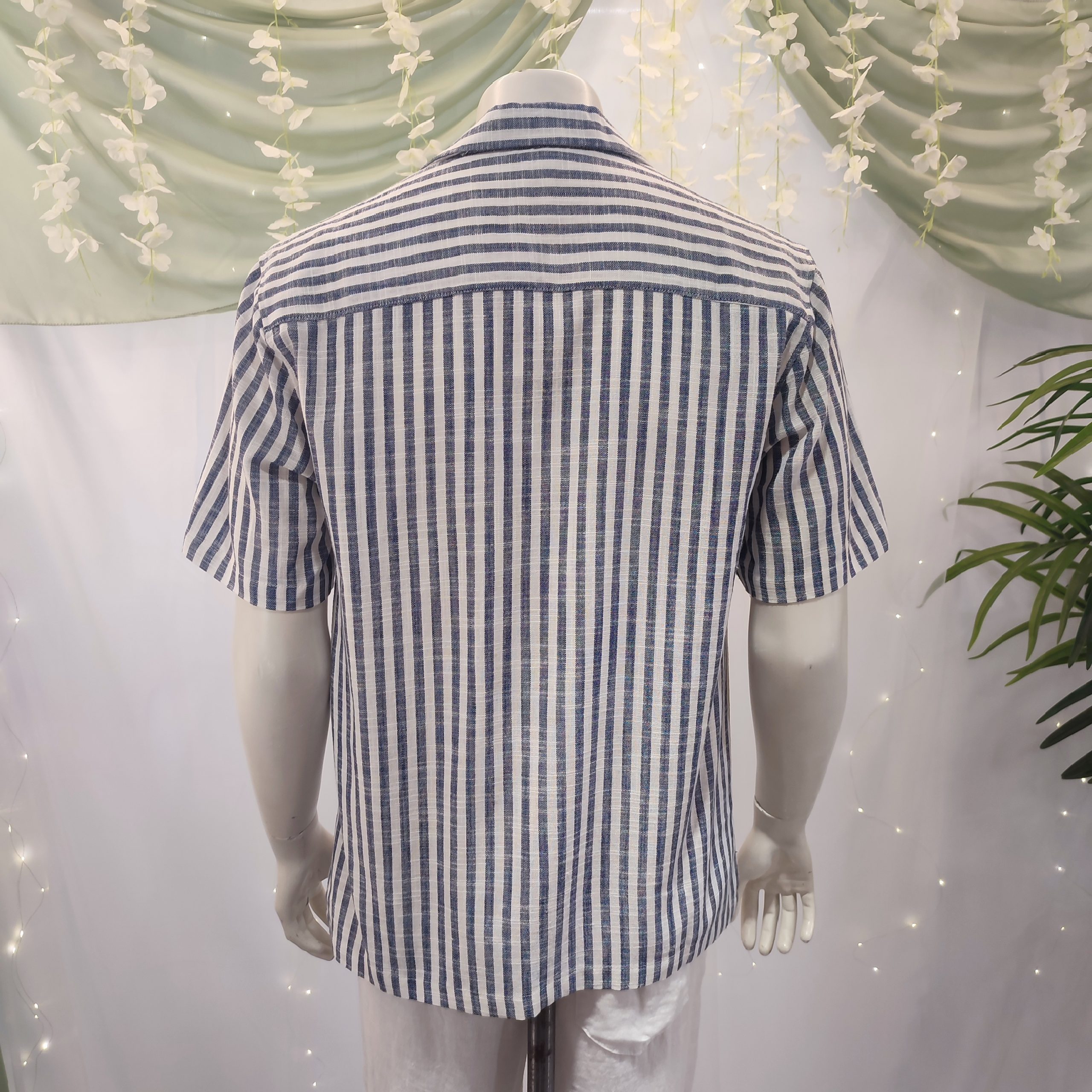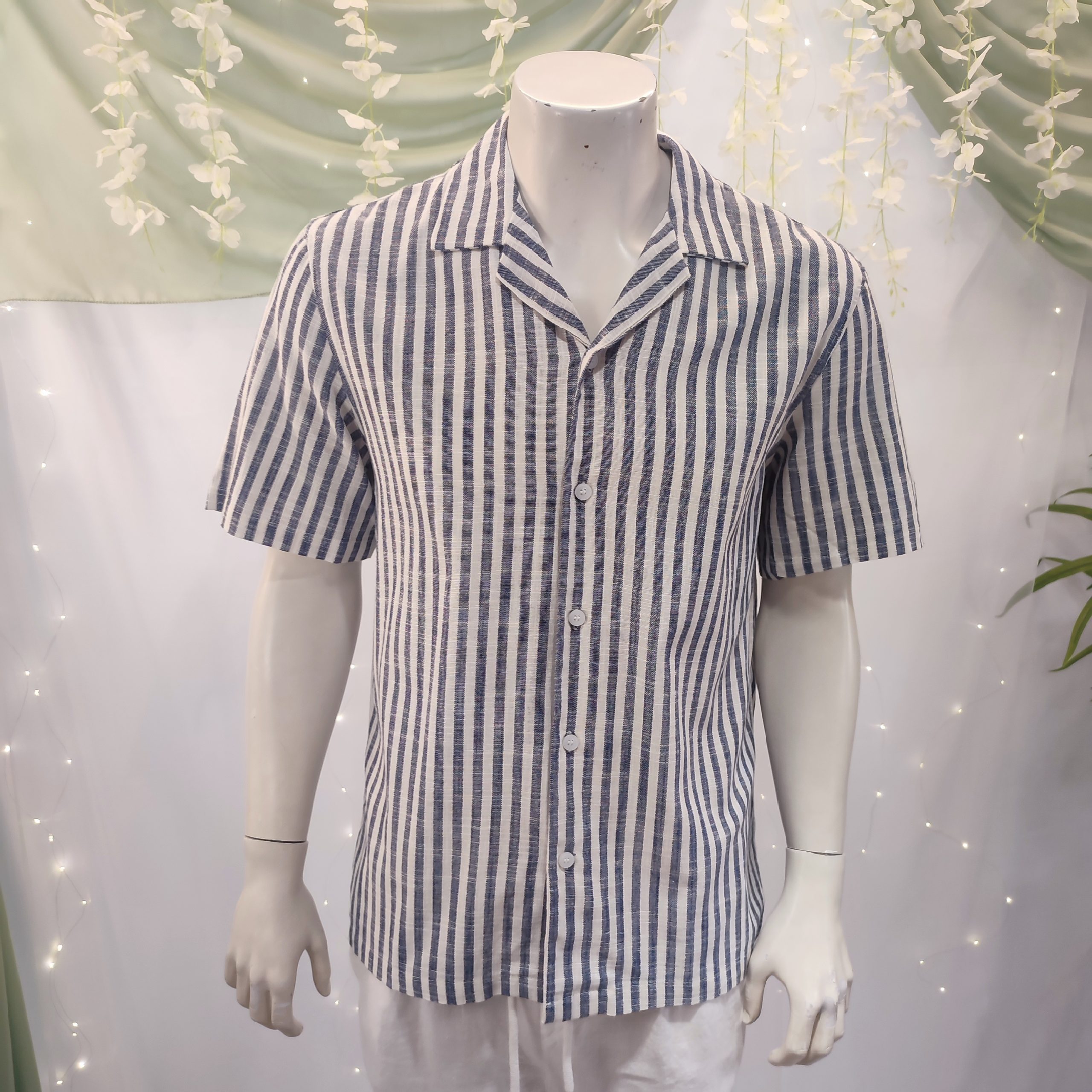 La camisa presenta un cuello italiano abierto, que añade elegancia y desenfado a partes iguales. El estampado de líneas verticales aporta un efecto estilizado y juega con el contraste entre el blanco de fondo y los tonos disponibles: azul marino y beige, ambos pensados para transmitir ese estilo relajado y natural tan propio del Mediterráneo.