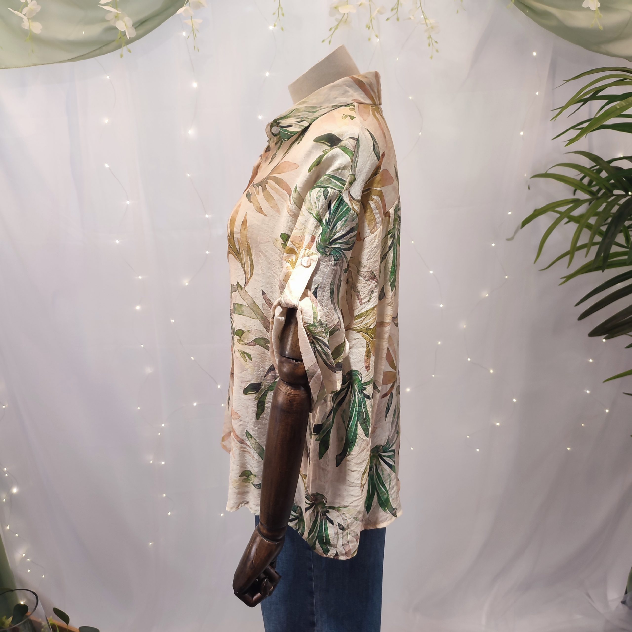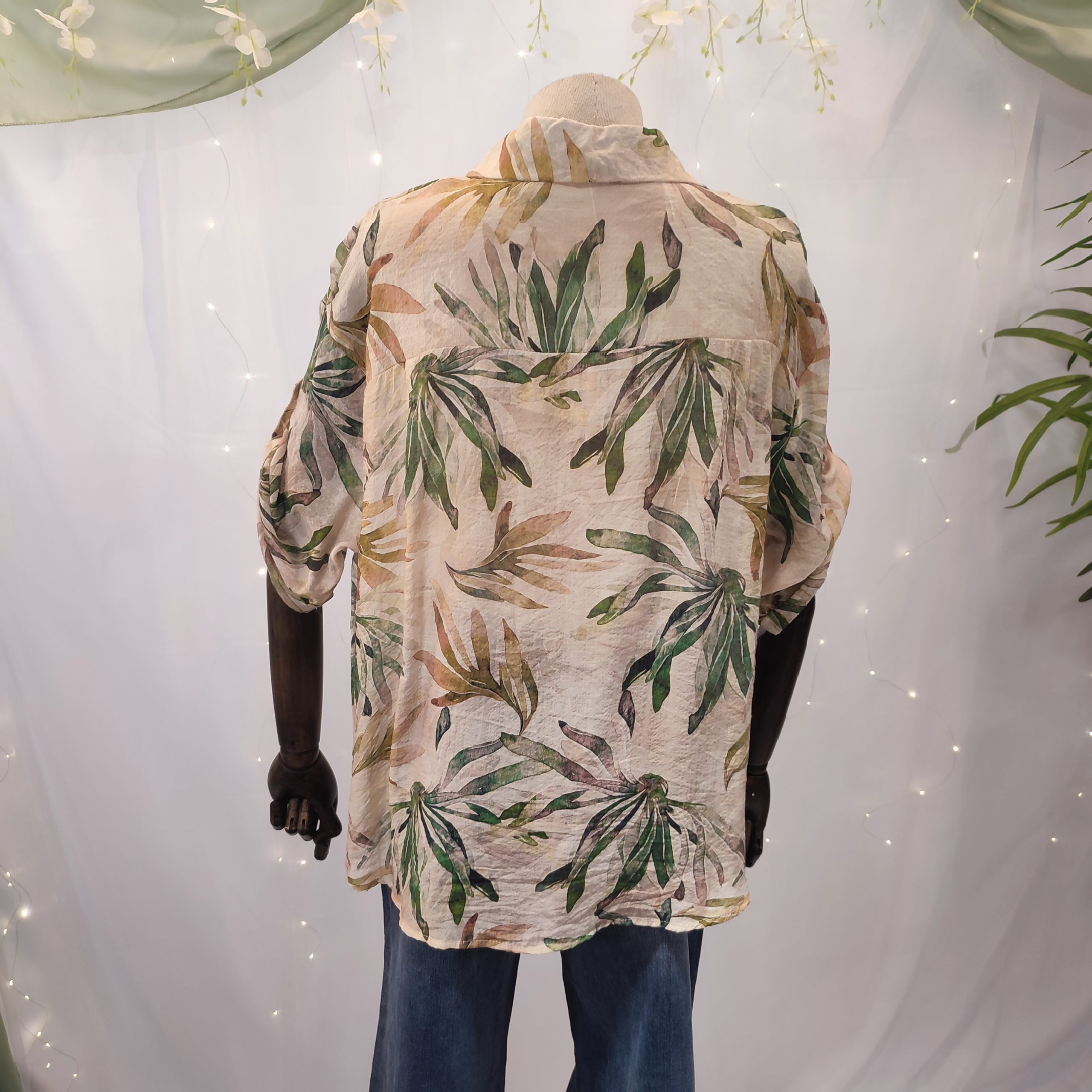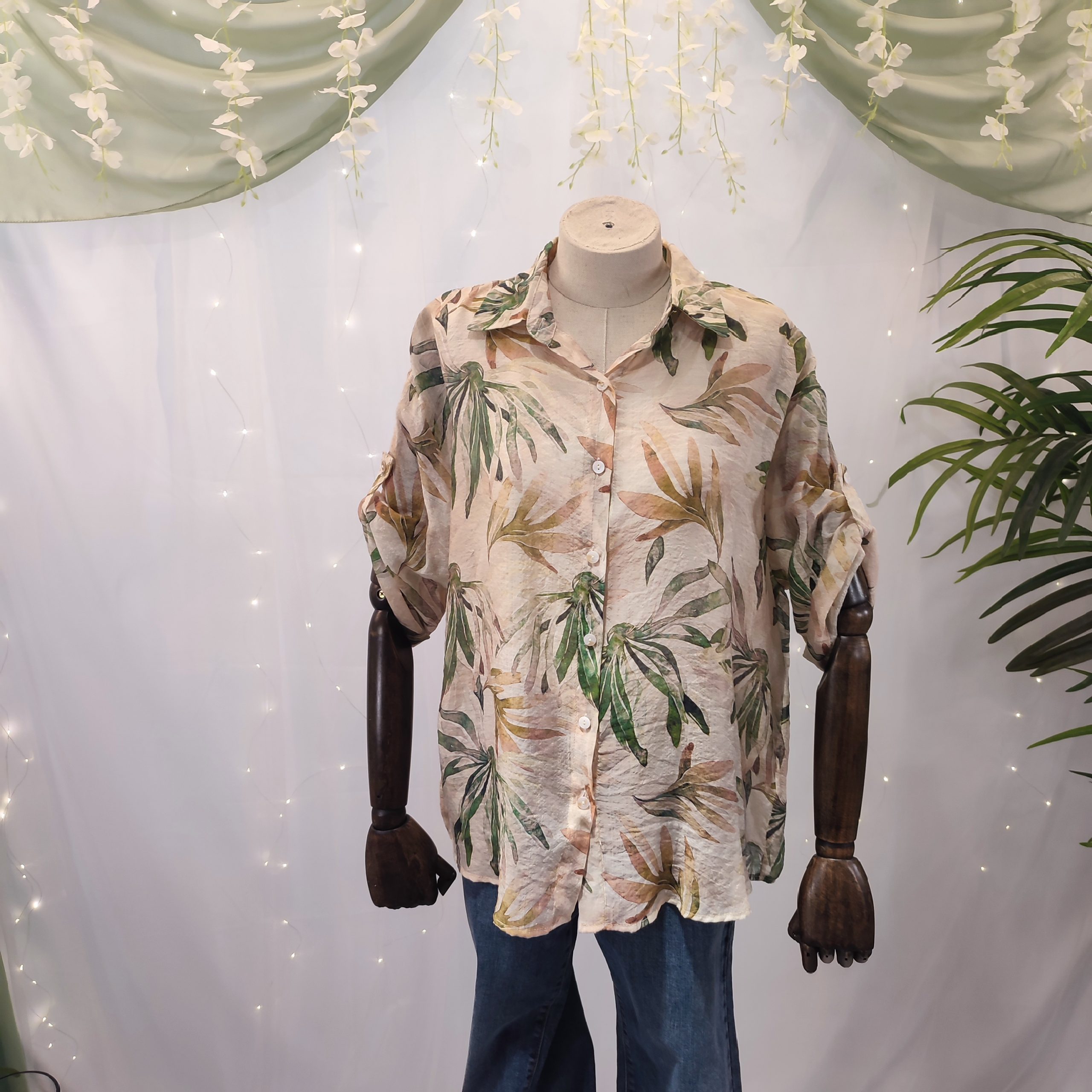 El diseño presenta un bonito estampado de hojas y flores en tonos verdes sobre un fondo color tierra, creando un contraste armonioso y lleno de vida, perfecto para quienes aman los motivos inspirados en la naturaleza. Su cuello clásico terminado en pico aporta un aire refinado, mientras que el cierre frontal con siete botones la convierte en una prenda práctica y fácil de llevar.