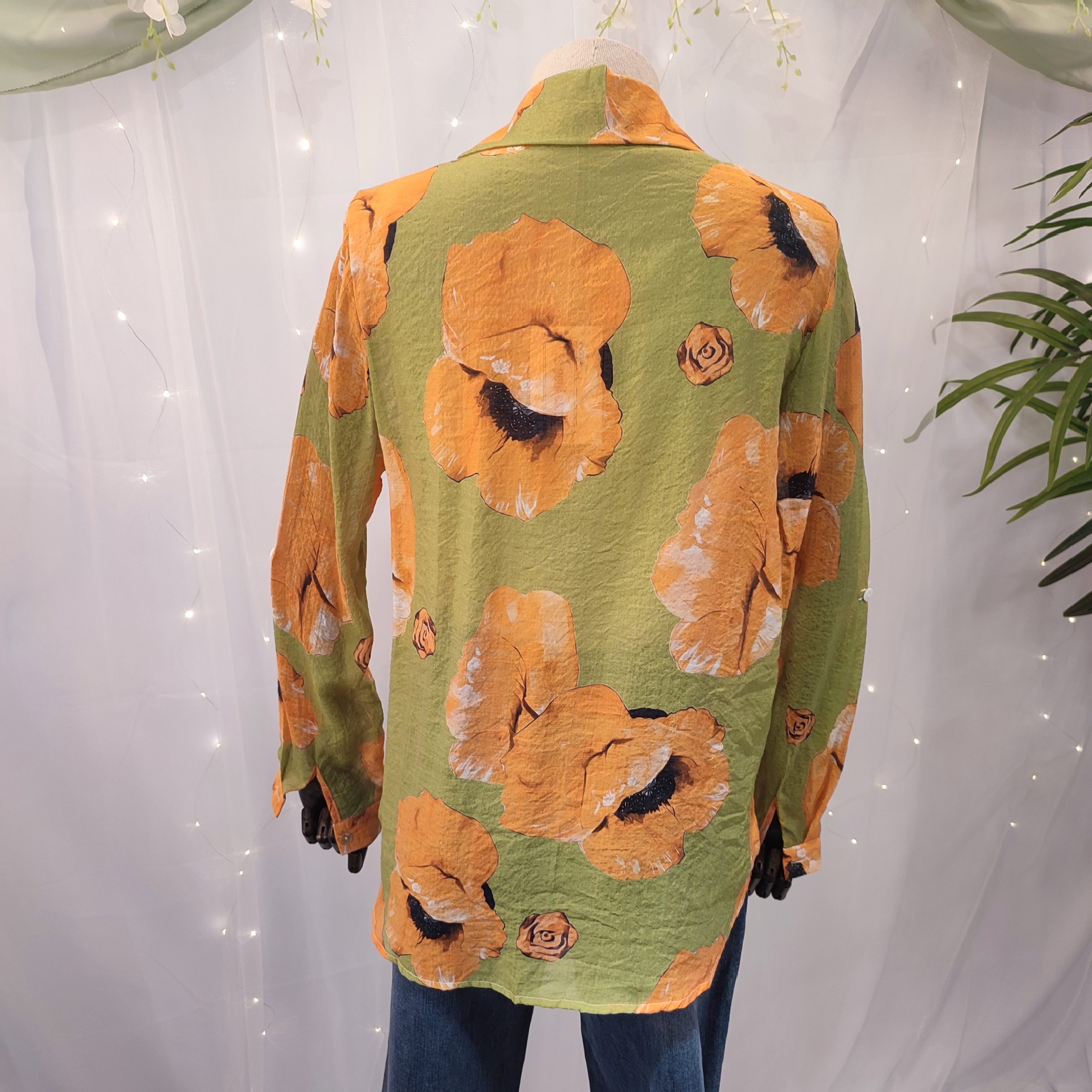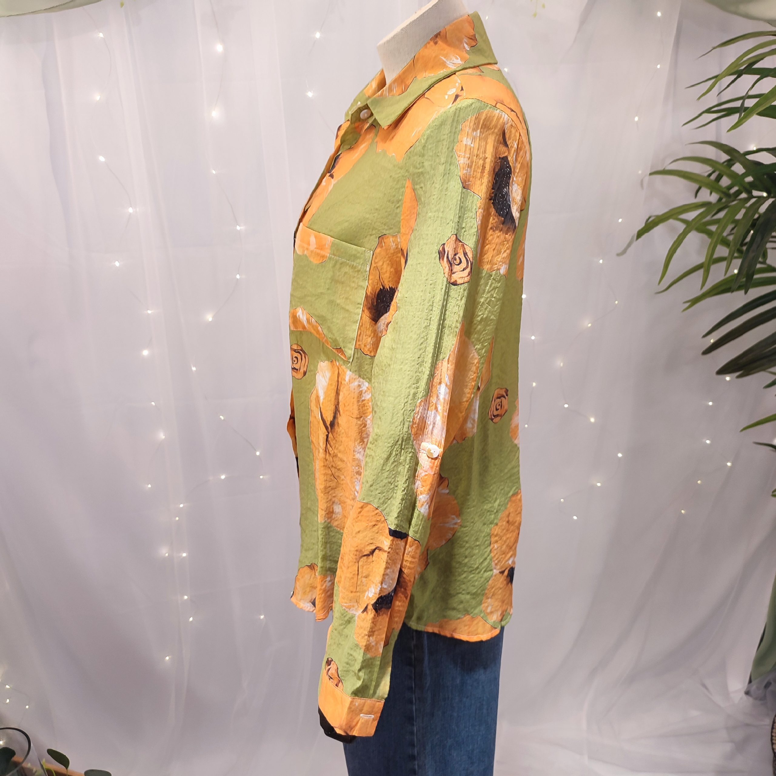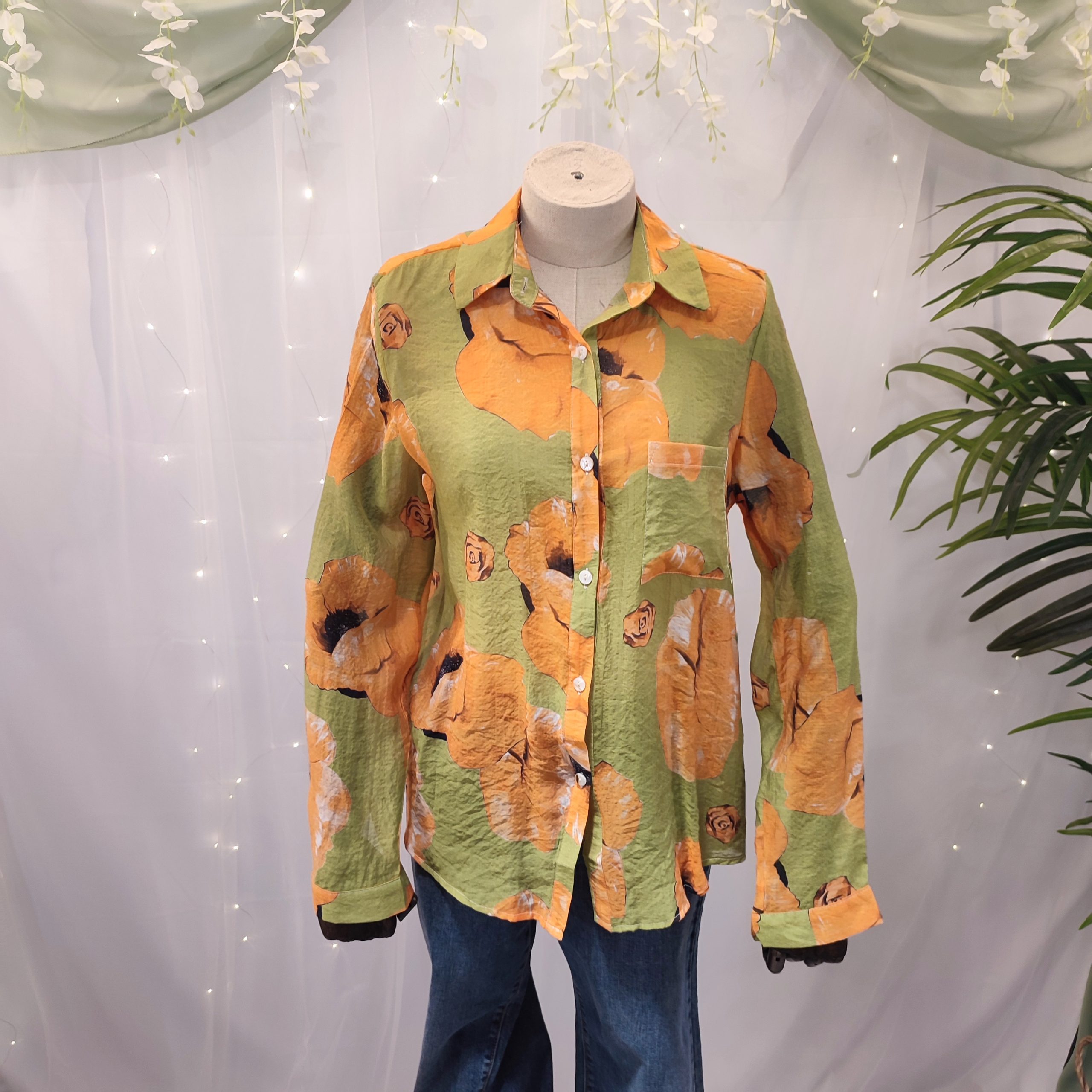 Ligera, fresca y con un toque natural. Esta camisa de mujer, confeccionada en rayón con textura tipo lino, es perfecta para los días cálidos gracias a su tejido transpirable y semitransparente. De color verde con un delicado estampado de flores, ofrece un estilo femenino y versátil.