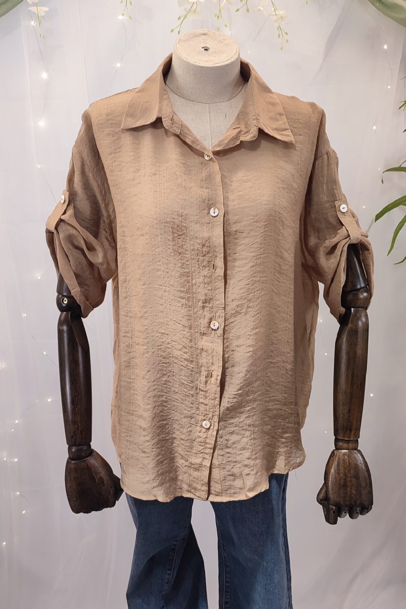 Su diseño de manga larga incluye un práctico botón a la altura del codo para arremangarla fácilmente y convertirla en media manga. Cuenta con cuello clásico, una discreta abertura frontal con seis botones y un bolsillo superior en el lado izquierdo del pecho, que aporta un detalle funcional y estilizado.