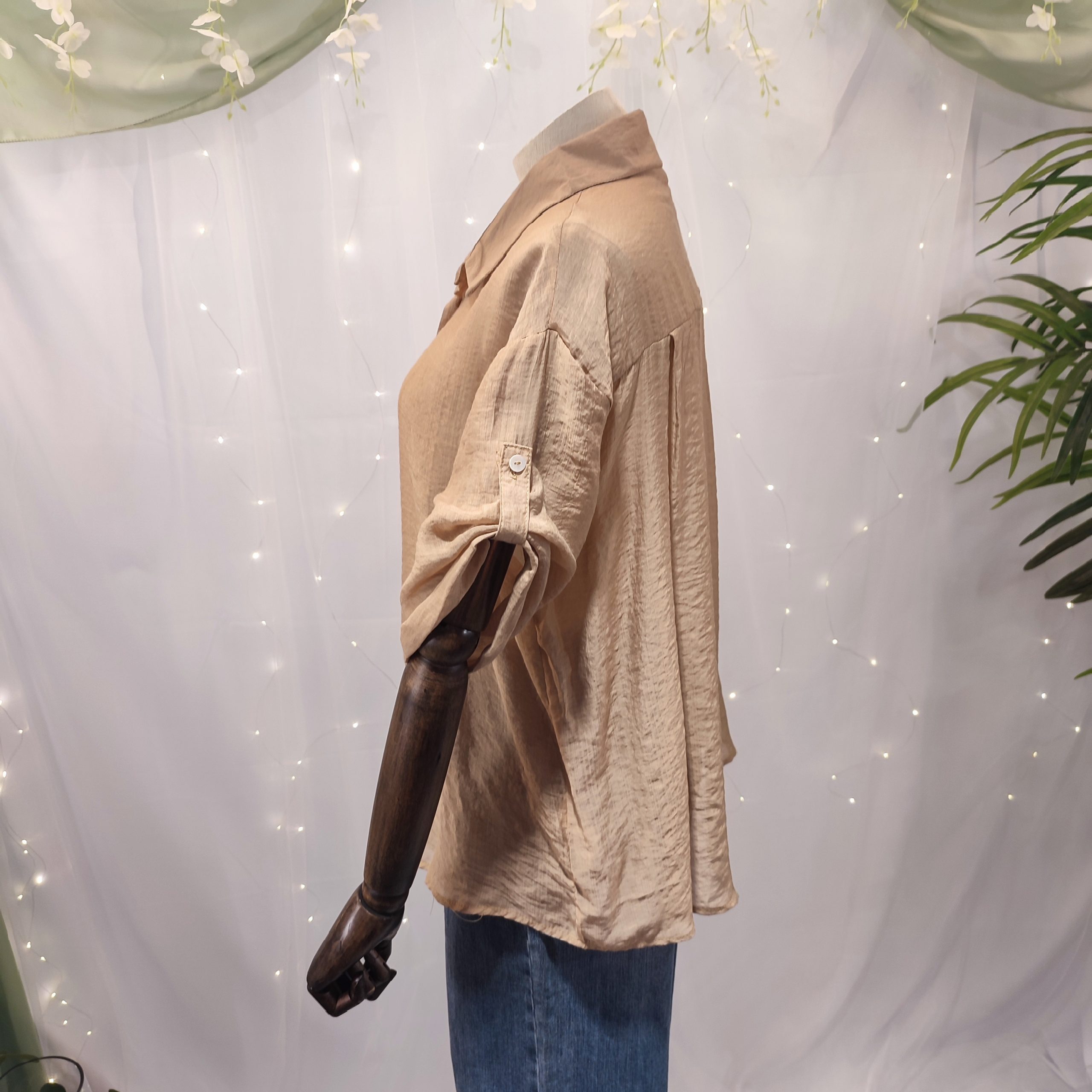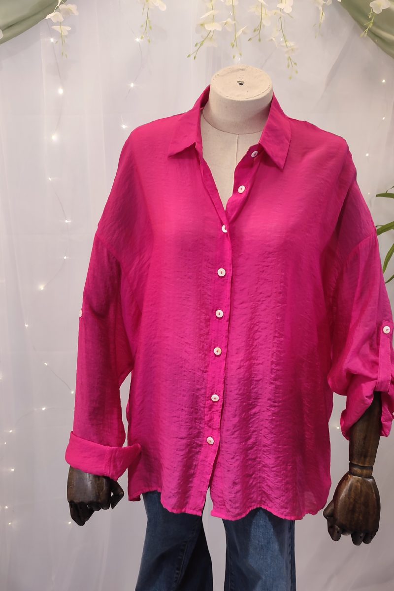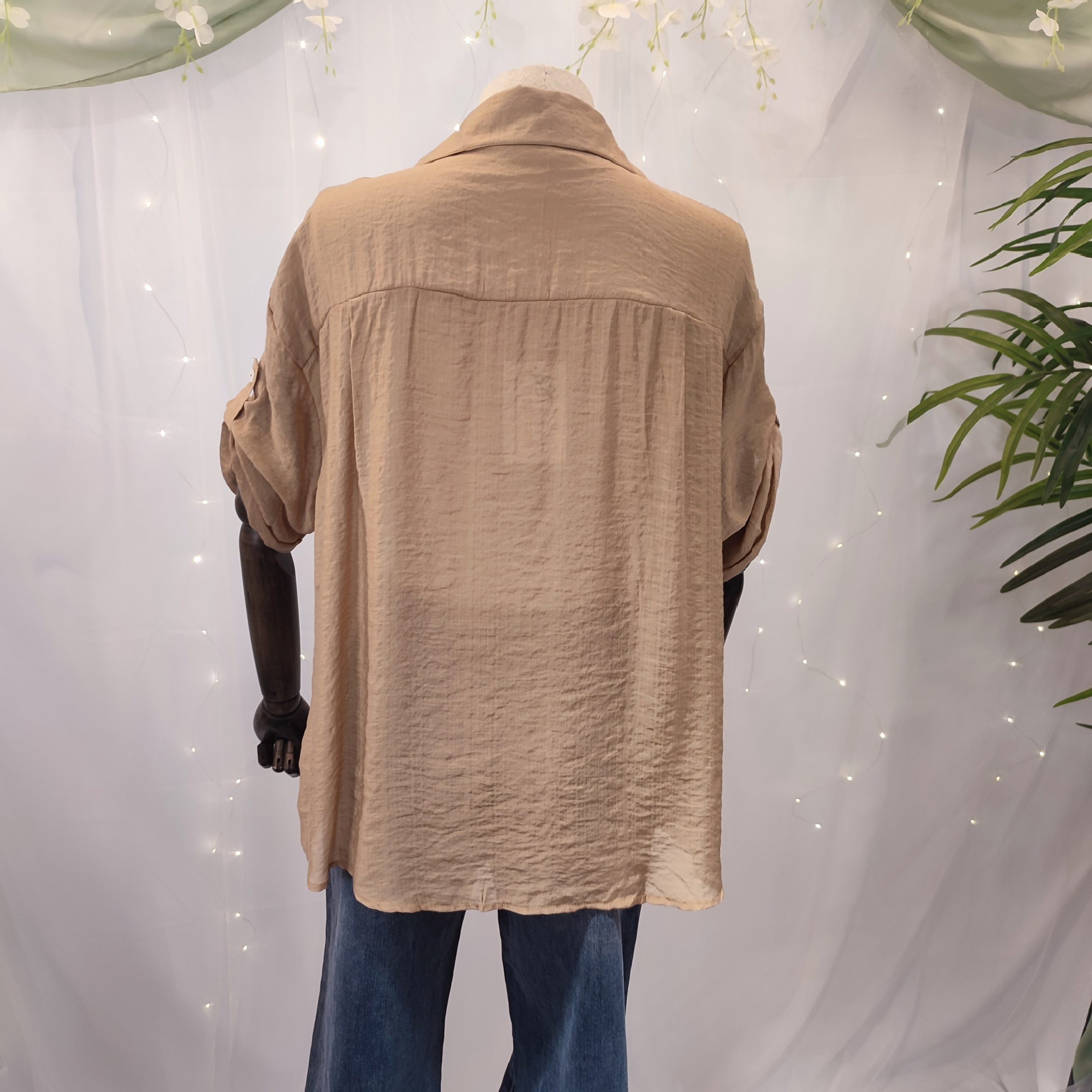 Las mangas largas incluyen una trabilla con botón que permite recogerse a media manga, ideal para adaptar la camisa al clima y al ritmo de tu día a día. Su estilo sencillo pero sofisticado la convierte en una prenda imprescindible en cualquier armario.