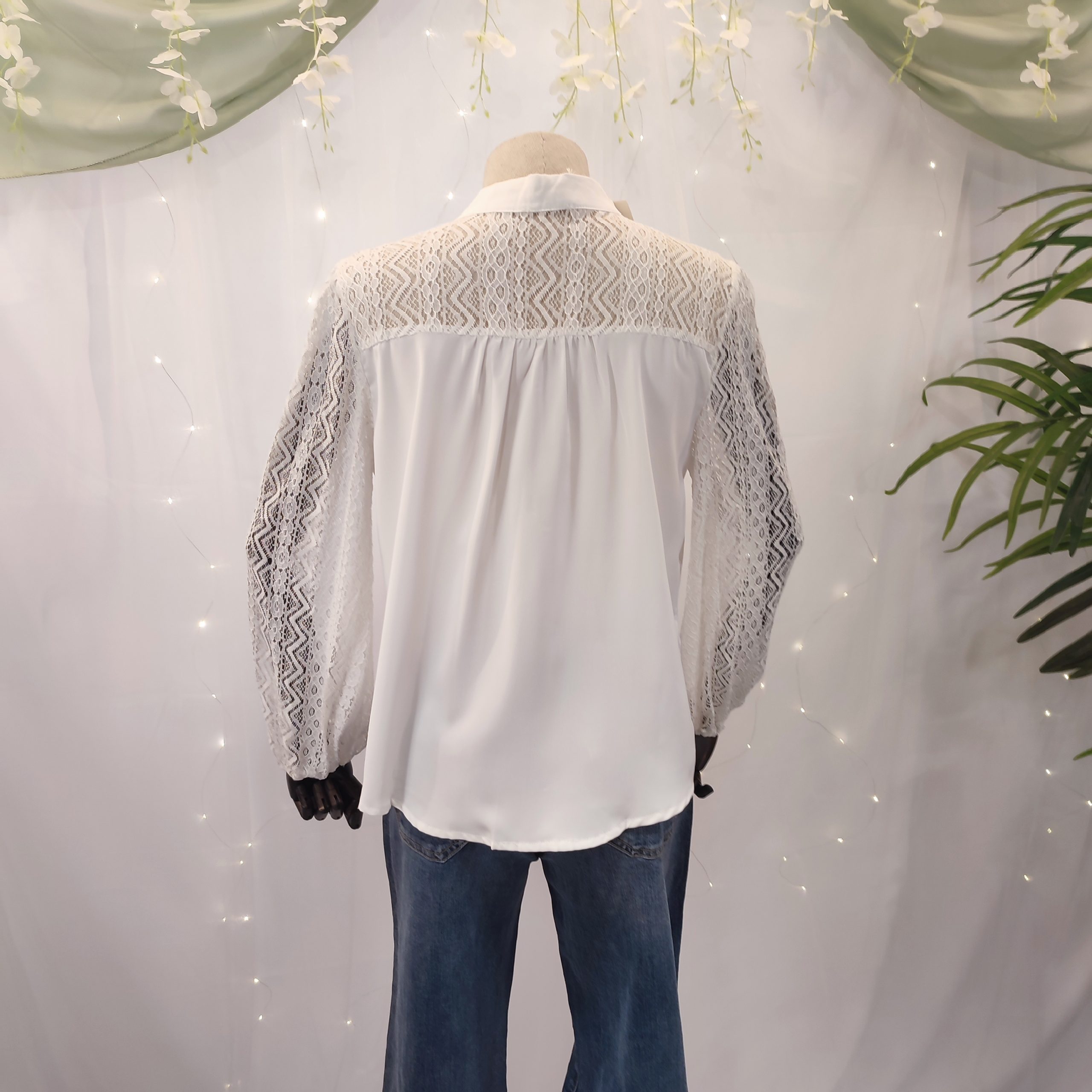 Con manga larga y botones frontales, su diseño liso se realza gracias a un elegante calado en las mangas y en la parte superior de la espalda, que aporta un aire sensual y ligero, ideal para climas cálidos y entornos costeros como las Islas Baleares. Esta transparencia sutil la convierte en una prenda sexy sin perder la clase.