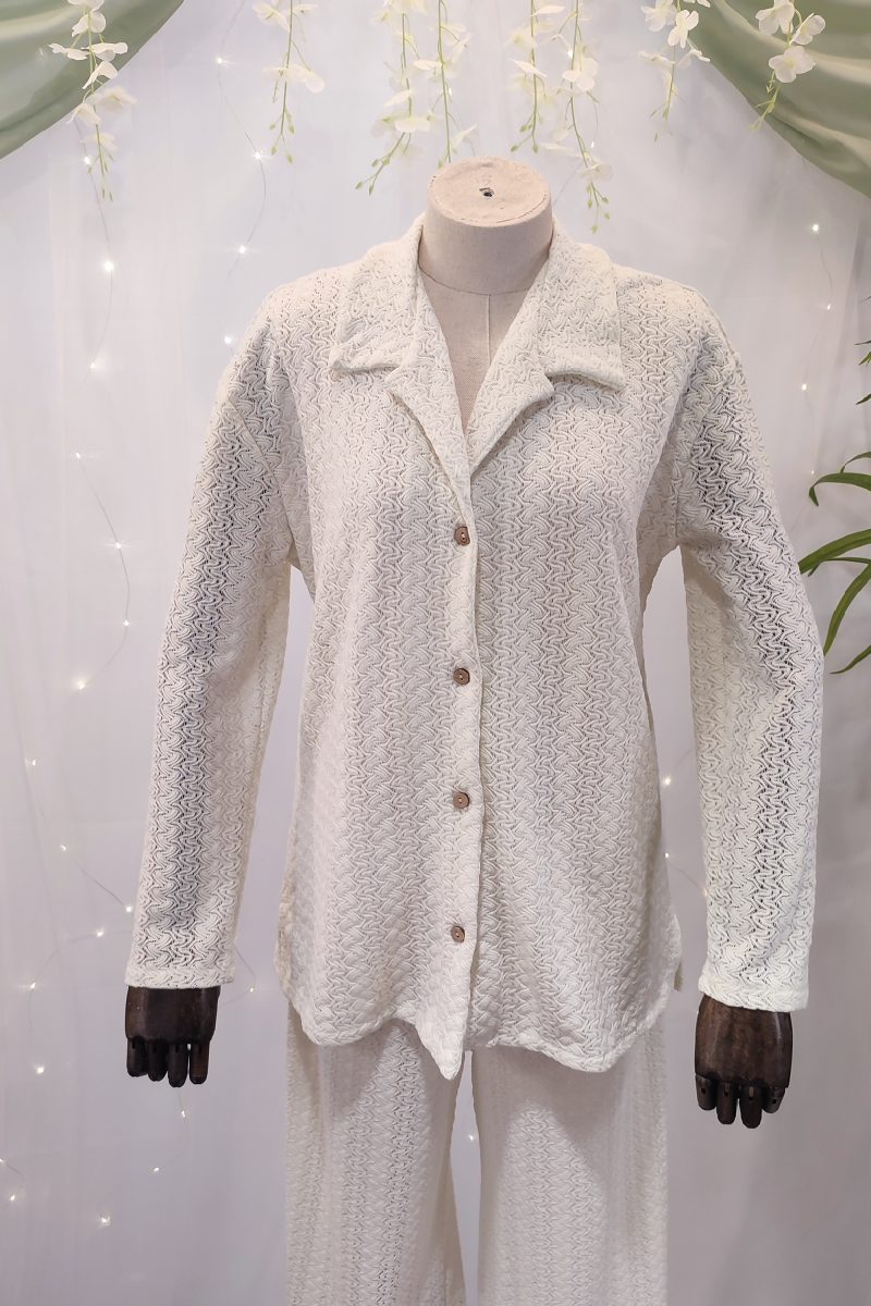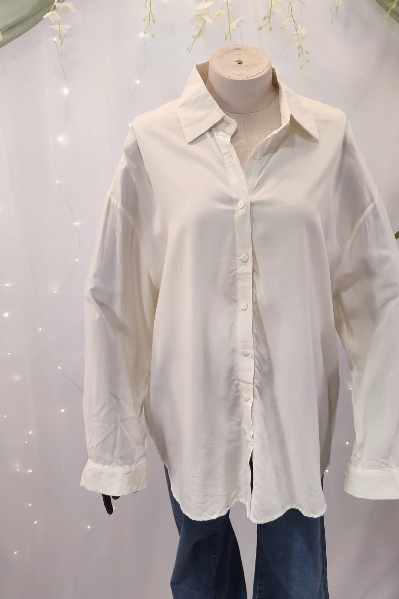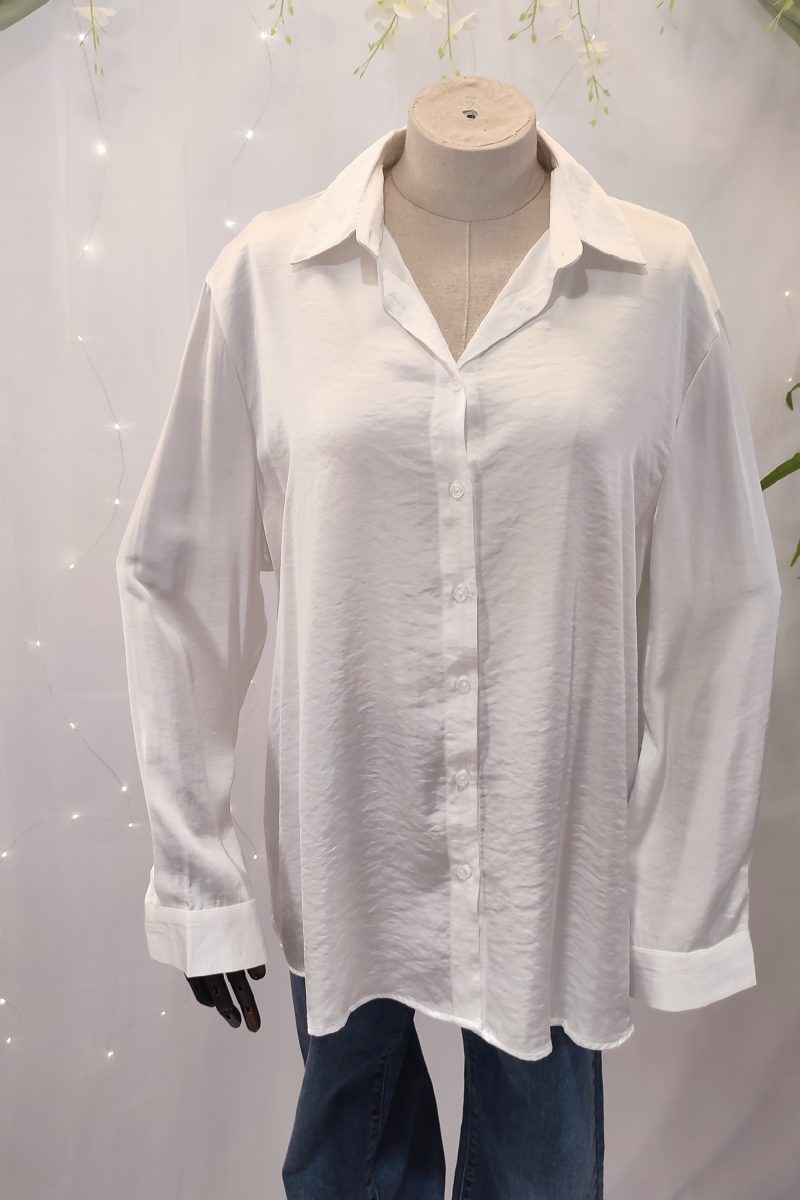 Con un cuello clásico y cierre frontal de 7 botones, esta camisa ofrece una silueta fluida y cómoda. El corte asimétrico, más largo en la parte trasera, añade movimiento y un aire moderno, ideal para llevar por fuera o por dentro del pantalón según tu estilo.