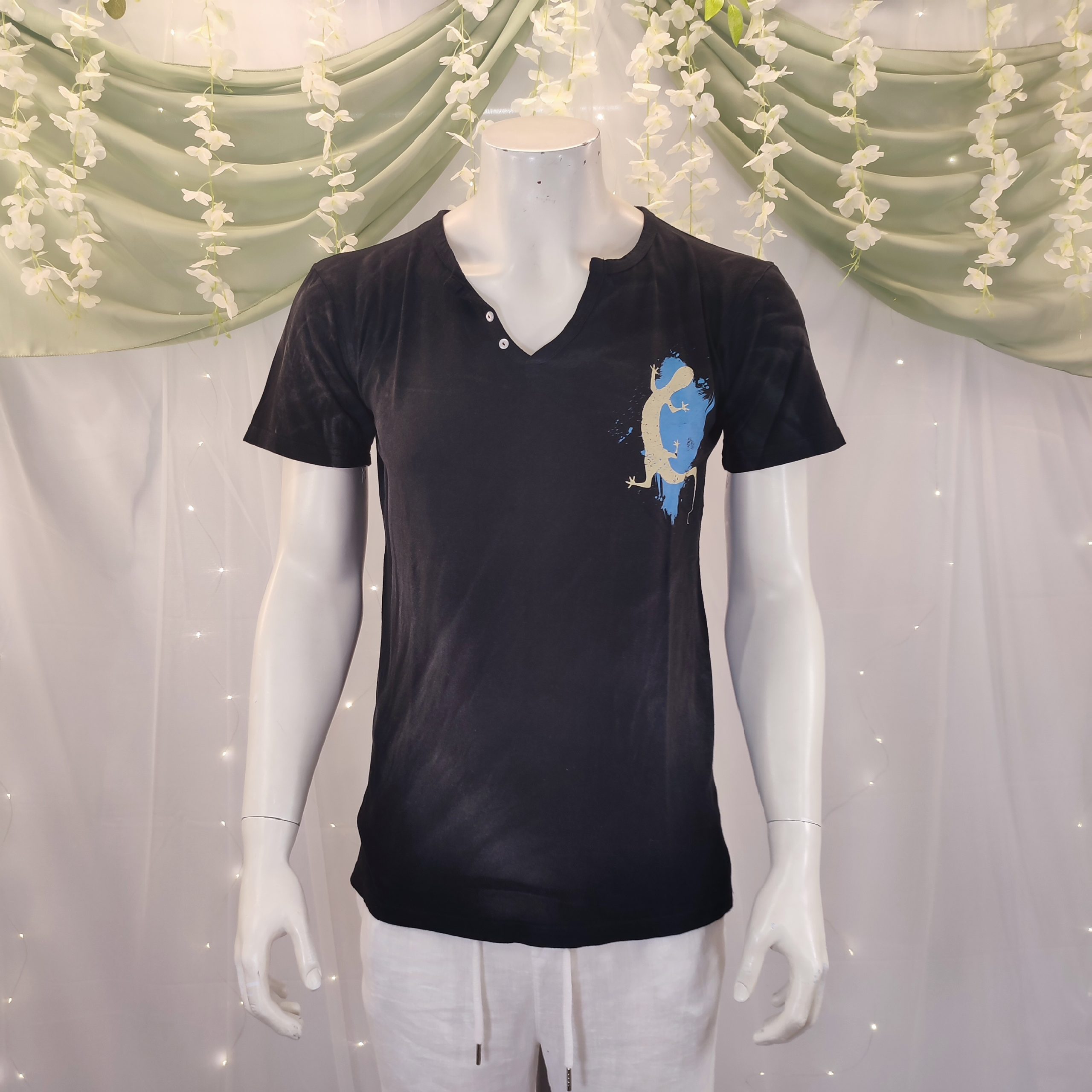 El detalle que hace que esta camiseta sea aún más especial es su estampado de lagarto, una figura emblemática y representativa de Mallorca y las Islas Baleares, que aporta un toque auténtico y distintivo. Esta prenda no solo refleja el espíritu local, sino que también se convierte en una pieza versátil y de calidad, perfecta para quienes buscan un estilo auténtico y lleno de historia.