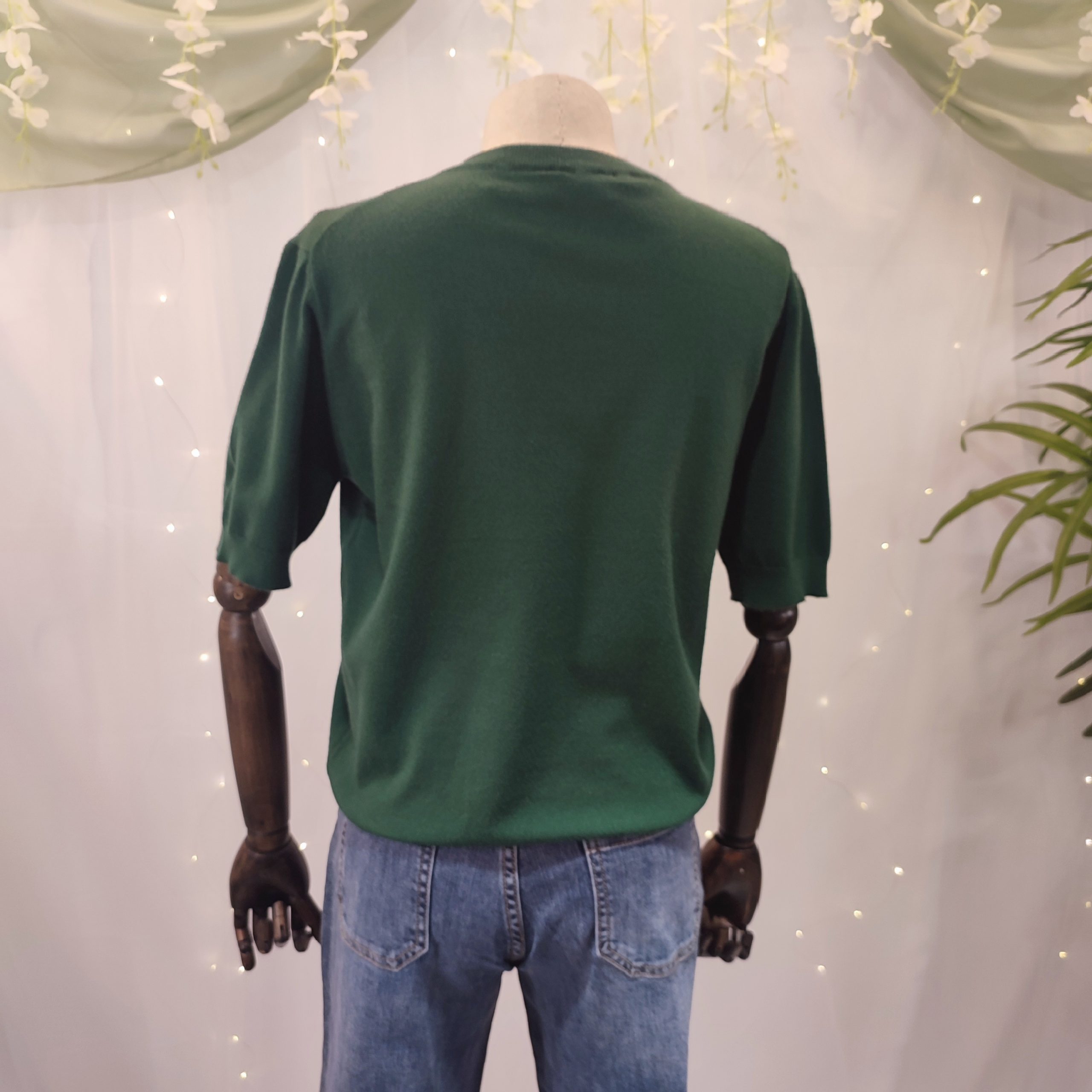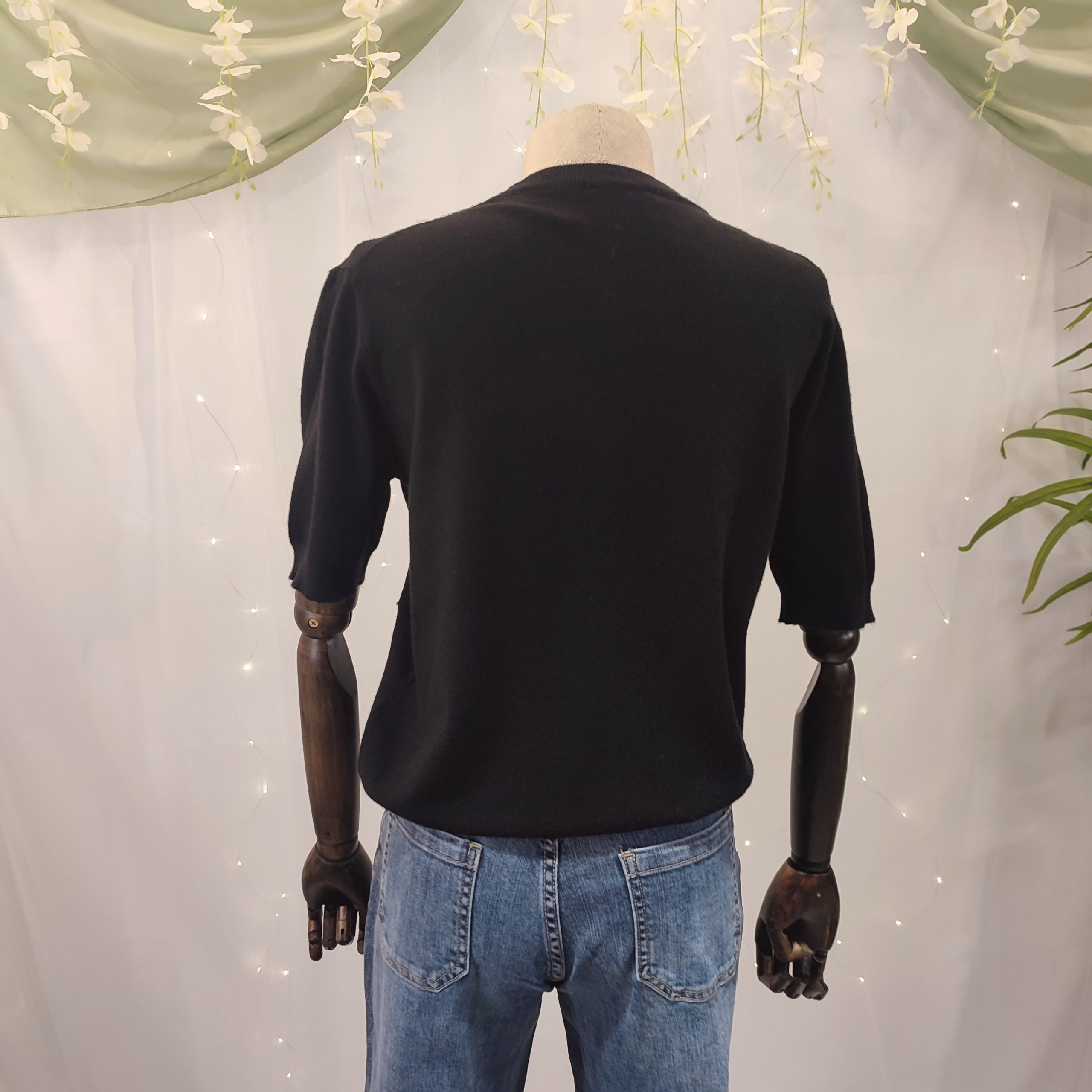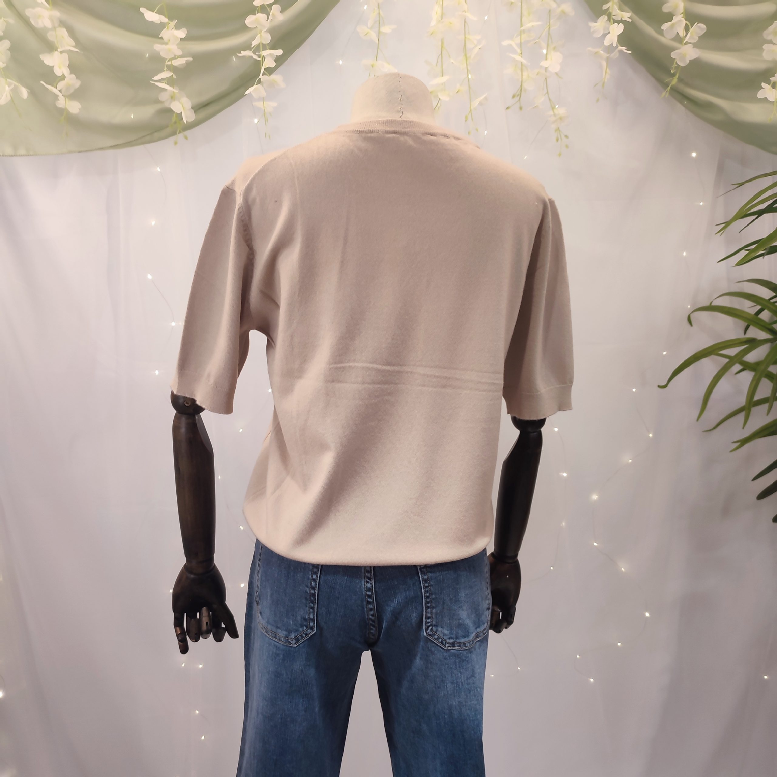 El cuello redondo está enmarcado por una cenefa decorativa con líneas verticales que aporta textura visual y realza un bordado único, sutil pero elegante, que eleva la prenda con un toque distintivo. Este pequeño detalle transforma una camiseta básica en una pieza especial, ideal para quienes aprecian los acabados diferentes.