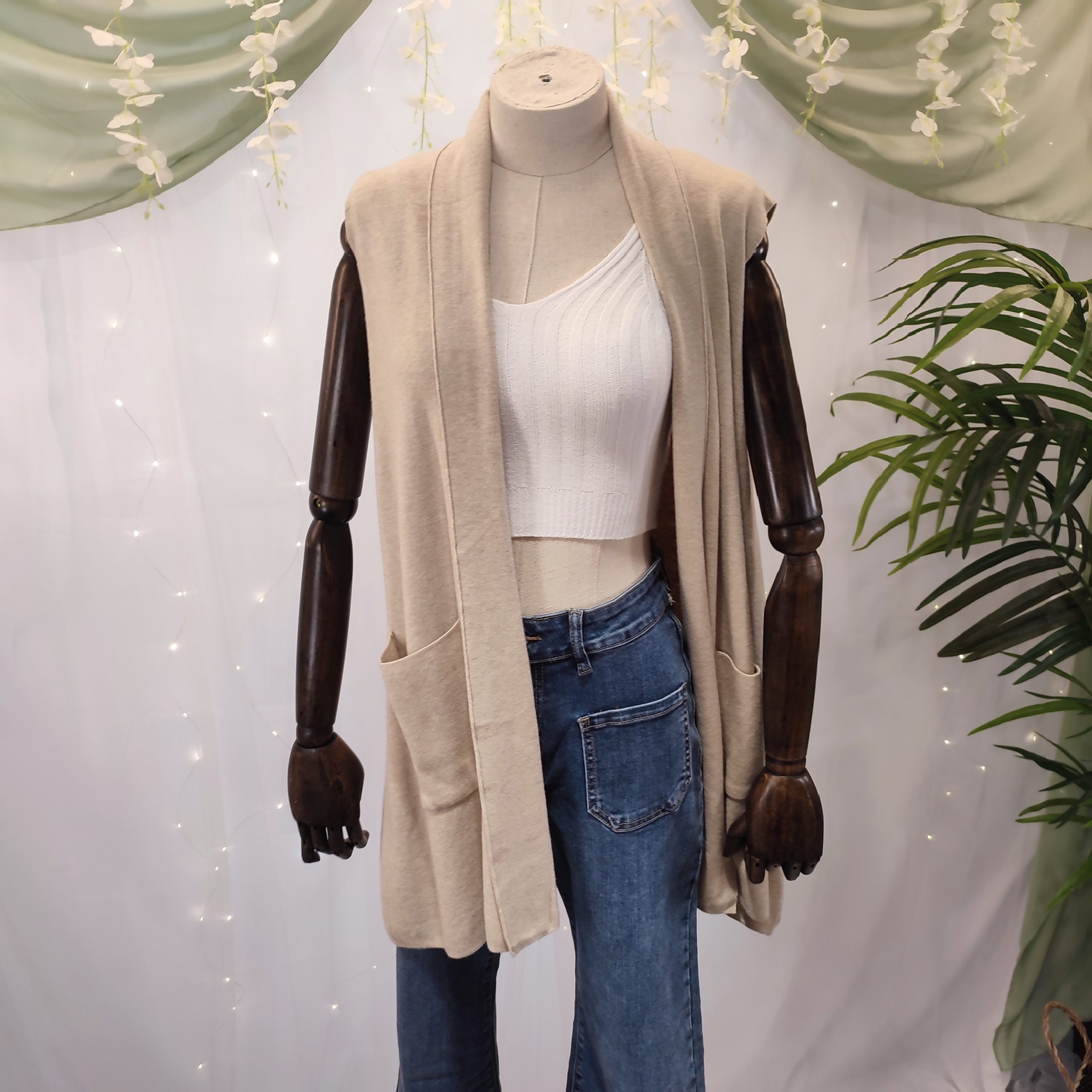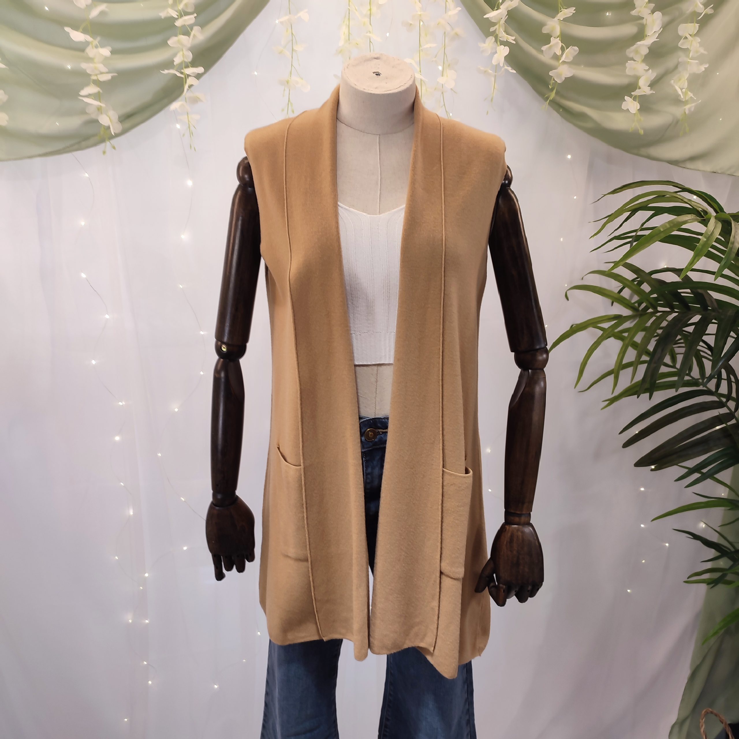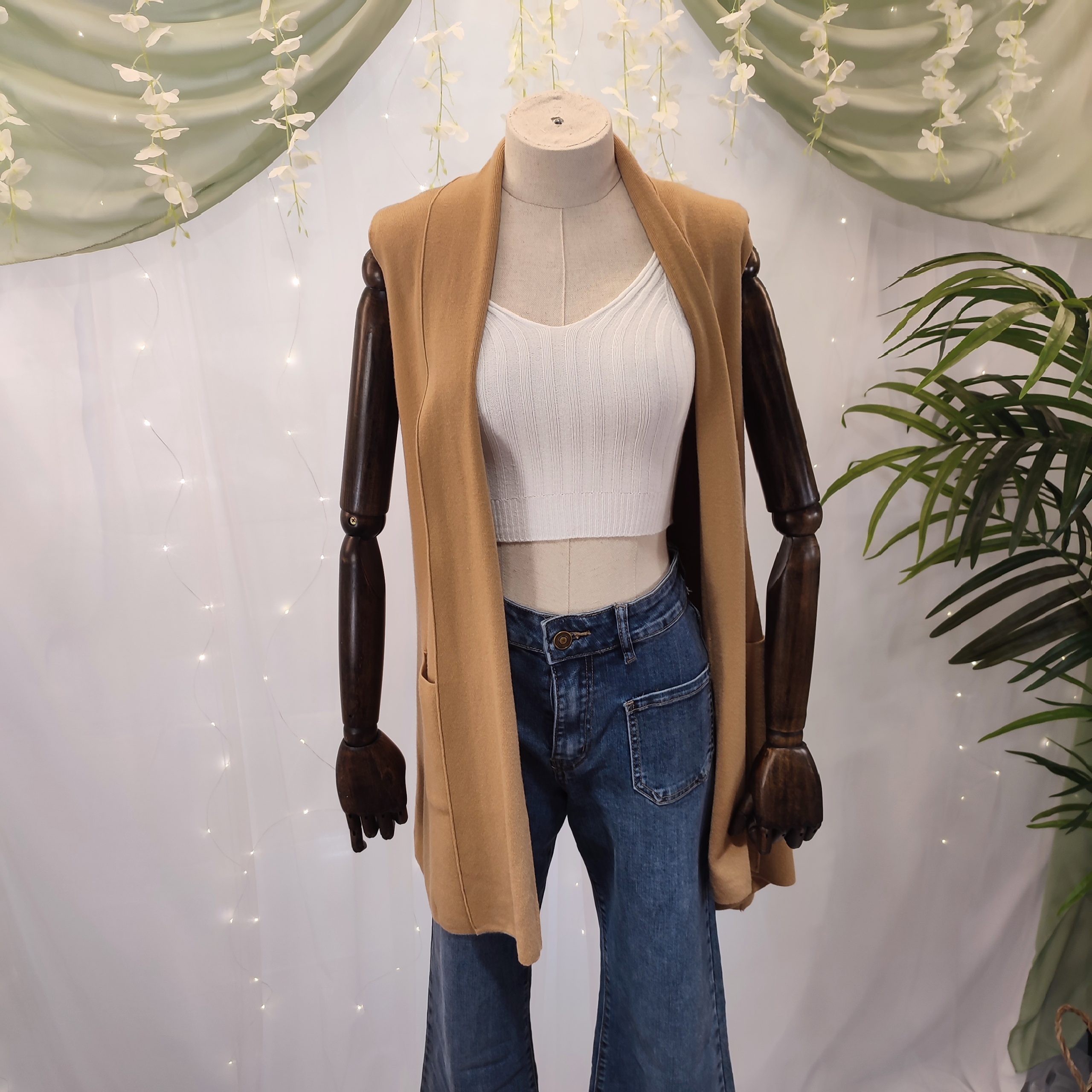 Este chaleco largo para mujer en tonos beige y camel es la prenda ideal para quienes buscan estilo, comodidad y versatilidad en sus looks de entretiempo. Su diseño bicolor y de corte recto hasta la altura de las rodillas aporta una silueta estilizada y sofisticada, perfecta para elevar cualquier conjunto con un toque moderno y natural.