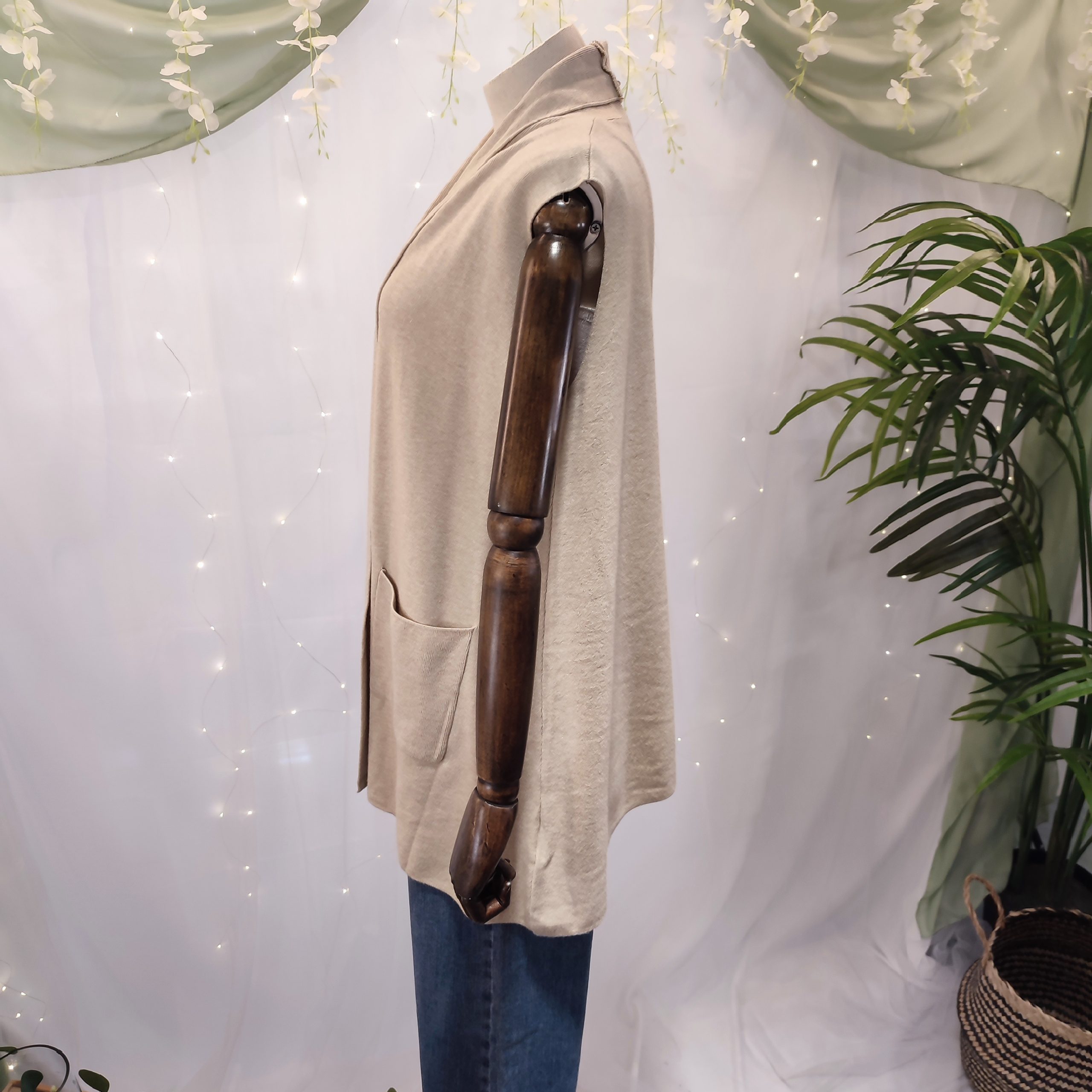 Confeccionado en un tejido ligero y agradable, este chaleco no se cierra, lo que lo convierte en una opción abierta y fluida, muy fácil de combinar. Su diseño incluye una solapa amplia, doblada con la misma tela, que cae de forma relajada y se integra a lo largo de la prenda, aportando un extra de movimiento y textura sin romper su estética minimalista.