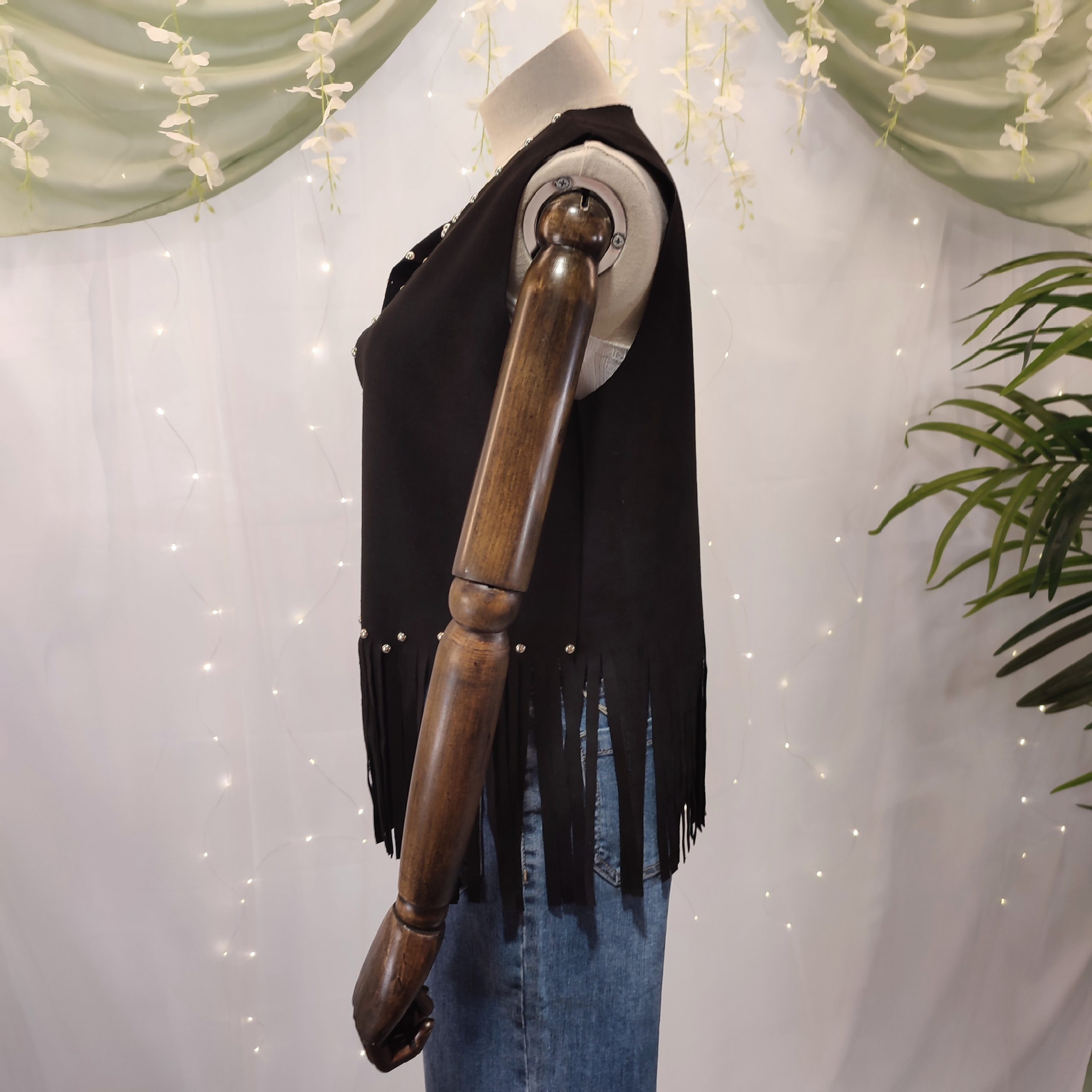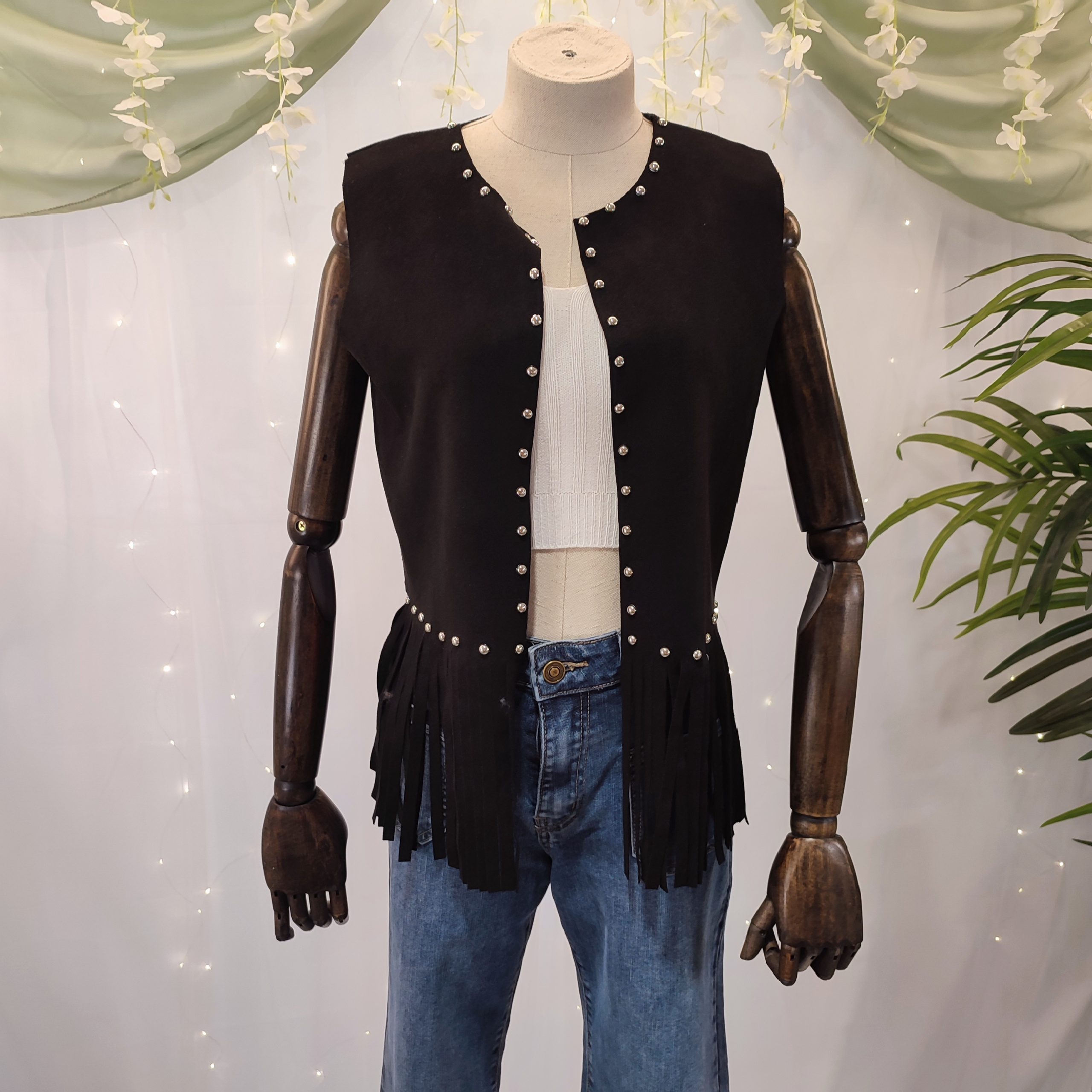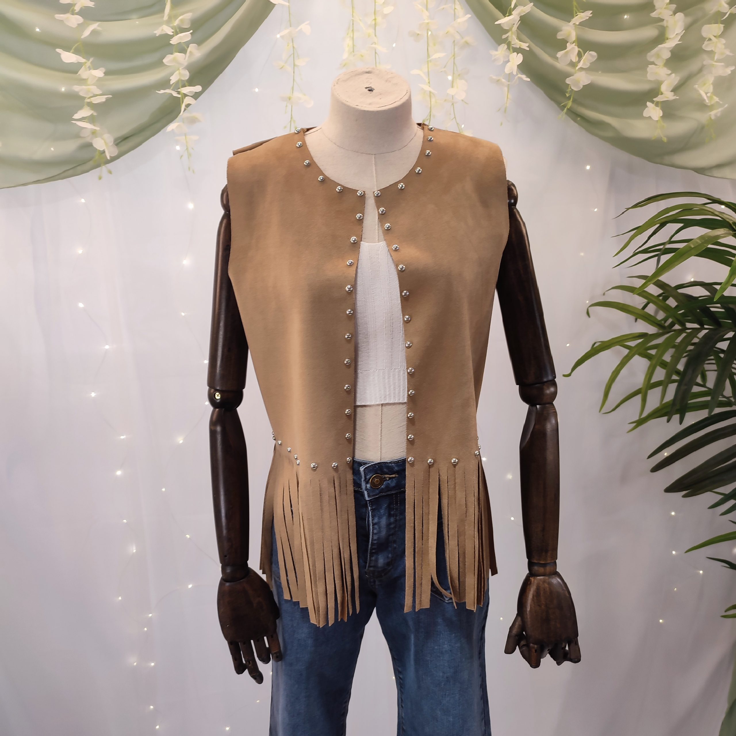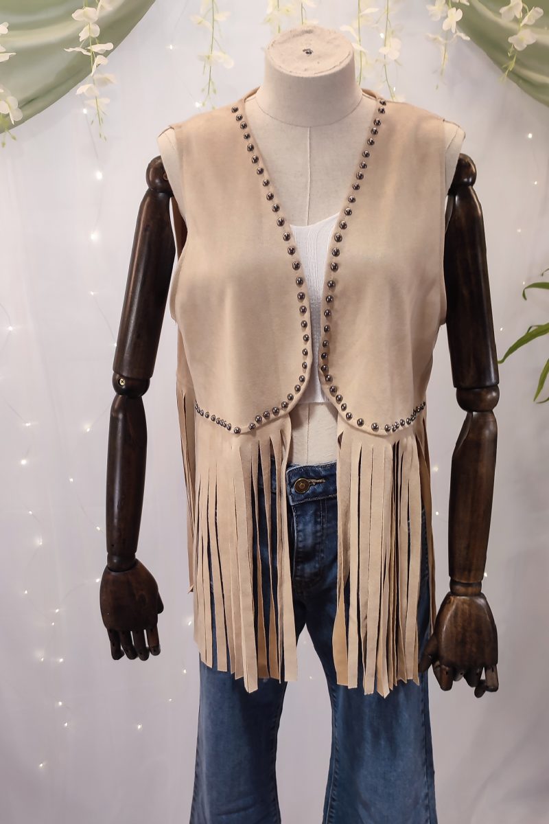 Este chaleco no se cierra, lo que lo convierte en una prenda abierta perfecta para superponer sobre tops, camisetas o camisas, dando un aire relajado pero con mucho estilo. Todo el contorno del cuello y los bordes delanteros está adornado con pequeños broches metálicos en color plata, que aportan un toque brillante y auténtico, inspirado en los clásicos atuendos del viejo oeste.