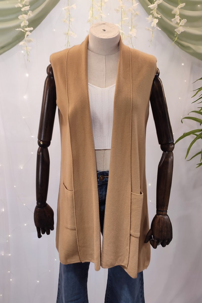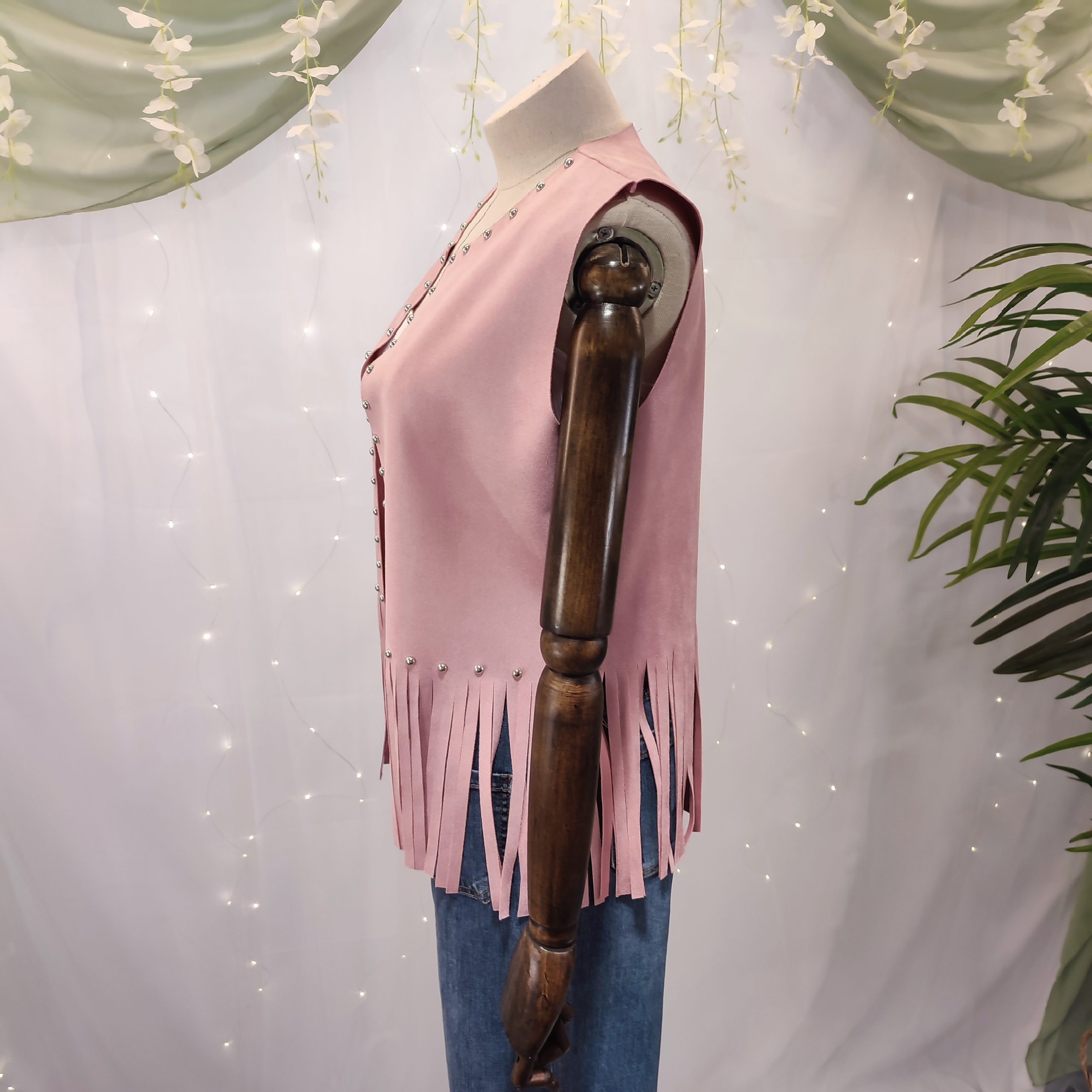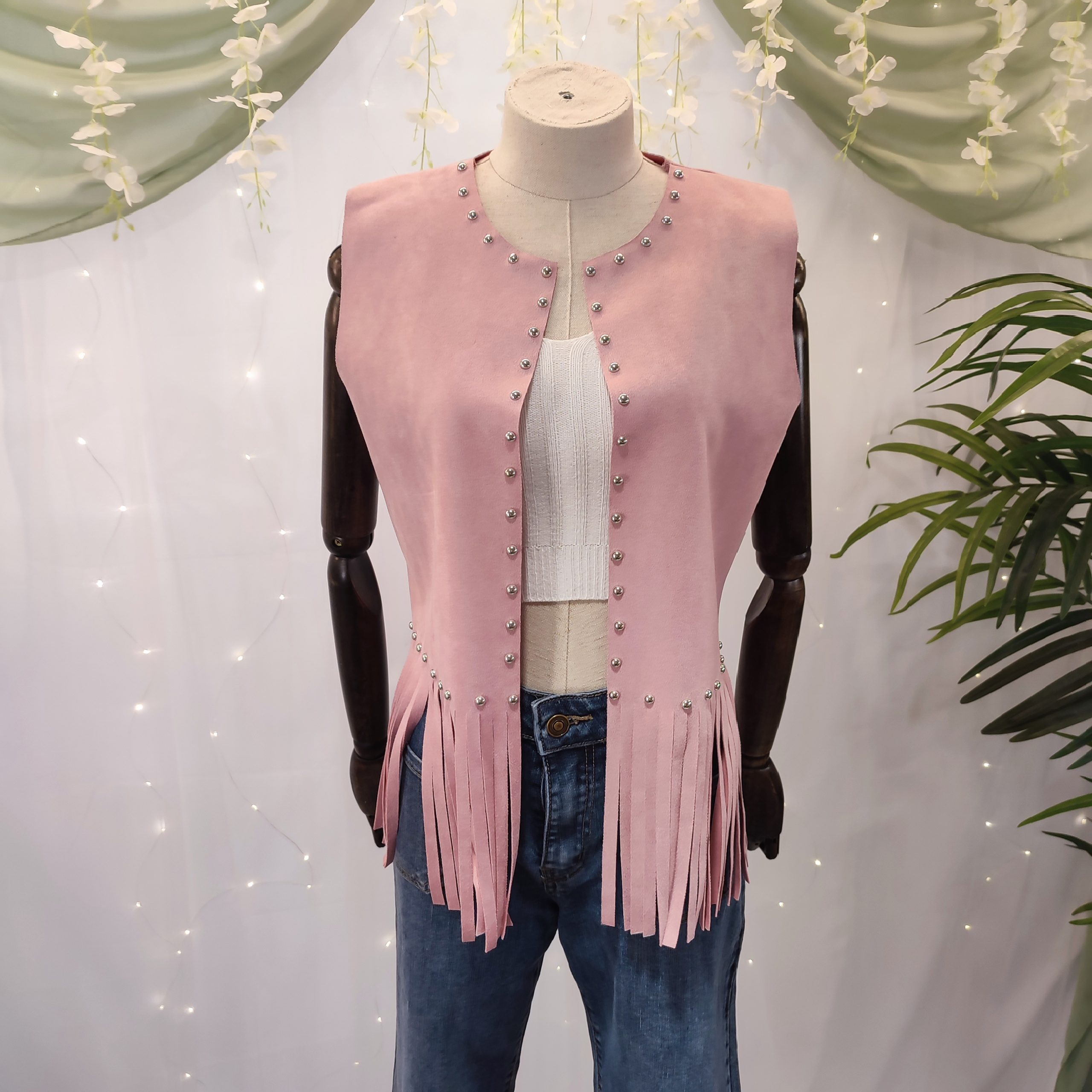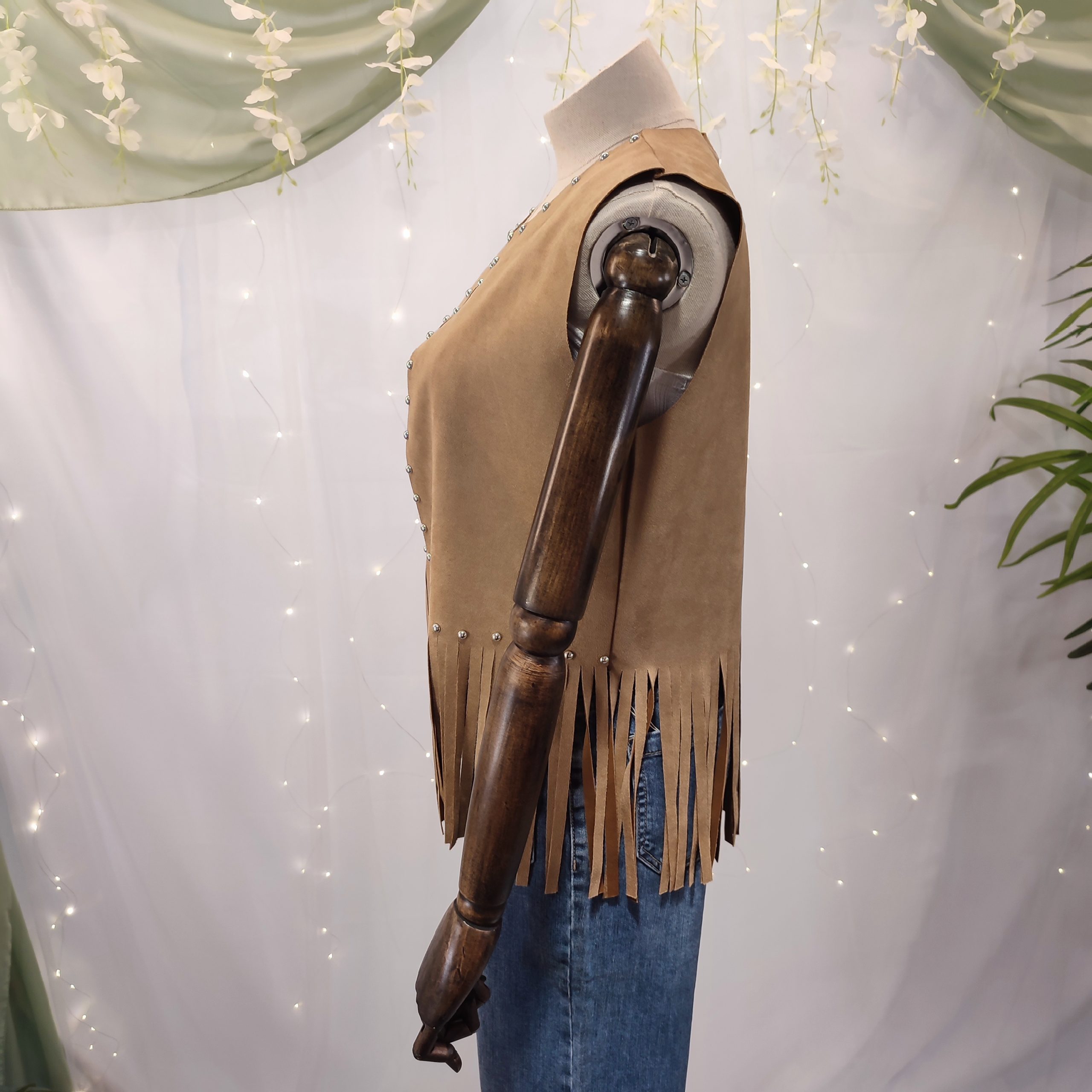 Este chaleco no se cierra, lo que lo convierte en una prenda abierta perfecta para superponer sobre tops, camisetas o camisas, dando un aire relajado pero con mucho estilo. Todo el contorno del cuello y los bordes delanteros está adornado con pequeños broches metálicos en color plata, que aportan un toque brillante y auténtico, inspirado en los clásicos atuendos del viejo oeste.