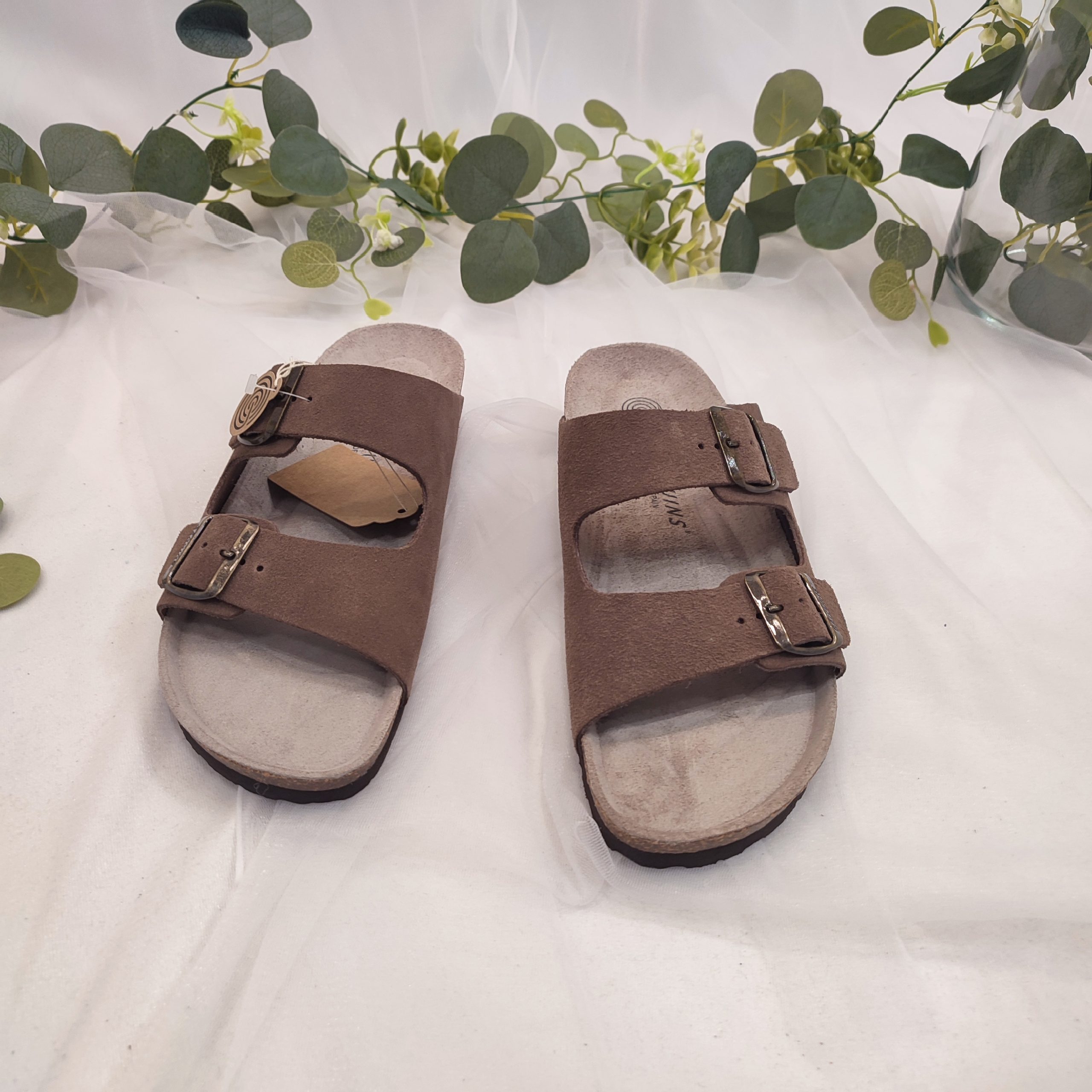 Sandalia marrón de piel con planta anatómica y tiras con hebillas ajustables. Piel certificada por proveedores del Leather Working Group (LWG) con estatus oro. Diseñado y fabricado en fábricas de Elche (España), bajo una producción sostenible y proveedores locales. El corte es de piel, la planta de corcho y foam y en el caso de la suela es de EVA. La plantilla anatómica ofrece soporte, reduce la presión, mejora la alineación y estabilización, disminuye la fatiga y previene lesiones, proporcionando confort y protección al caminar.