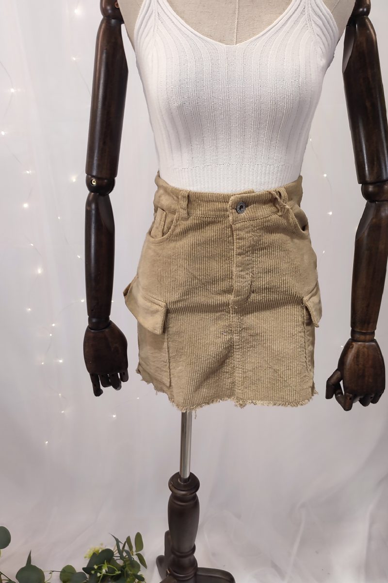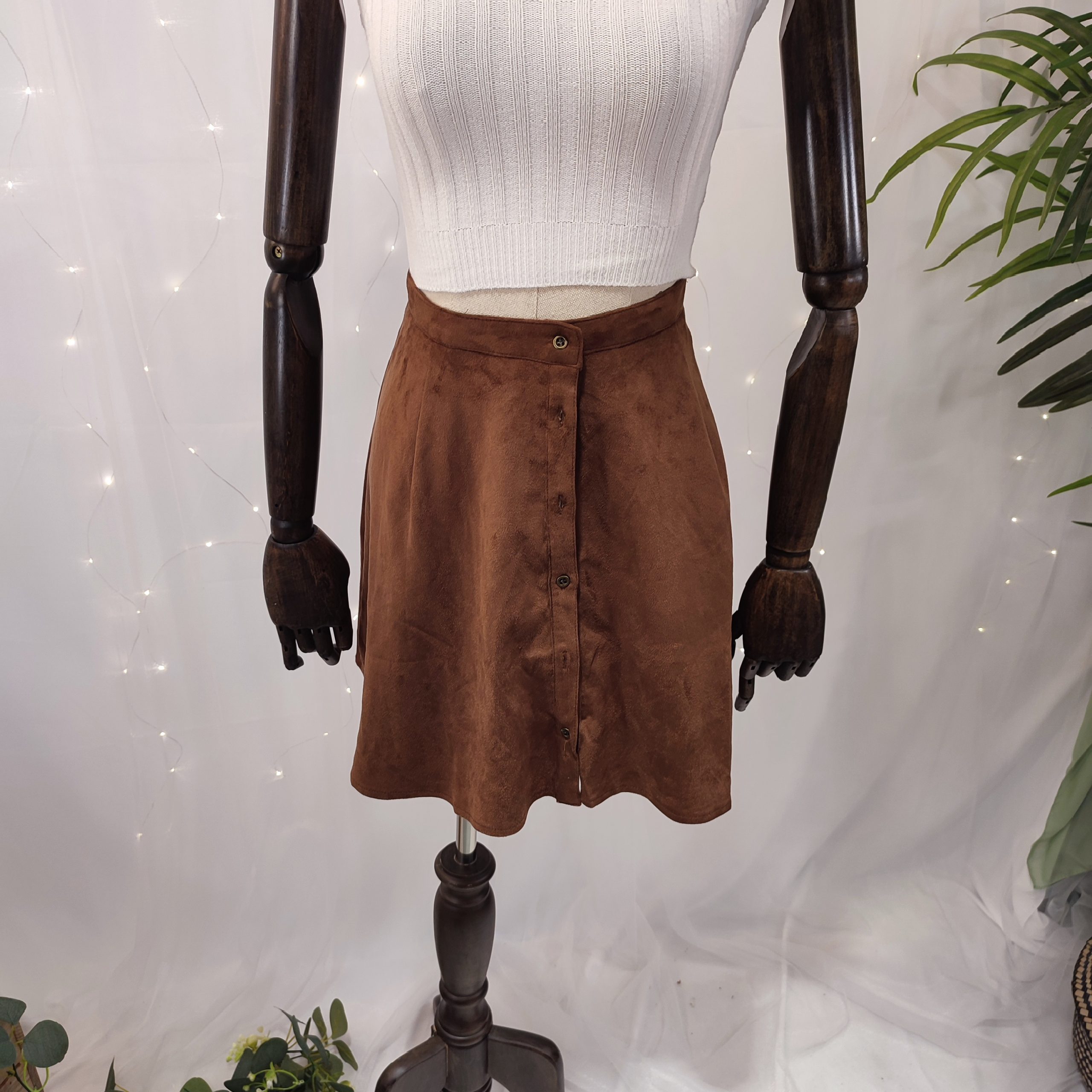 Esta falda destaca por su original textura tipo ante, que aporta calidez visual y un tacto suave, perfecto para los meses más frescos o para darle un giro chic a tus outfits de entretiempo. Su diseño incorpora una línea frontal de botones funcionales de arriba abajo, que no solo facilitan el cierre, sino que también se convierten en un detalle decorativo que aporta carácter y estilo.