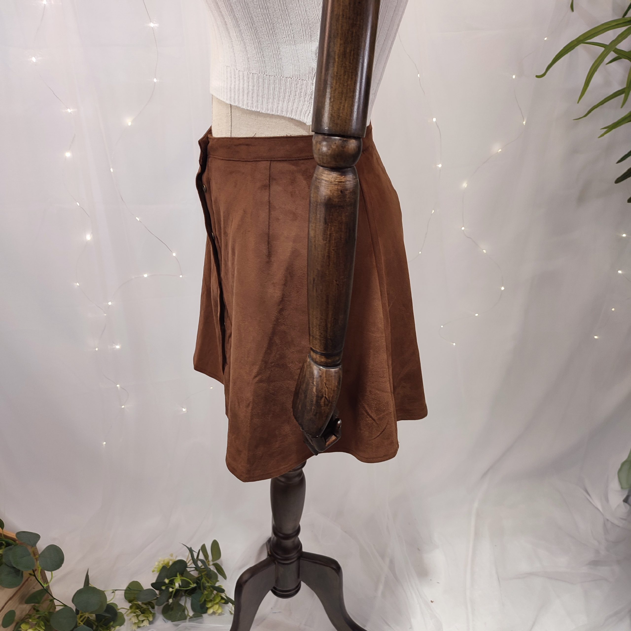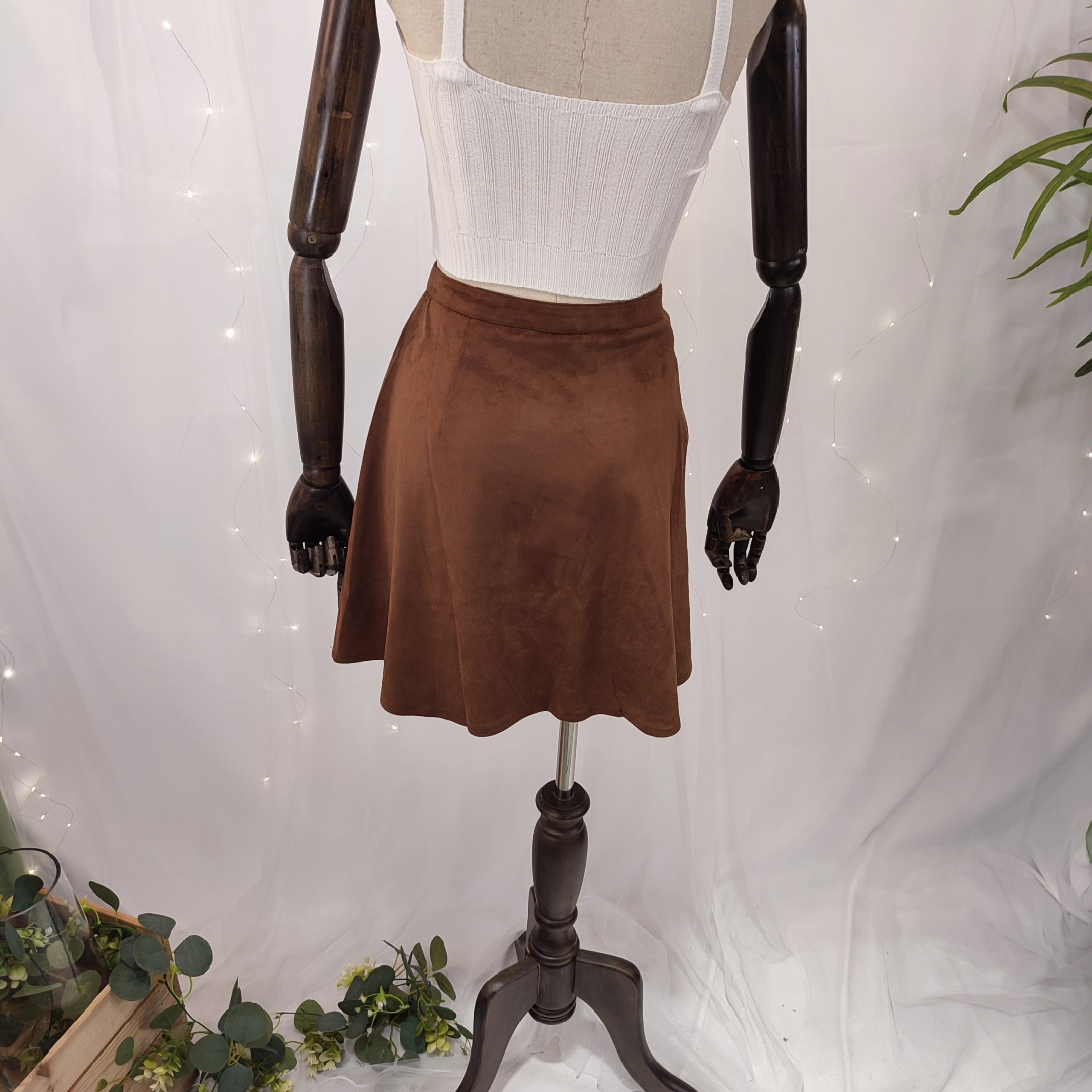 Añade un toque de sofisticación con aire rebelde a tu look con esta mini falda de mujer en polipiel con efecto ante, una prenda que combina la suavidad del acabado aterciopelado con el estilo estructurado y moderno del diseño en color marrón chocolate, profundo y muy combinable.