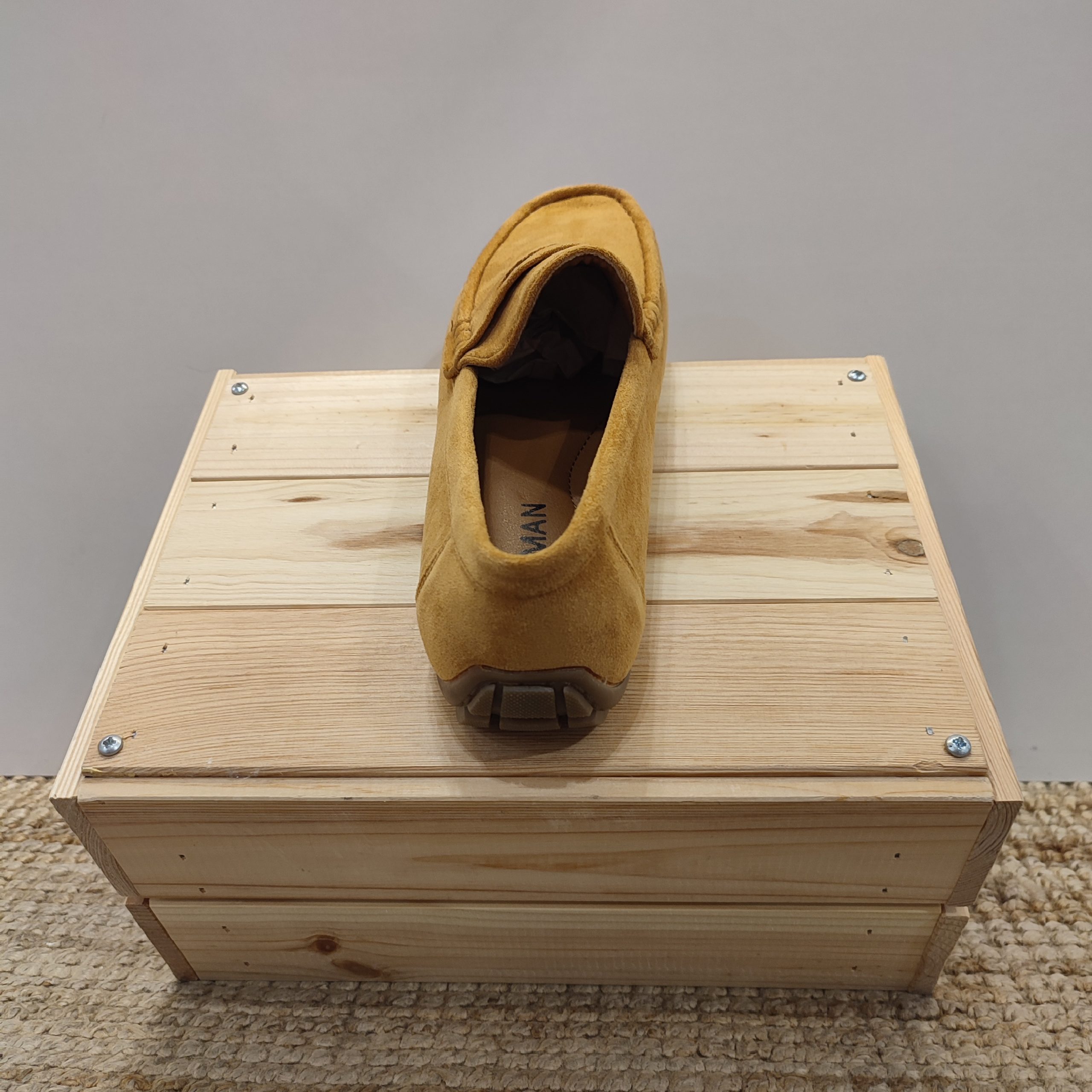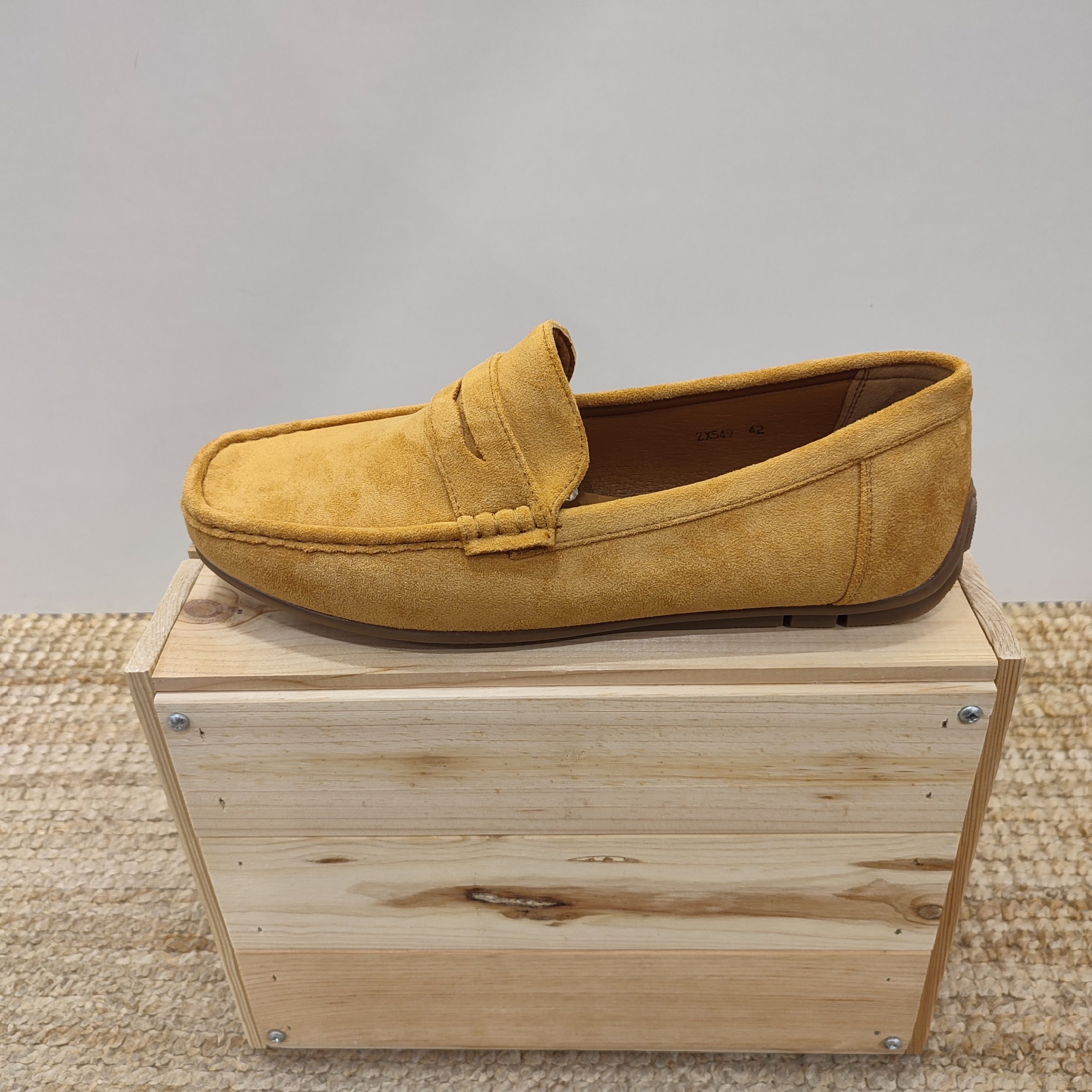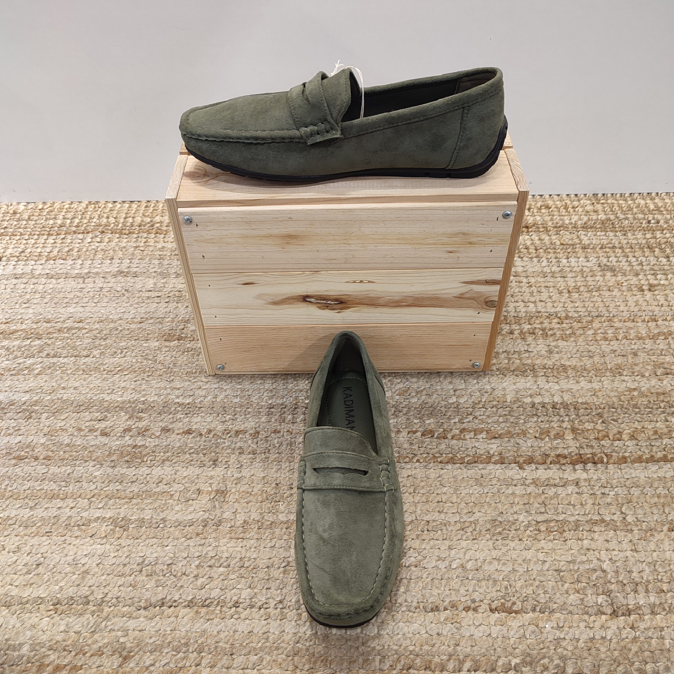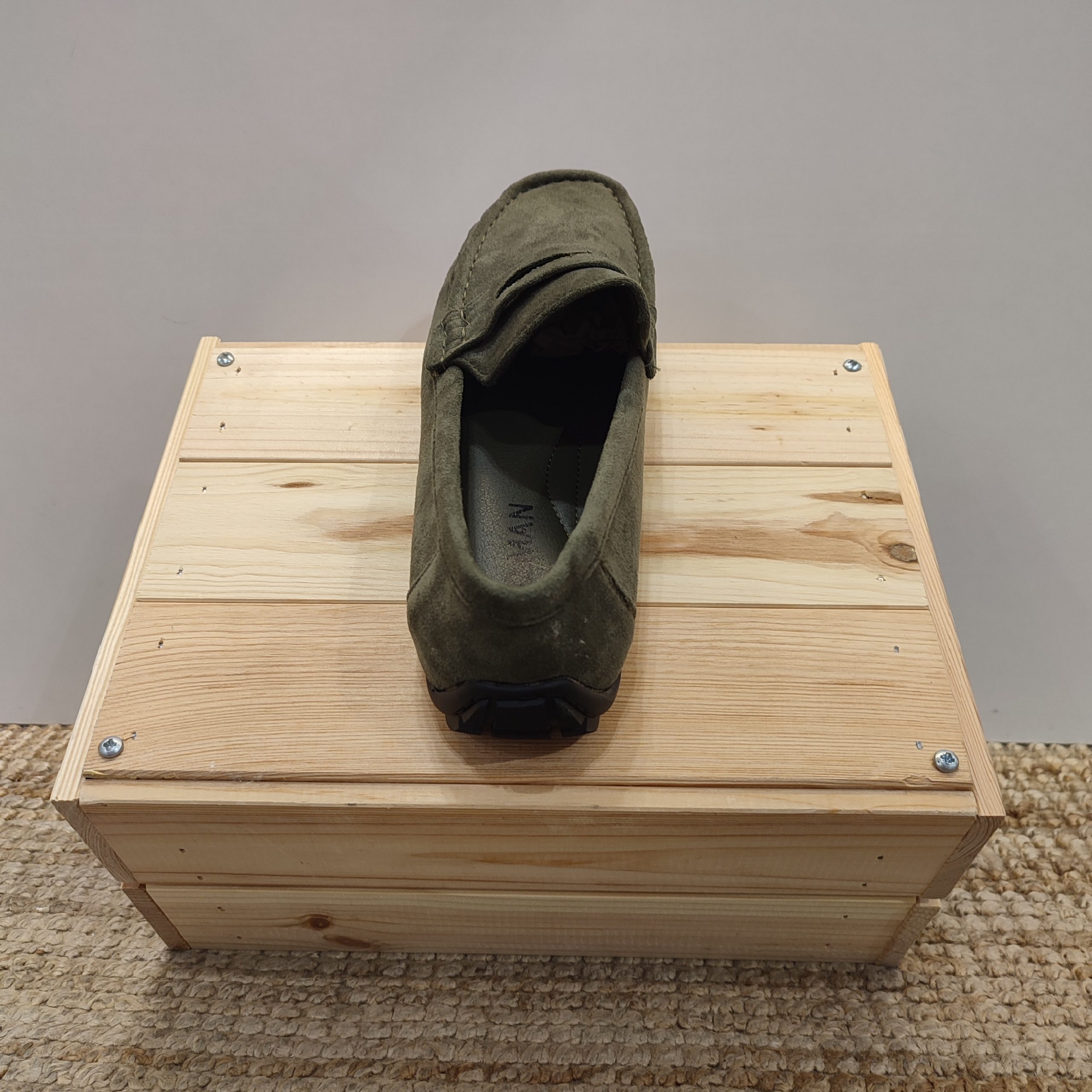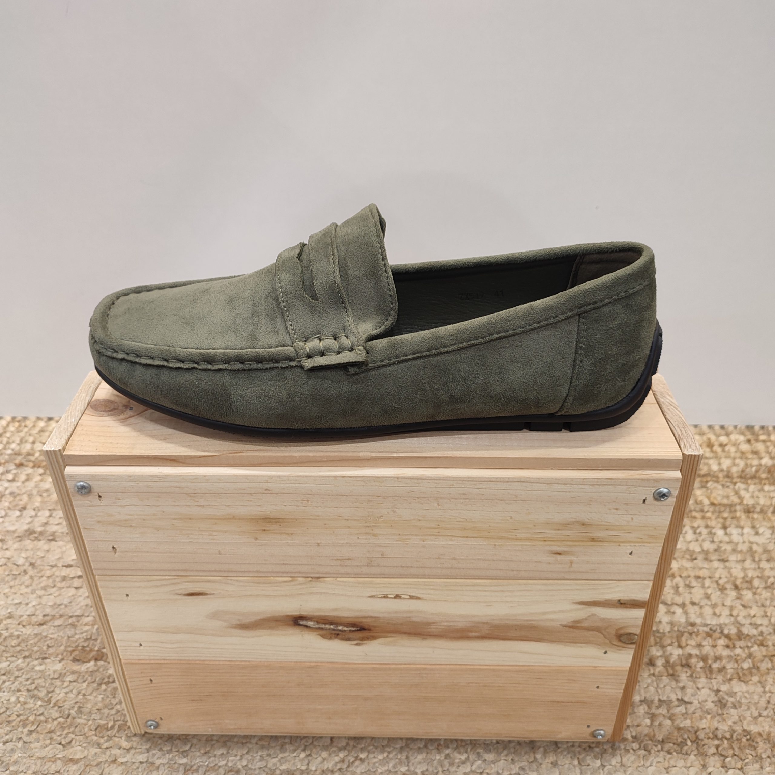 Mocasines clásicos de tejido ante. En la parte superior, zona del empeine del pie, contiene una pequeña lengüeta, del mismo ante que el calzado, simulando una hebilla decorativa. Se encuentra disponible en dos colores muy neutros y combinables como son el verde militar y el camel. La suela en esta ocasión es de goma y en su interior contiene una plantilla con una amortiguación exquisita, lo que hace de este calzado la pieza perfecta para el día a día de tus eventos más formales o incluso casual. Es perfecto para ponértelo con vaqueros pitillos, pantalón de pinza o incluso de lino.
