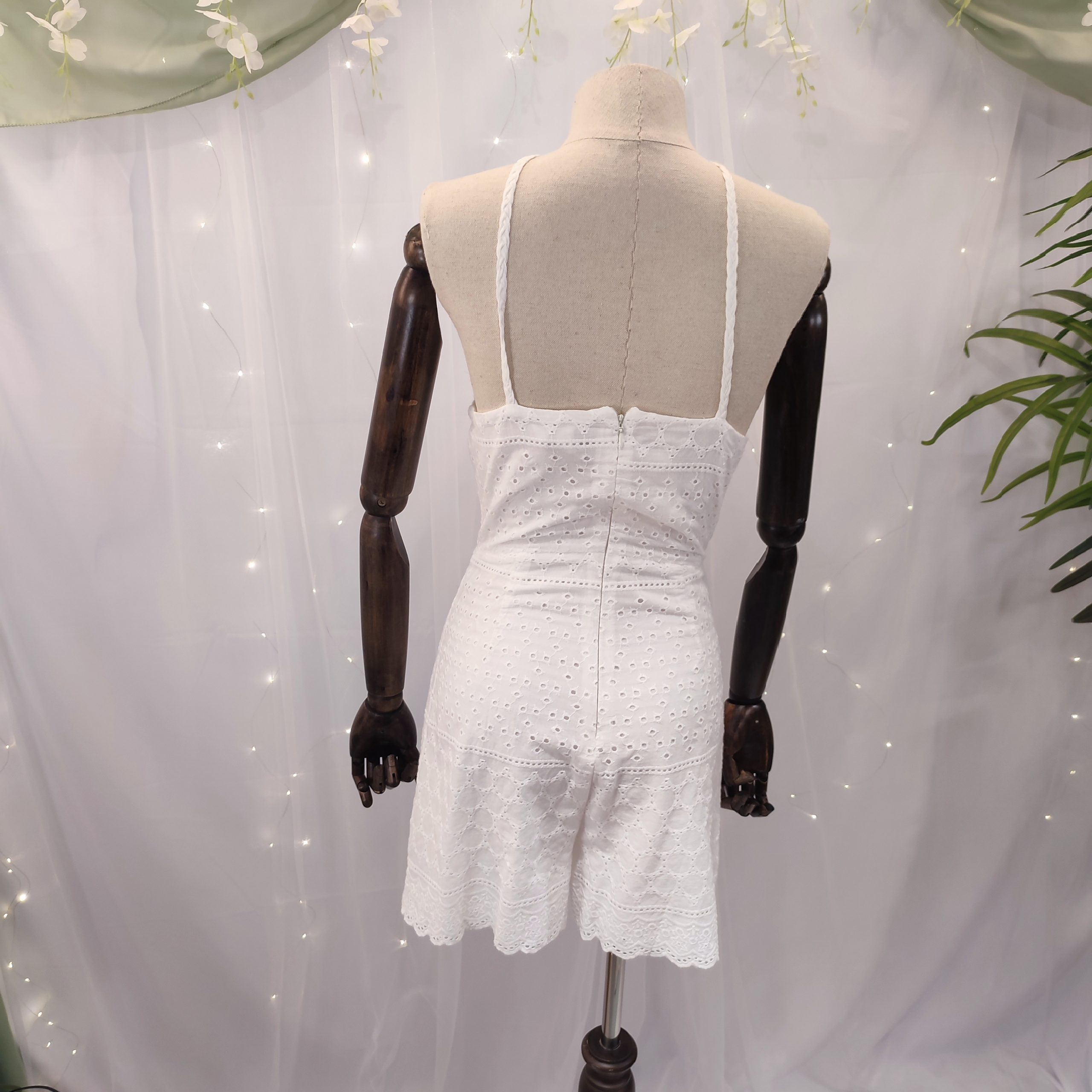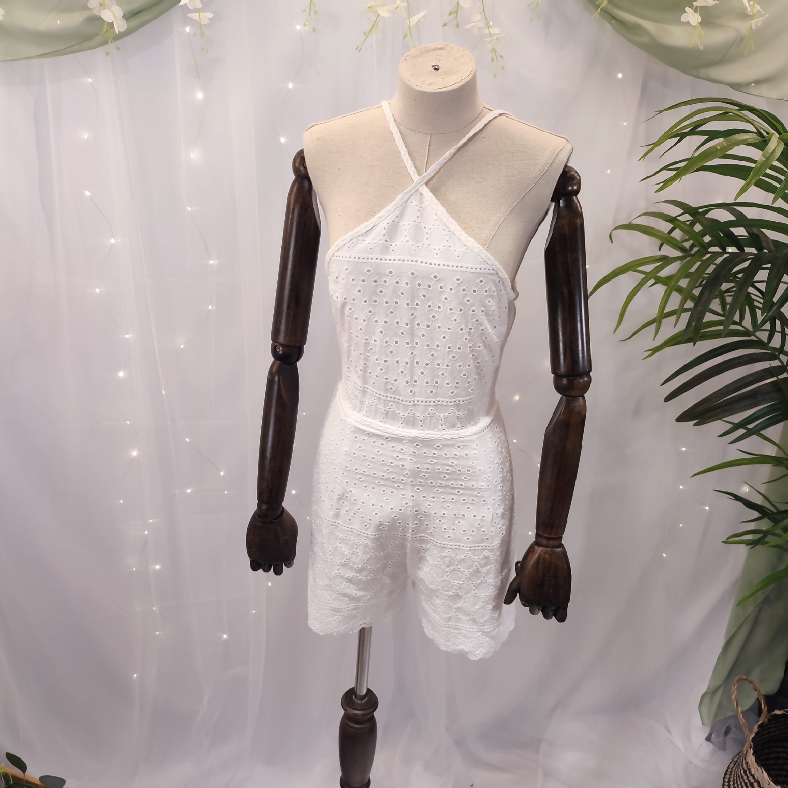 Frescura, originalidad y delicadeza se dan la mano en este precioso mono corto blanco de mujer, una prenda diseñada para los días de sol, brisa y libertad. Hecho de algodón 100%, ligero y natural, es ideal para climas cálidos, como los del Mediterráneo o las islas Baleares, donde la comodidad y el estilo van siempre de la mano.