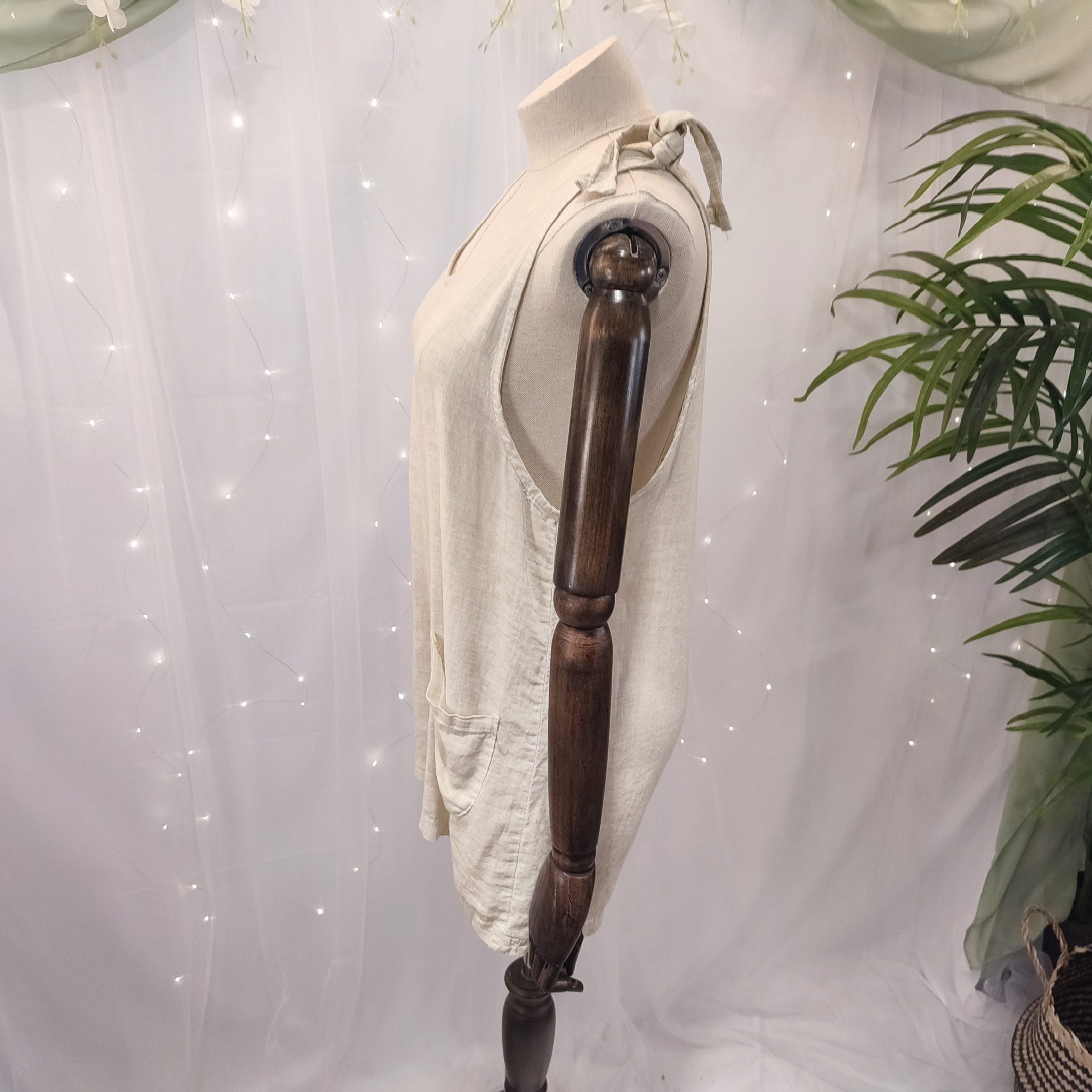 Un detalle encantador y distintivo son los lazos decorativos en la parte superior de los tirantes, que adornan los hombros con un toque delicado y femenino, aportando originalidad sin sobrecargar el diseño. Además, cuenta con dos bolsillos rectos en los laterales, perfectos para sumar funcionalidad sin perder ese aire relajado que tanto nos gusta en Es Petit Cantó.