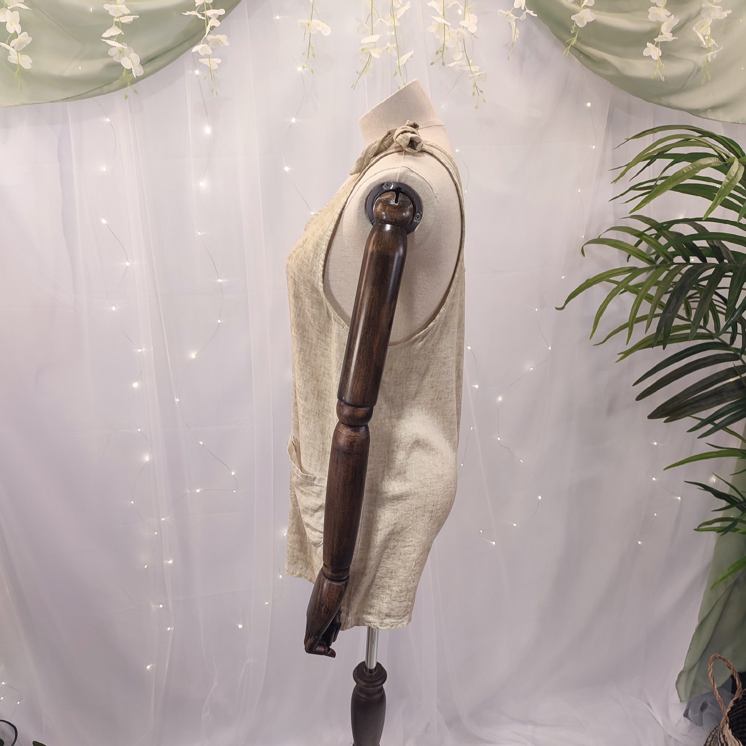 Confeccionado en lino y algodón, un tejido noble y transpirable, este mono es ideal para climas cálidos, aportando una sensación de frescura y ligereza en cada movimiento. Su diseño de tirante ancho sin mangas permite total libertad para moverte, y su escote en pico estiliza el cuello y realza la figura de forma natural.