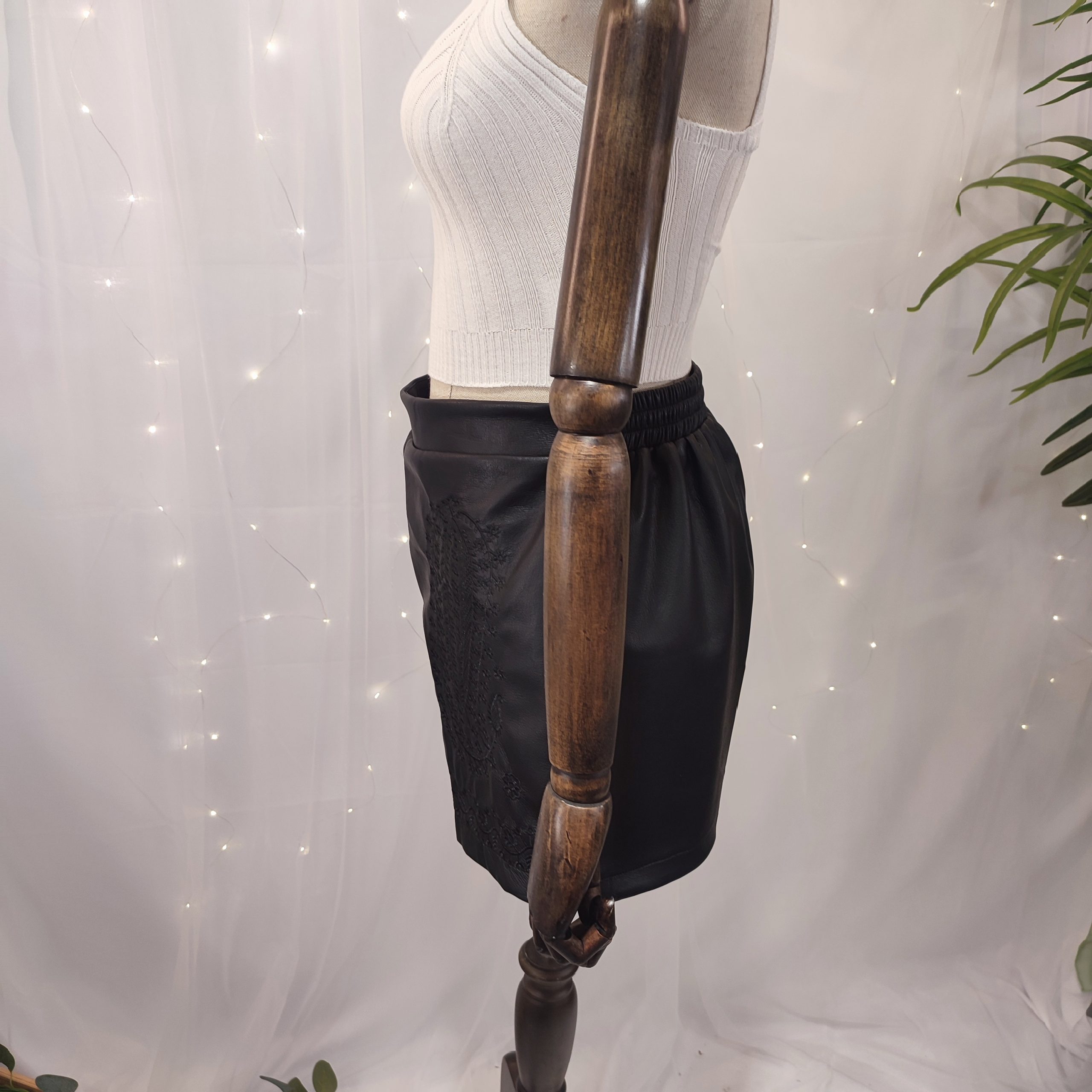 Aunque tiene toda la apariencia del cuero, está confeccionado principalmente en viscosa, lo que lo hace más ligero, flexible y cómodo para el día a día. Su tacto suave y su caída sutil lo hacen ideal para llevar en cualquier época del año, tanto con blusas ligeras en verano como con medias y botas en temporadas más frescas.