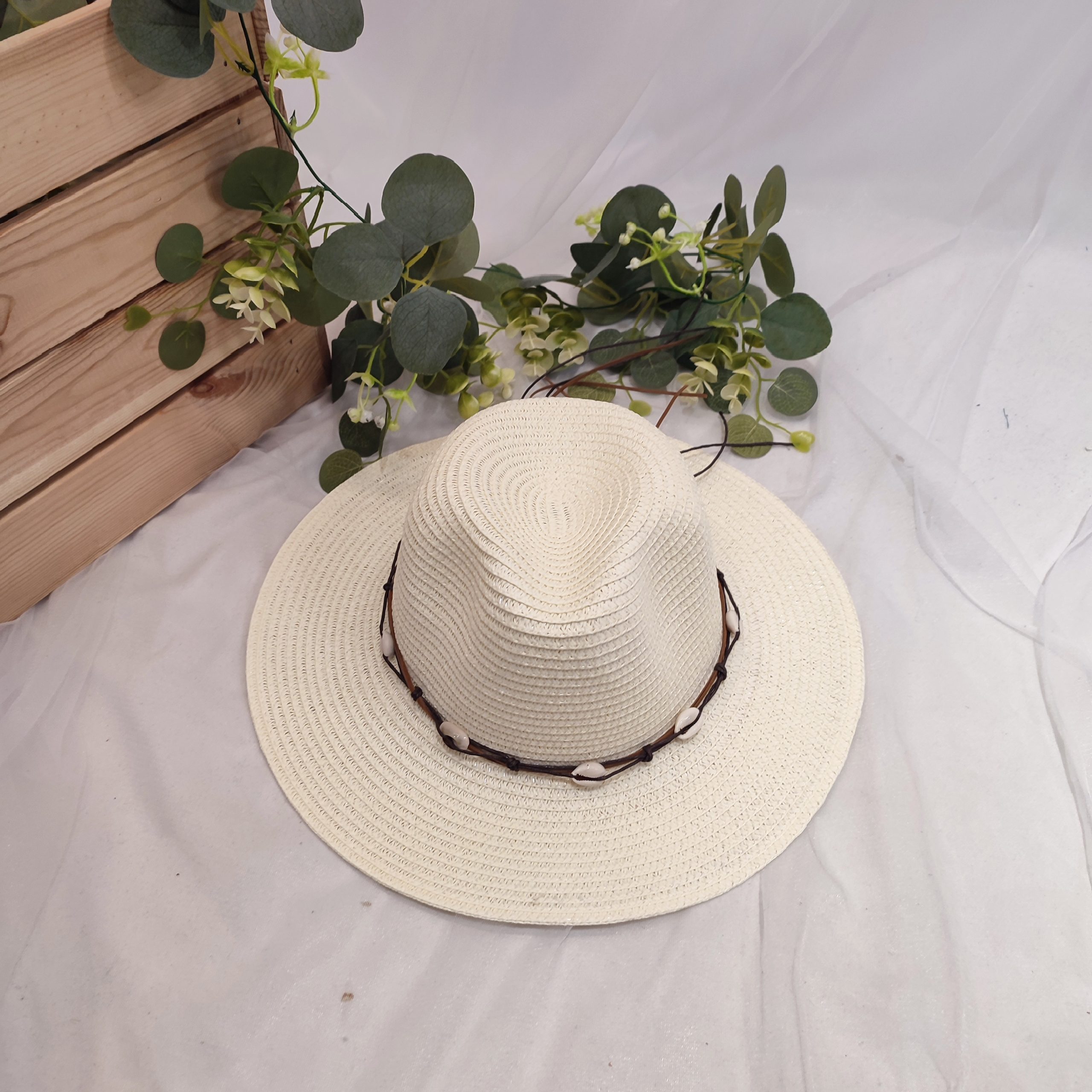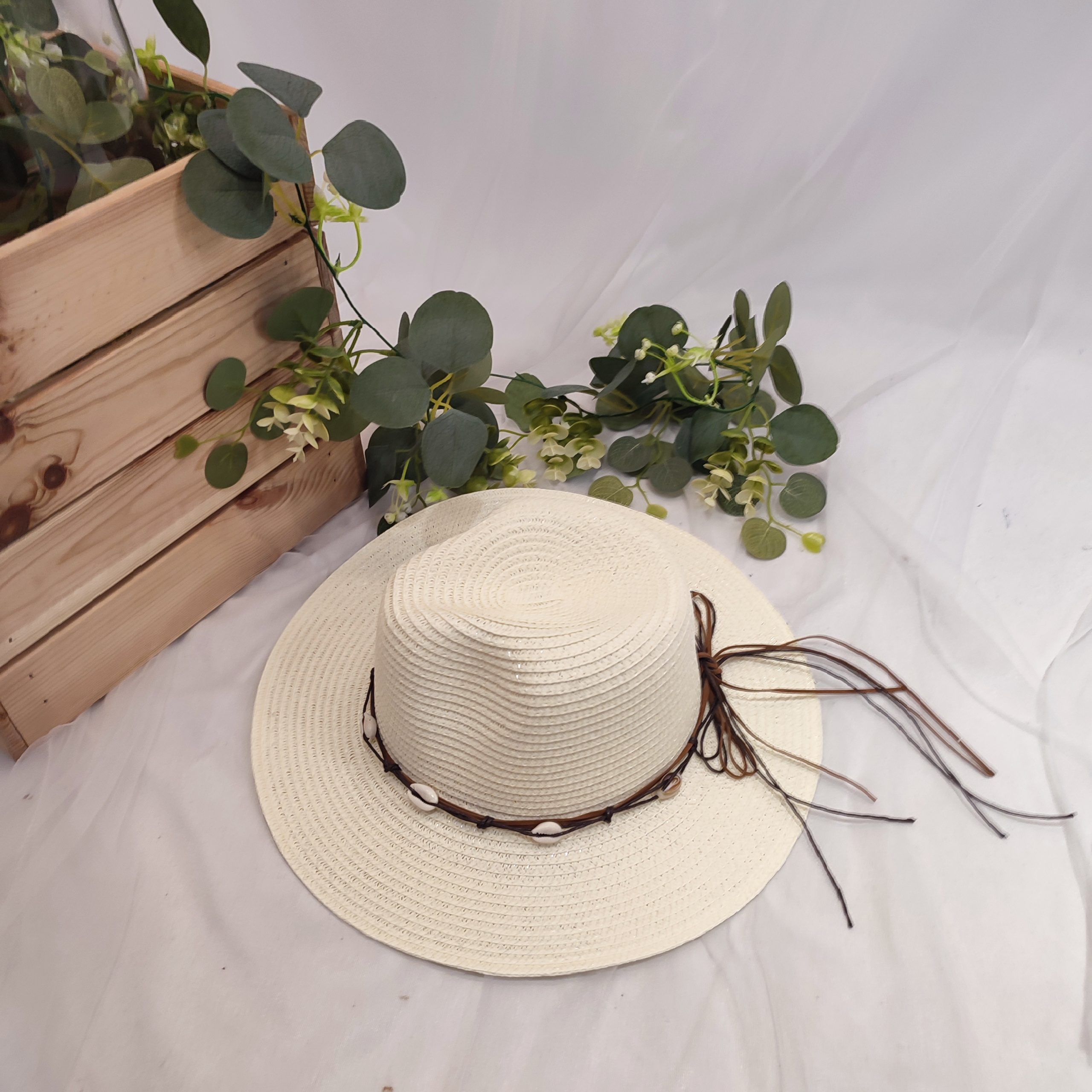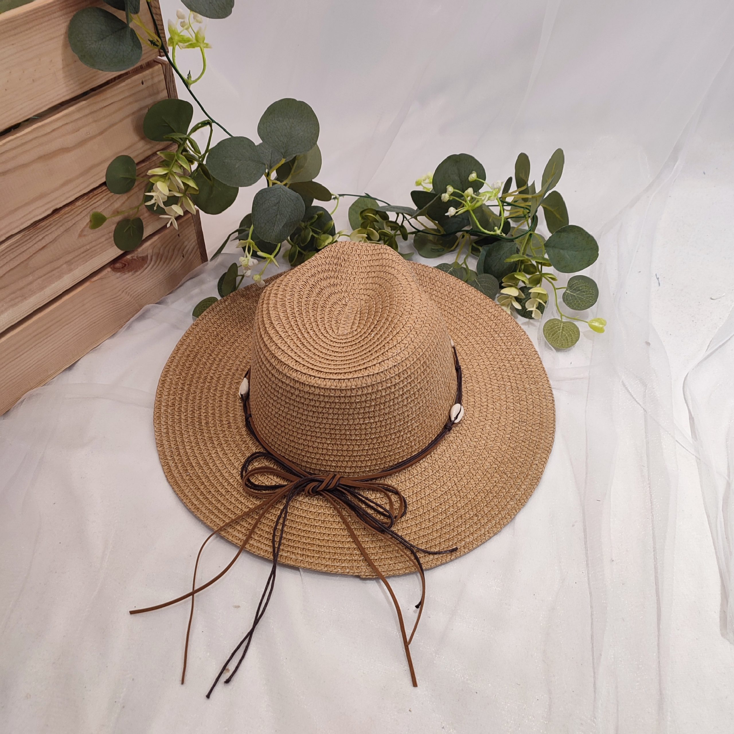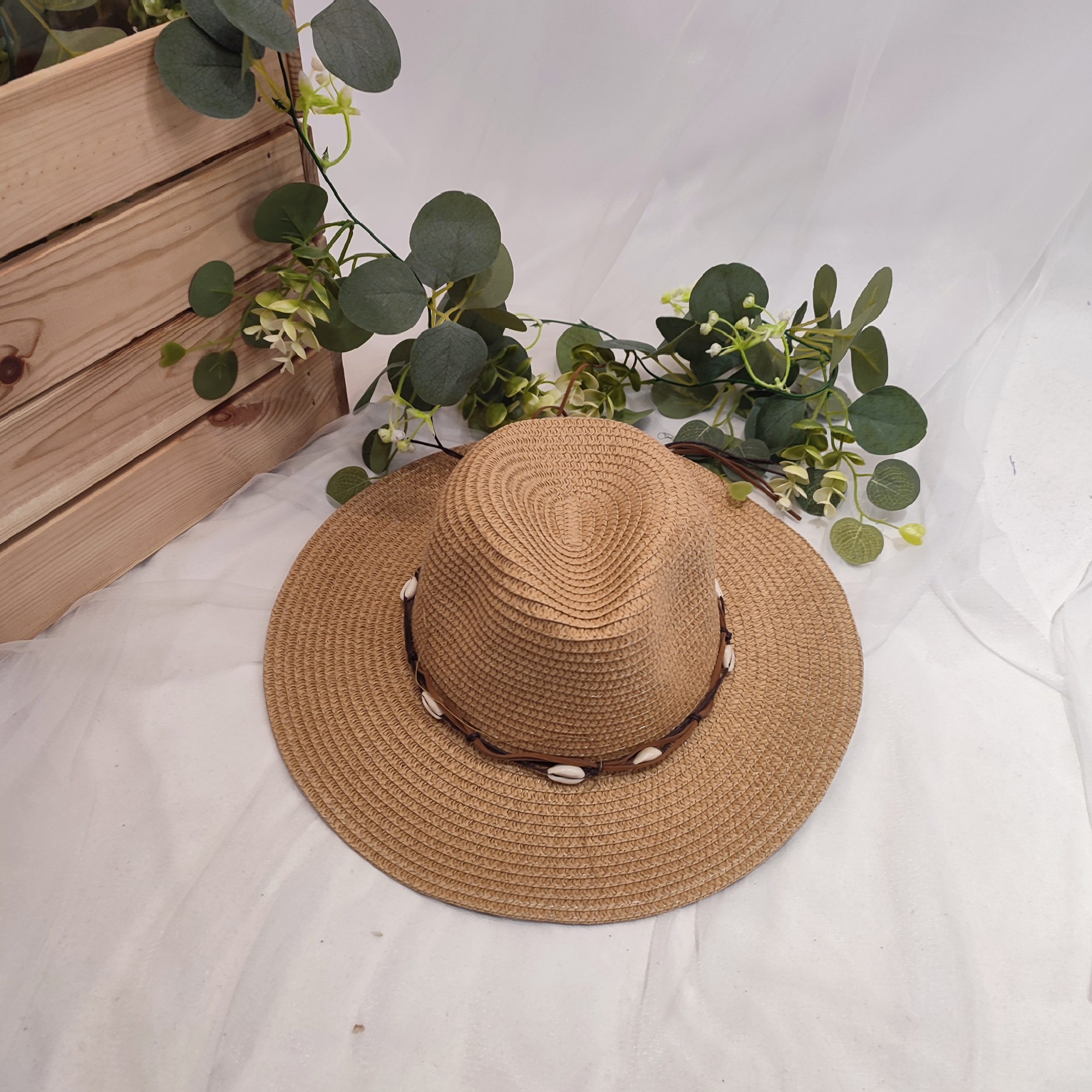 Disponible en dos tonos atemporales —beige claro y camel oscuro— este sombrero se adapta con facilidad a múltiples estilos y combina a la perfección con una paleta de colores naturales. El detalle artesanal alrededor de la copa, un cordel adornado con pequeñas conchas cosidas a mano, añade un toque distintivo y veraniego que evoca la brisa marina, los atardeceres junto al mar y la esencia libre de lugares como las Islas Baleares o cualquier rincón del Mediterráneo.