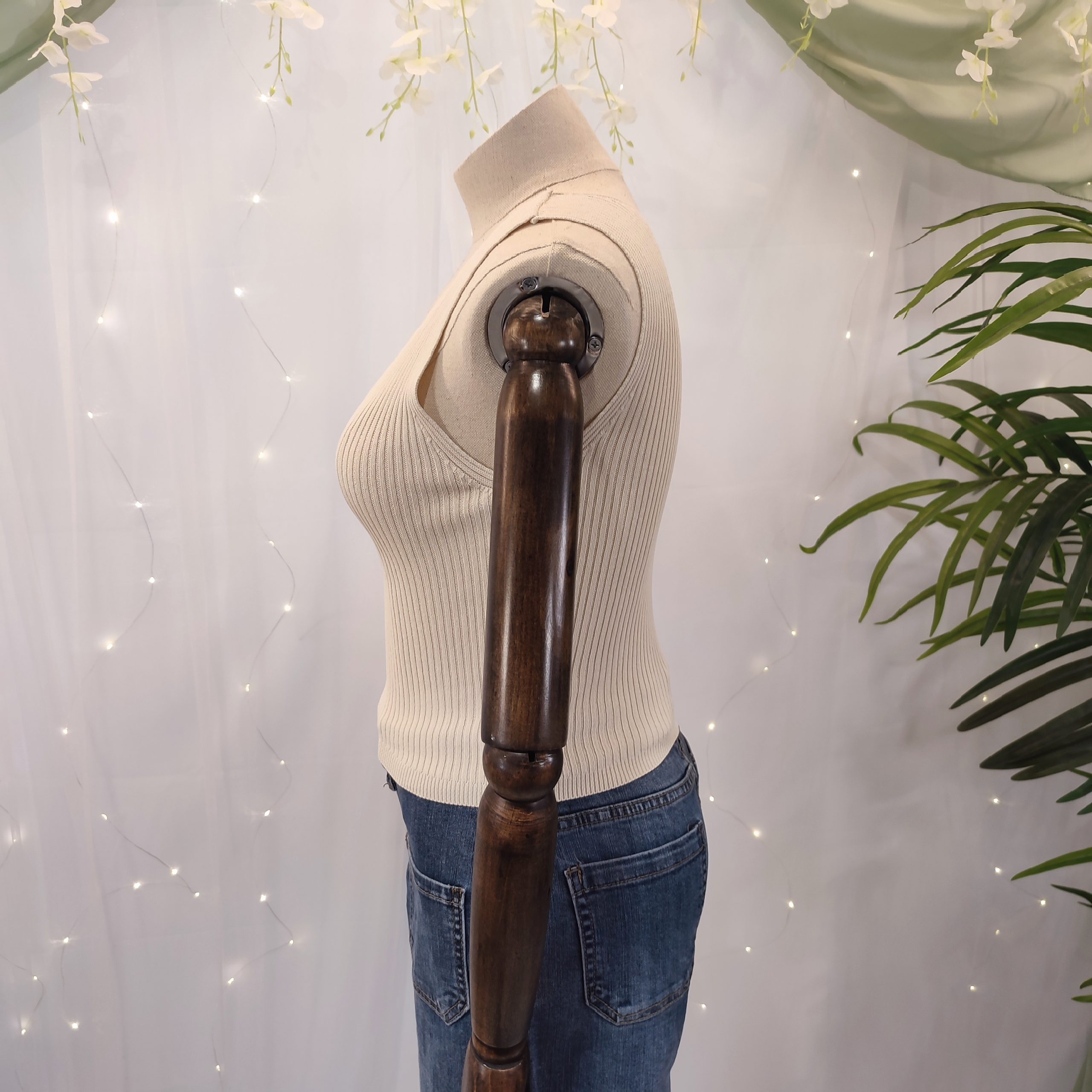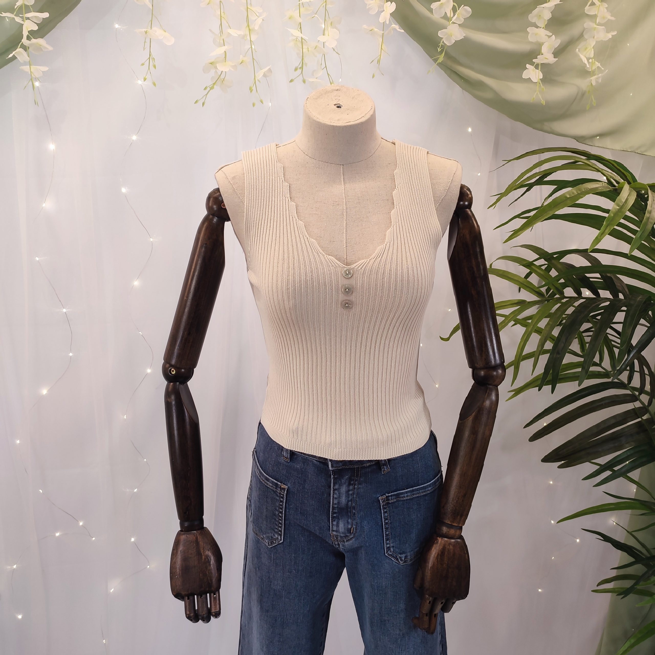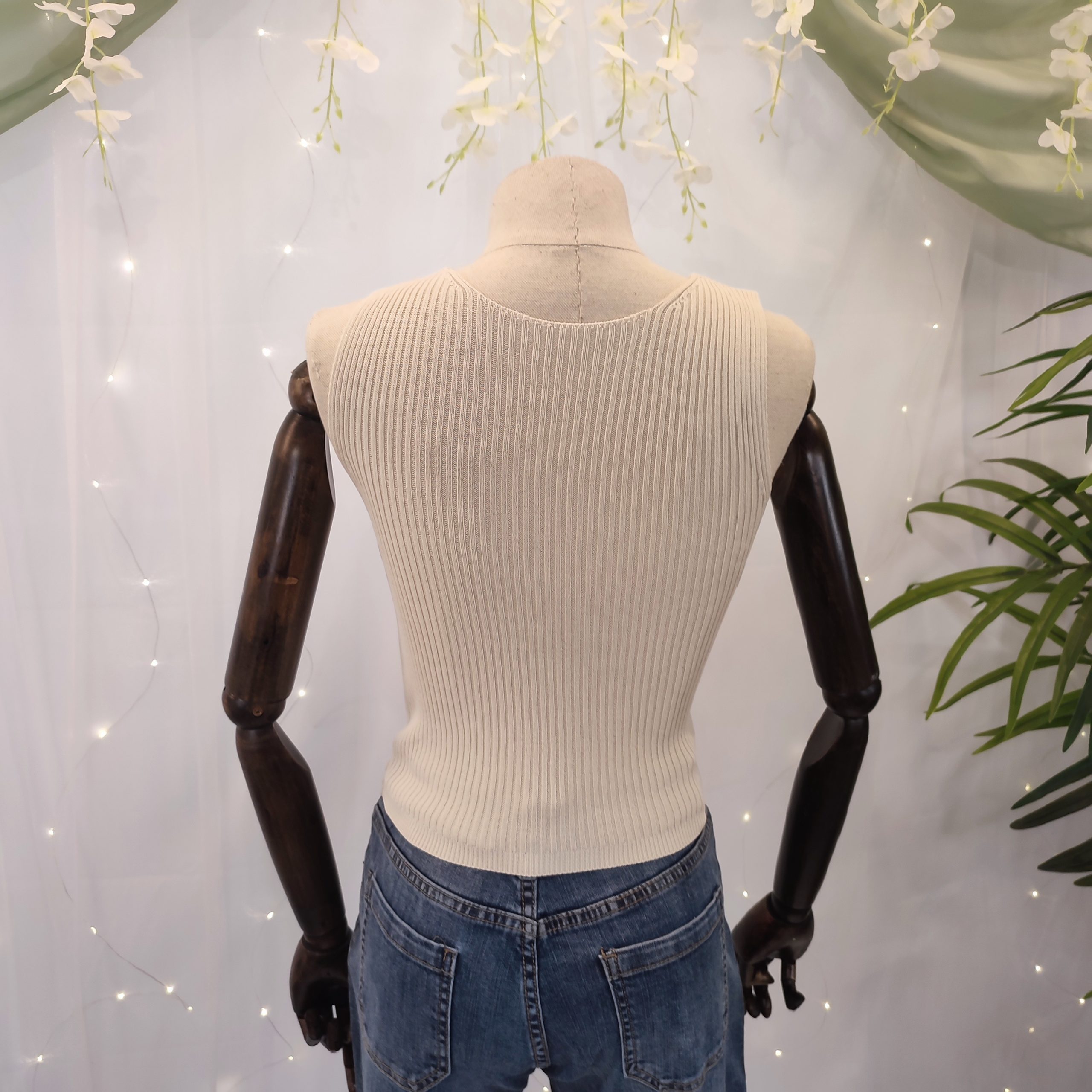 Confeccionado principalmente en viscosa, su tejido suave, fresco y ligero se adapta al cuerpo con un ajuste ceñido que realza la figura de forma natural y sin esfuerzo. Su diseño liso y su color neutro lo hacen increíblemente versátil, ideal para combinar con todo tipo de prendas y estilos, desde un look boho con faldas vaporosas, hasta uno más urbano con jeans o pantalones de lino.