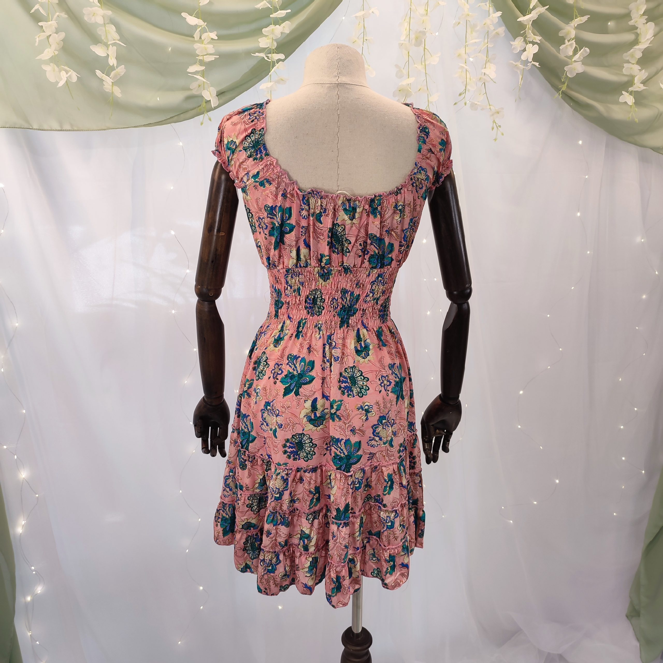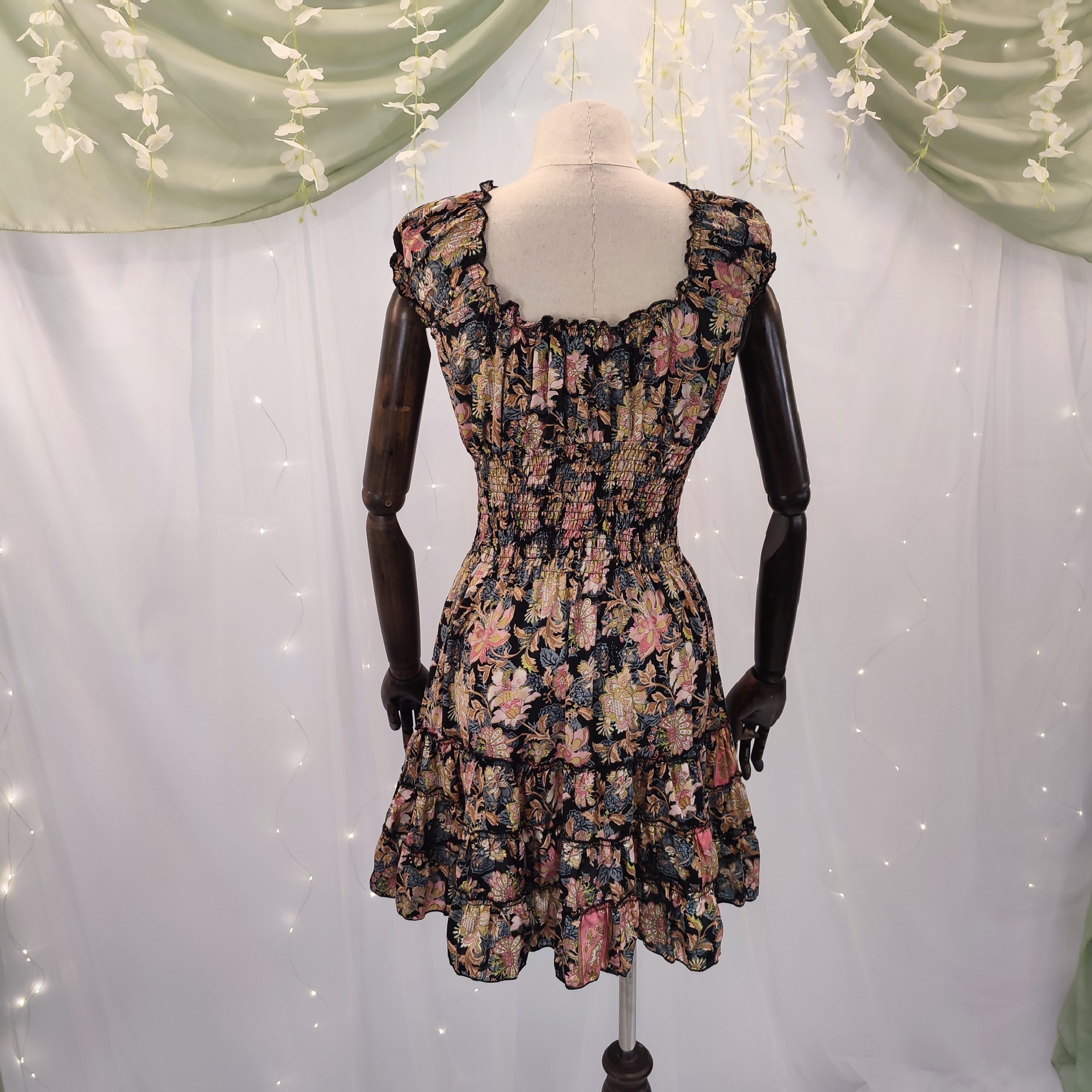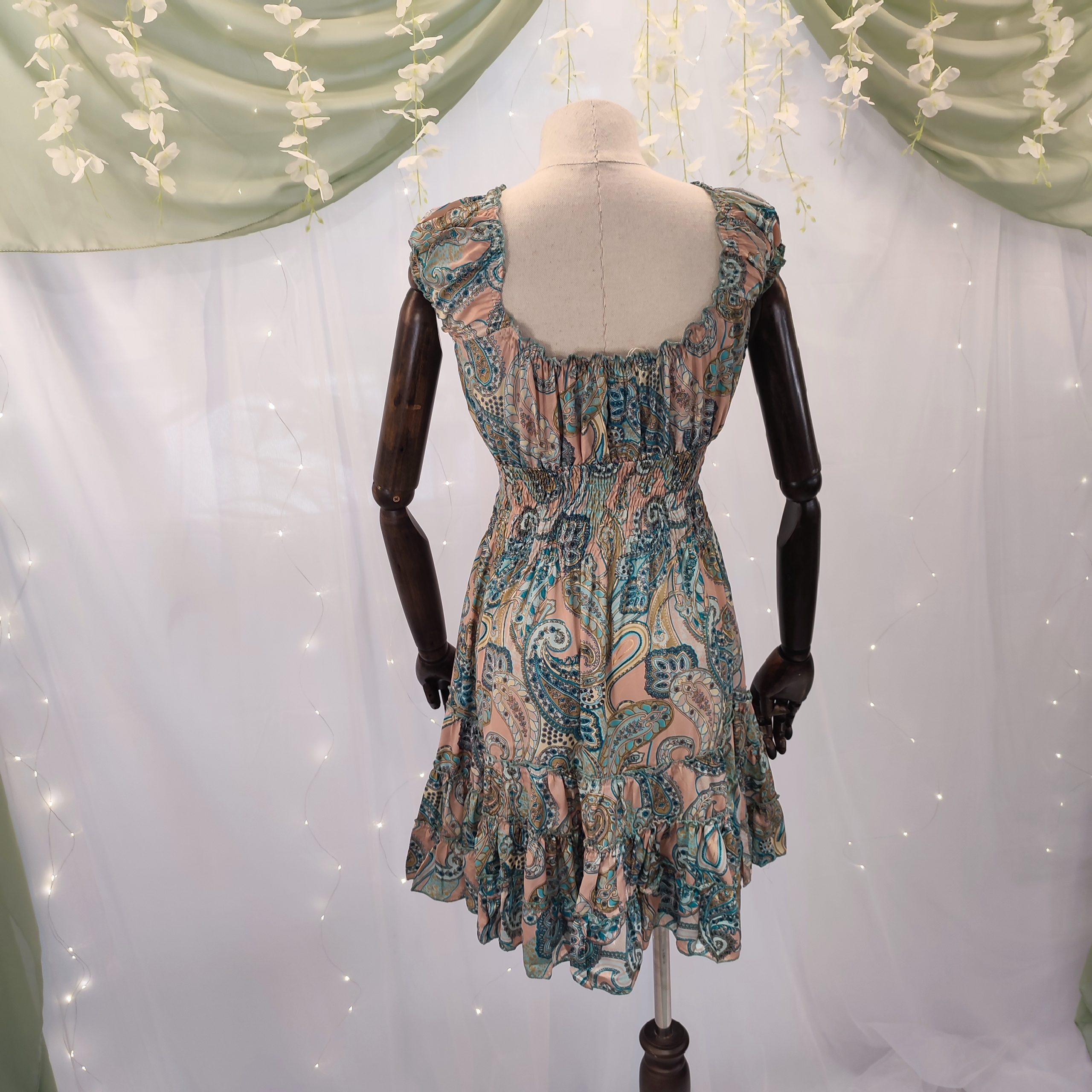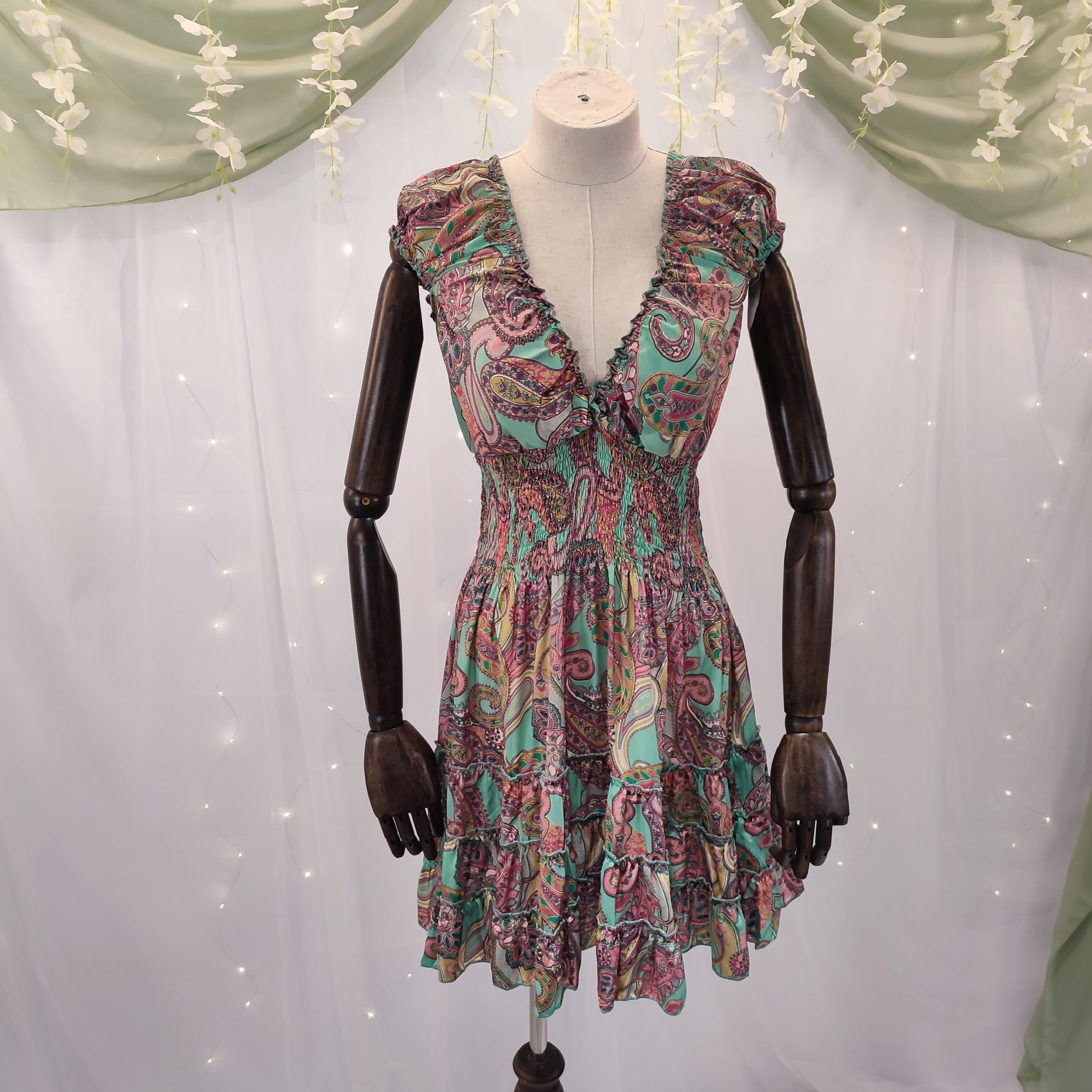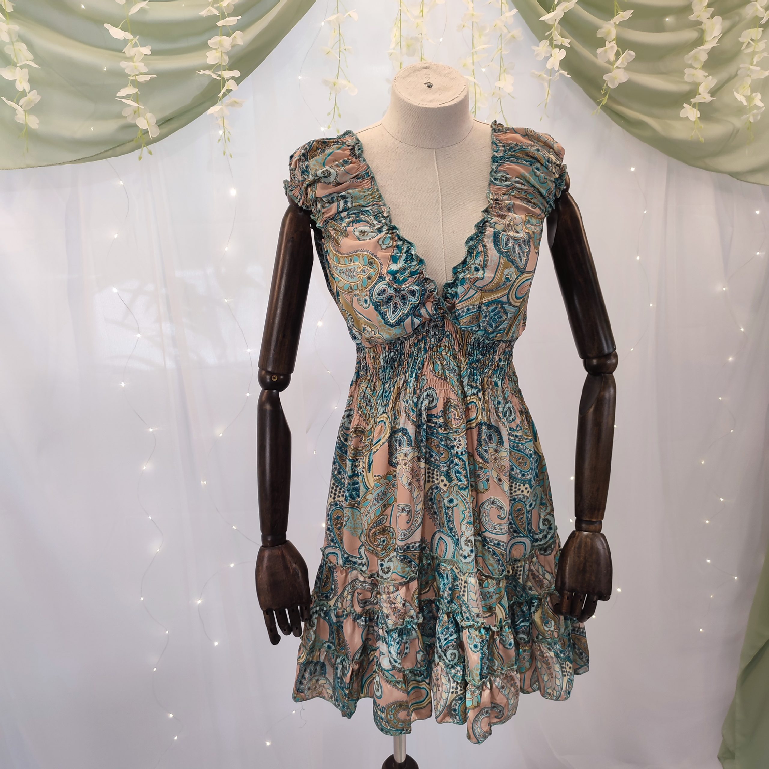 El estampado étnico que recorre toda la prenda transmite un aire libre, auténtico y lleno de personalidad. Cada vestido cuenta con una combinación única de colores y formas, inspiradas en los patrones tradicionales de la artesanía textil india. A lo largo de su silueta, delicadas capas con volantes cosidos a mano se superponen con fluidez, aportando movimiento, textura y un estilo bohemio muy chic que no pasa desapercibido. Este detalle le da vida al vestido, acentuando la figura de manera ligera y femenina.