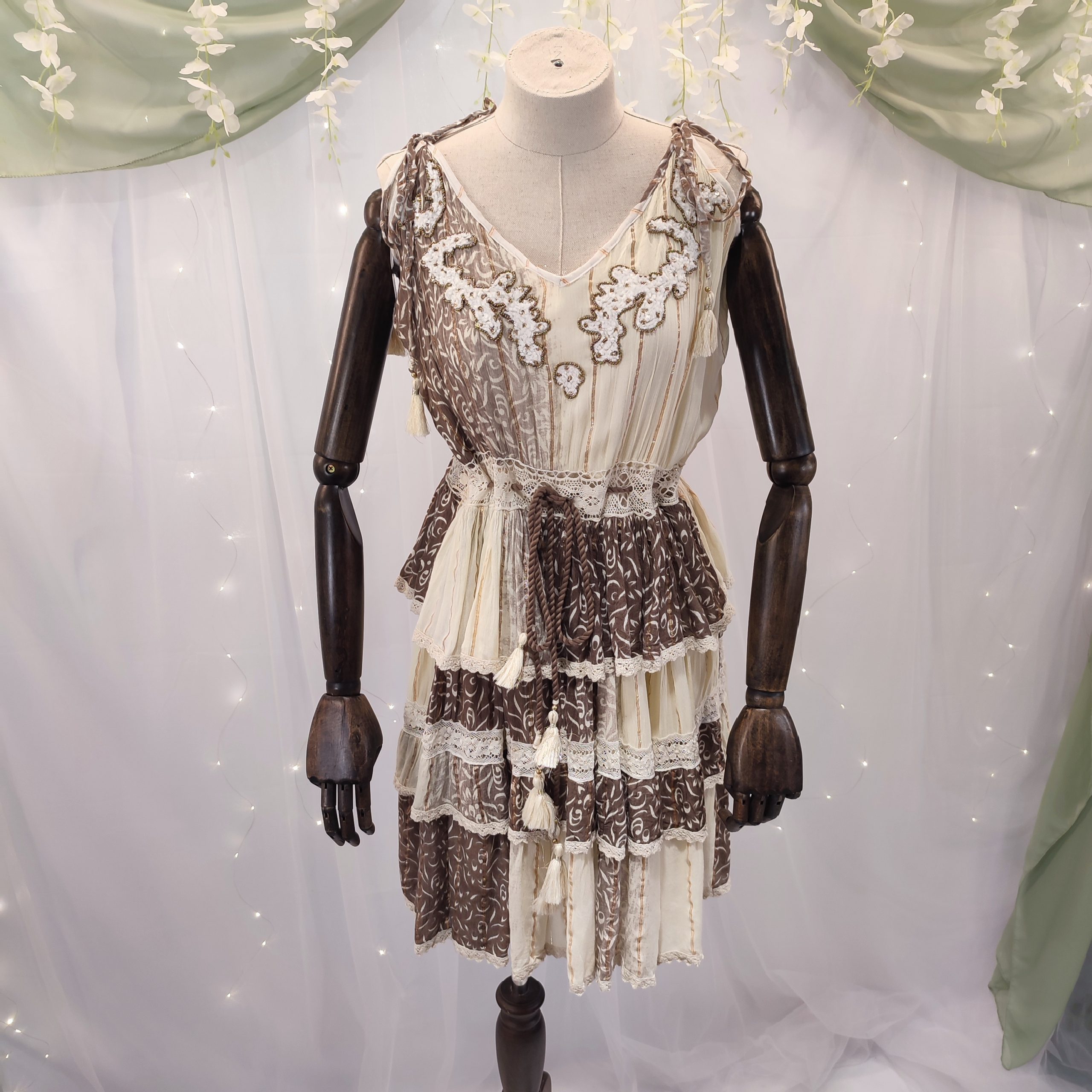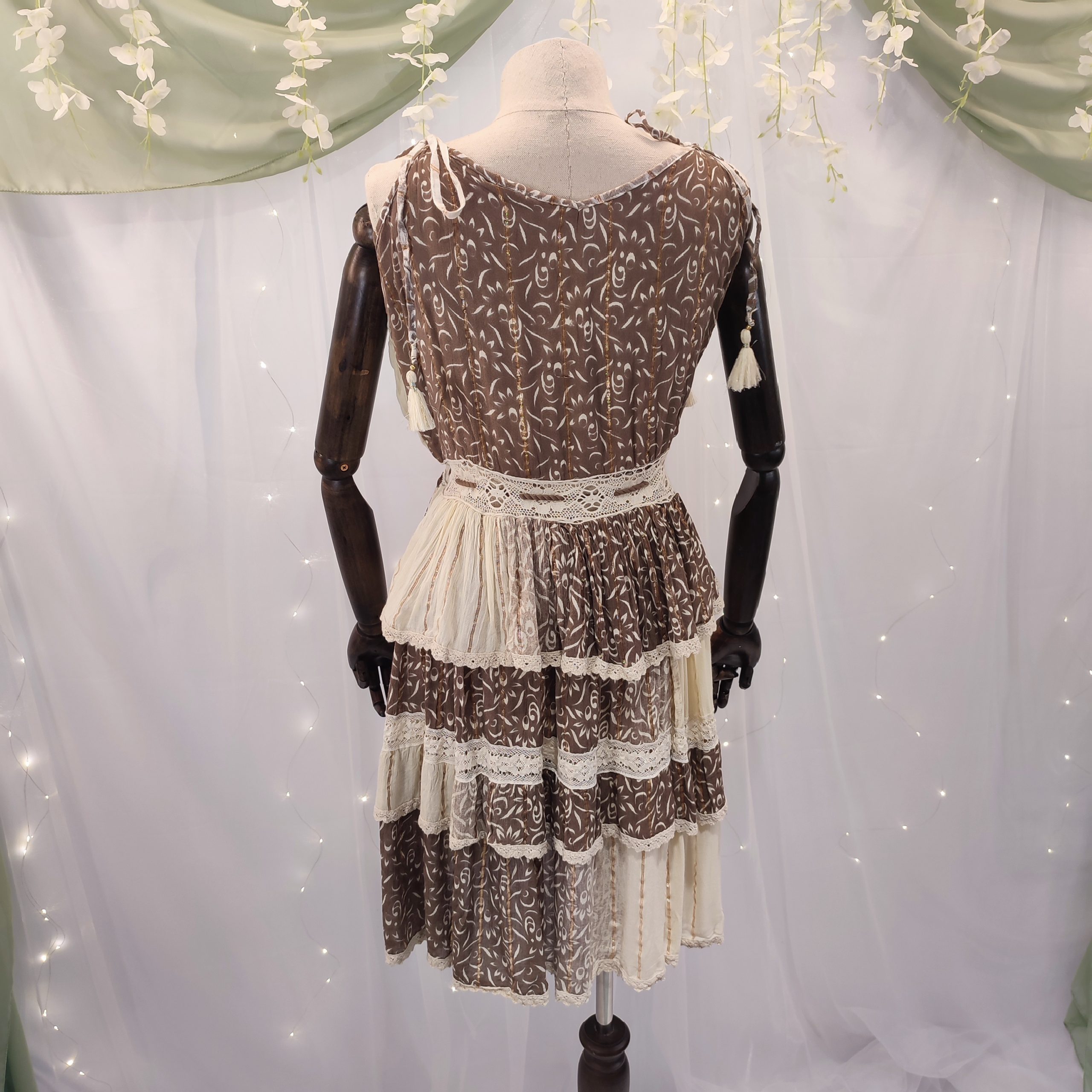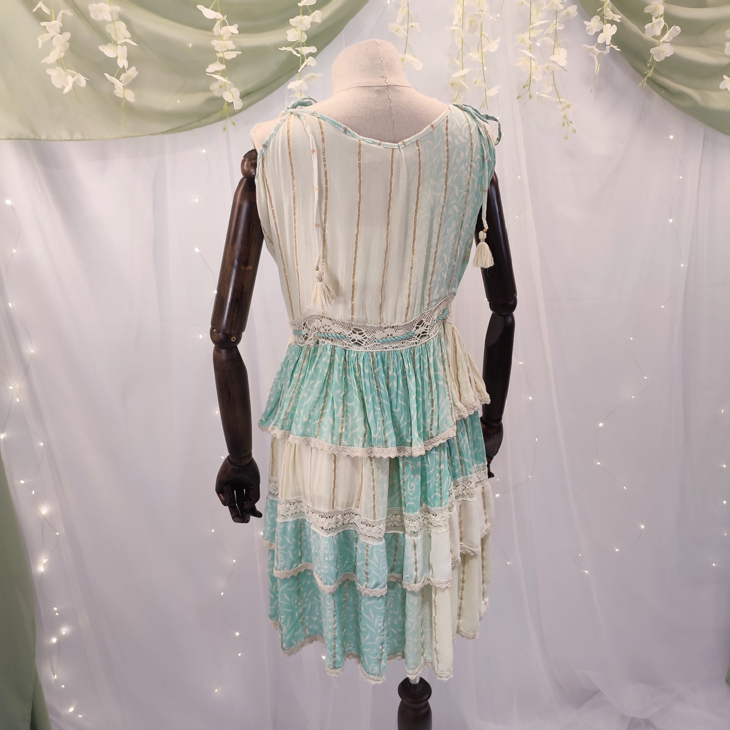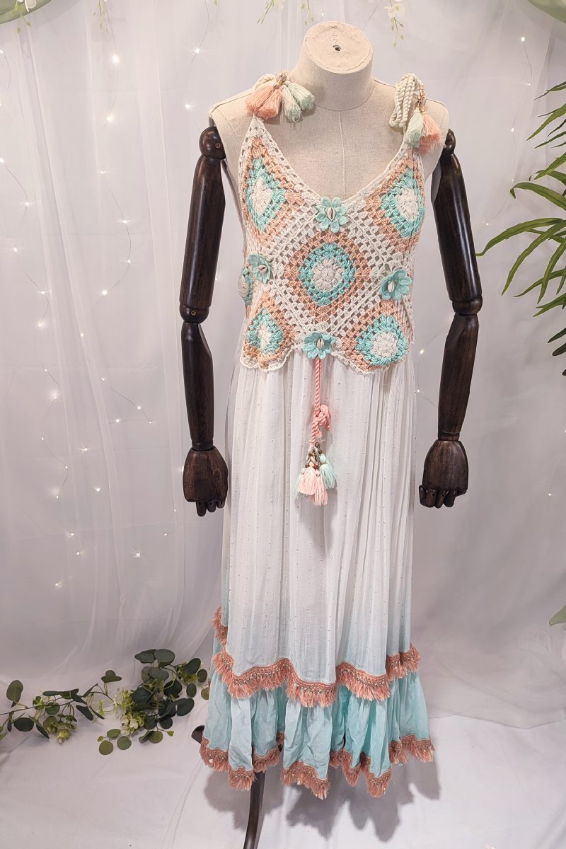 El vestido destaca por sus capas con volantes a lo largo de la prenda y detalles de encaje en zonas estratégicas, que le dan movimiento, textura y ese aire boho tan característico. Los colores se combinan con un beige clarito que aporta equilibrio y luminosidad, creando un efecto visual dinámico y artesanal, perfecto para quienes buscan un look relajado pero con estilo.