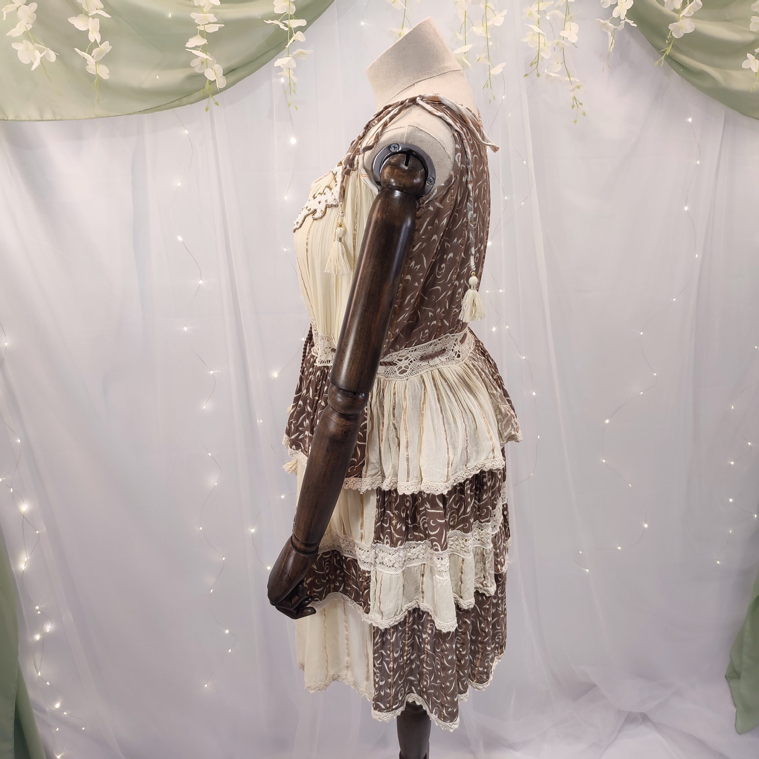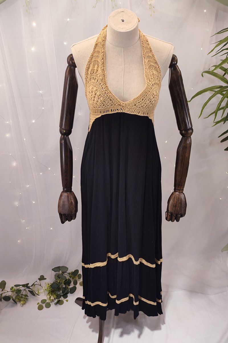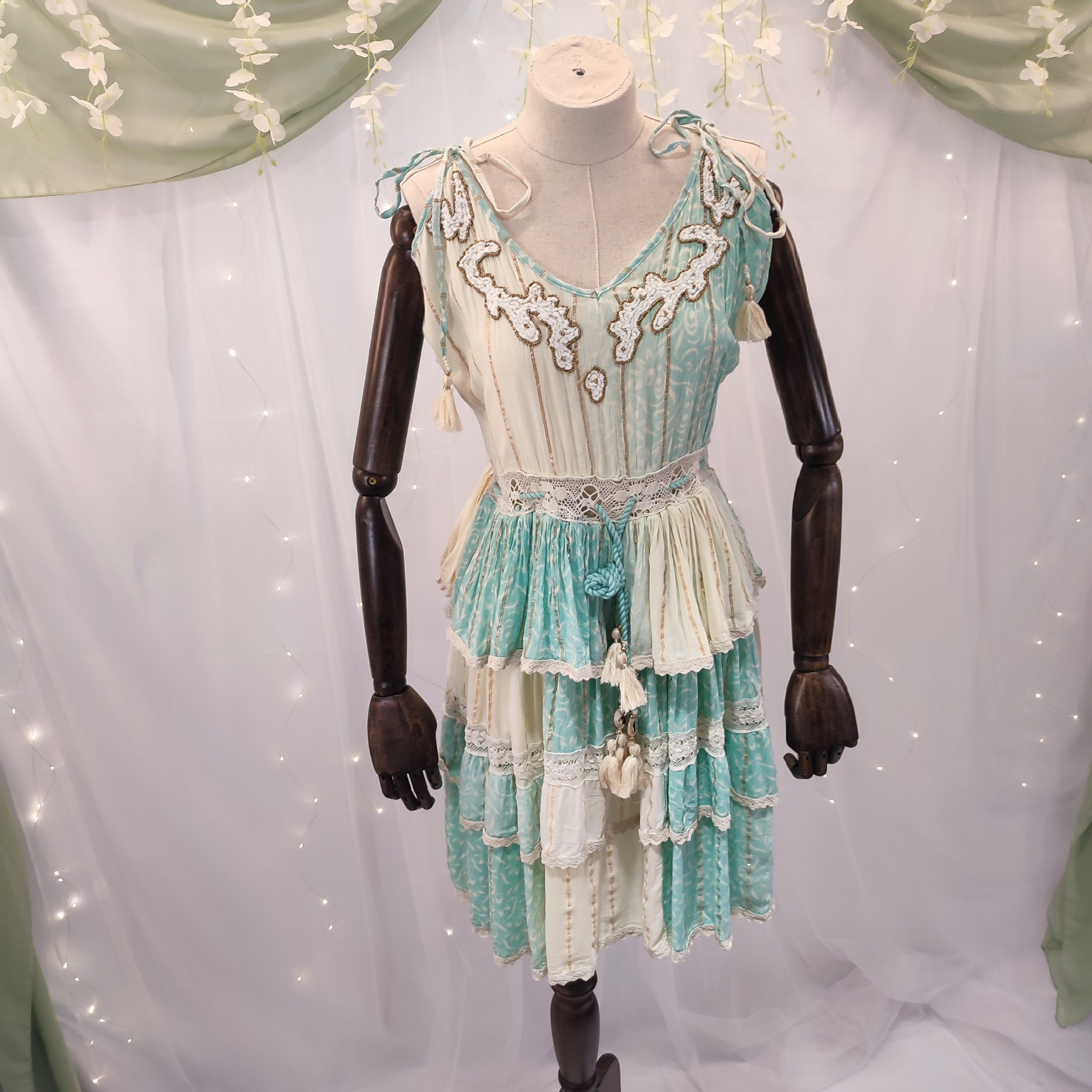 El vestido destaca por sus capas con volantes a lo largo de la prenda y detalles de encaje en zonas estratégicas, que le dan movimiento, textura y ese aire boho tan característico. Los colores se combinan con un beige clarito que aporta equilibrio y luminosidad, creando un efecto visual dinámico y artesanal, perfecto para quienes buscan un look relajado pero con estilo.