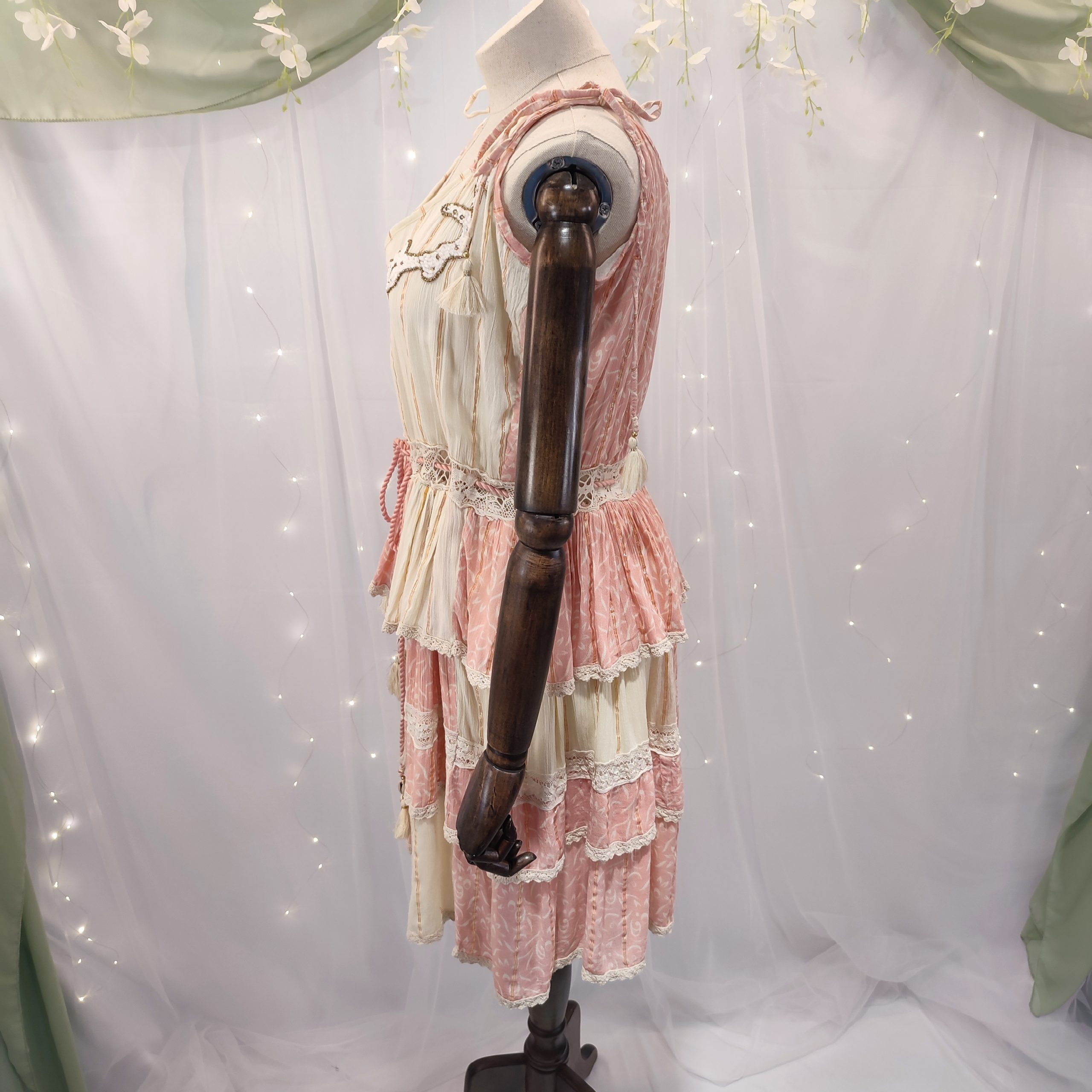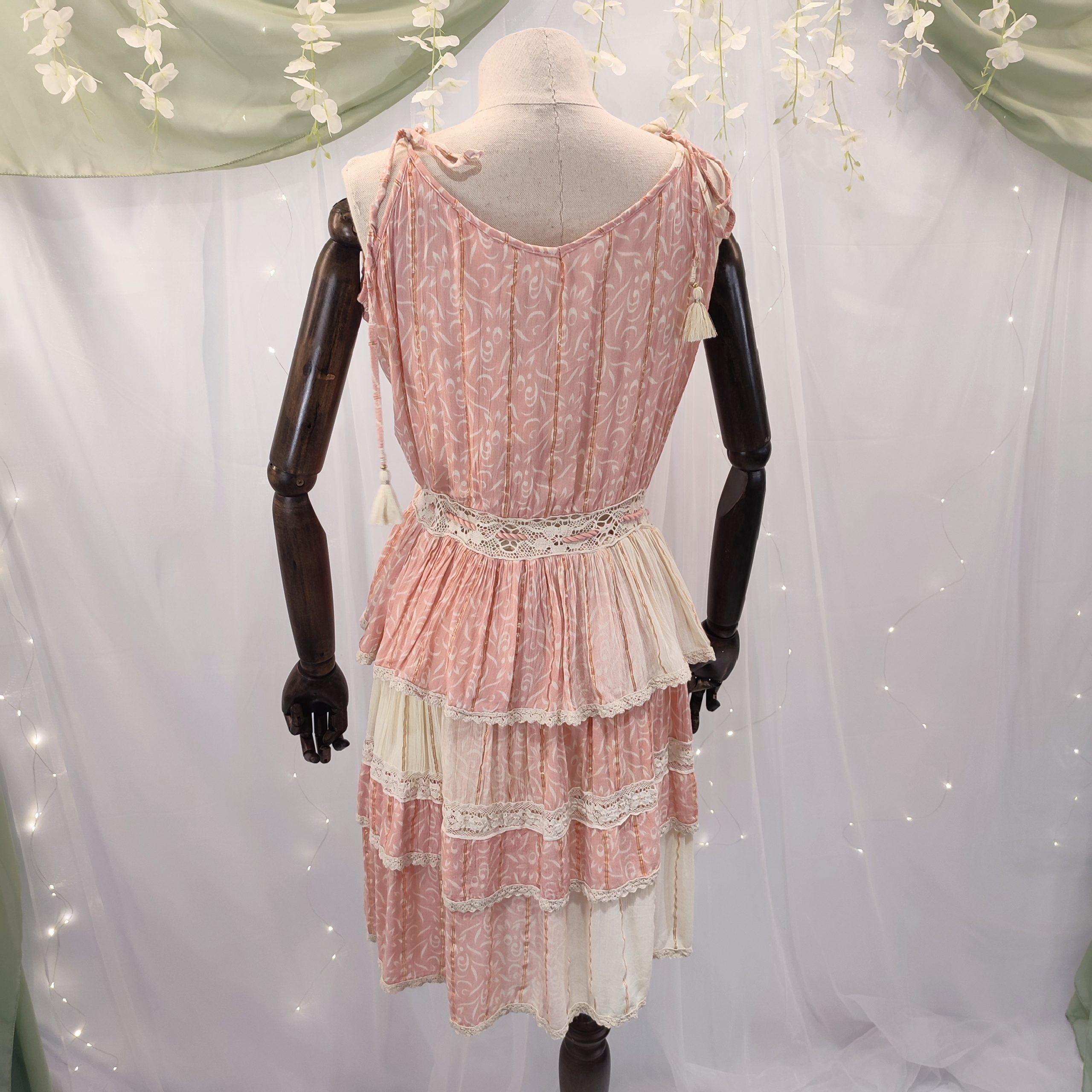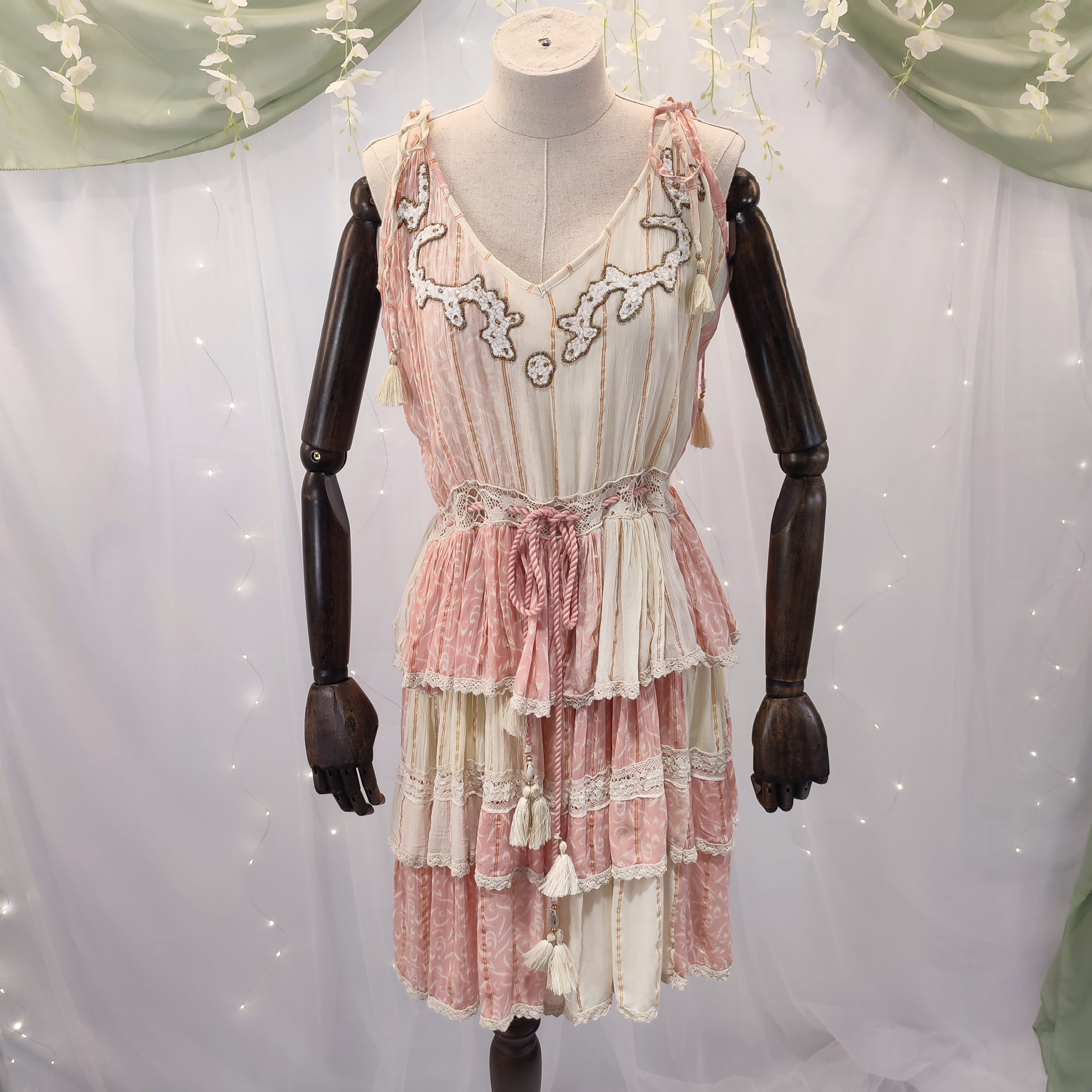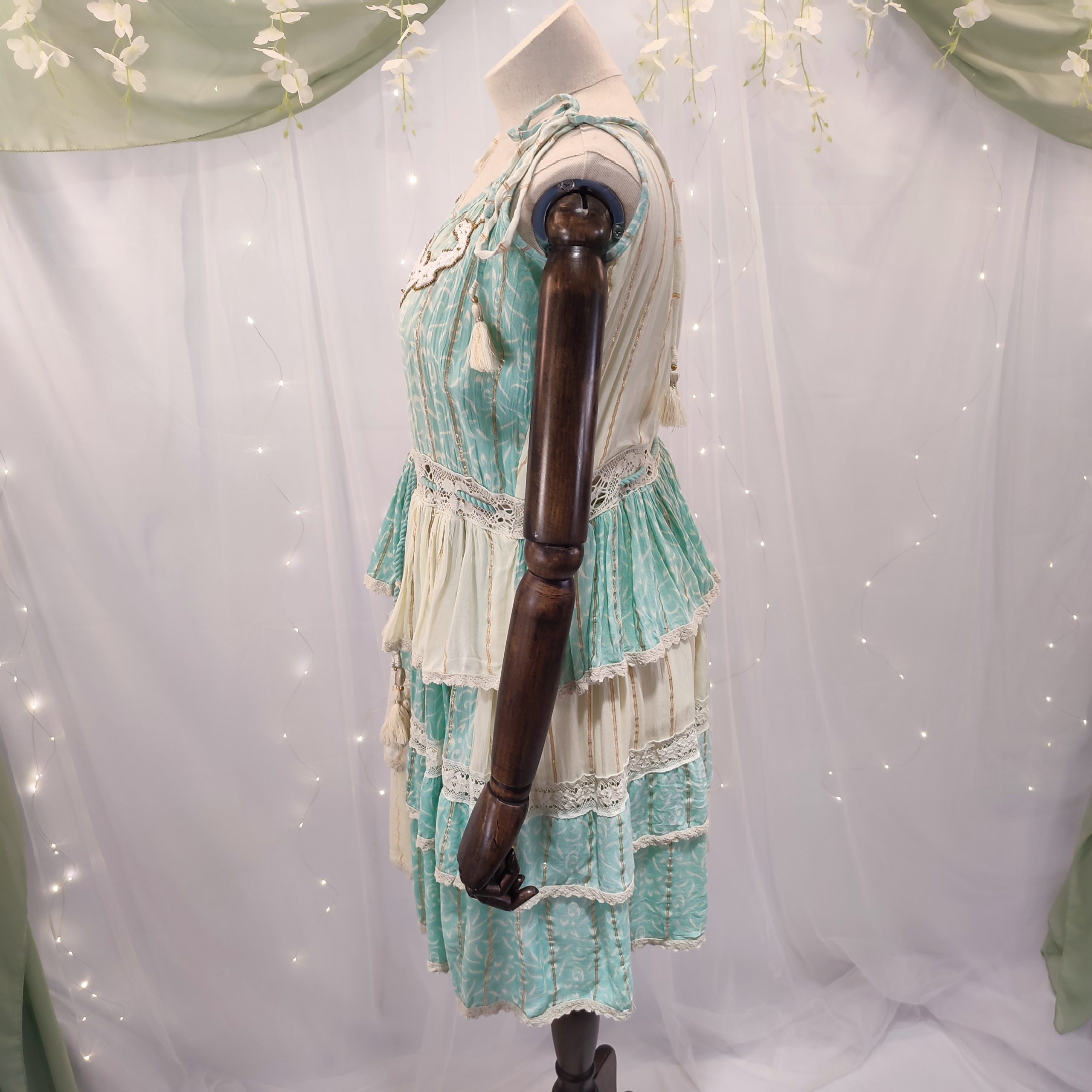 El vestido destaca por sus capas con volantes a lo largo de la prenda y detalles de encaje en zonas estratégicas, que le dan movimiento, textura y ese aire boho tan característico. Los colores se combinan con un beige clarito que aporta equilibrio y luminosidad, creando un efecto visual dinámico y artesanal, perfecto para quienes buscan un look relajado pero con estilo.