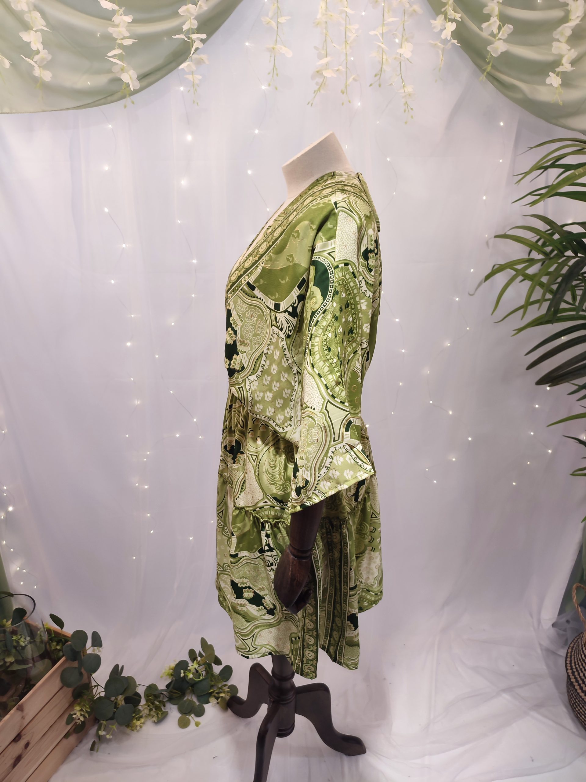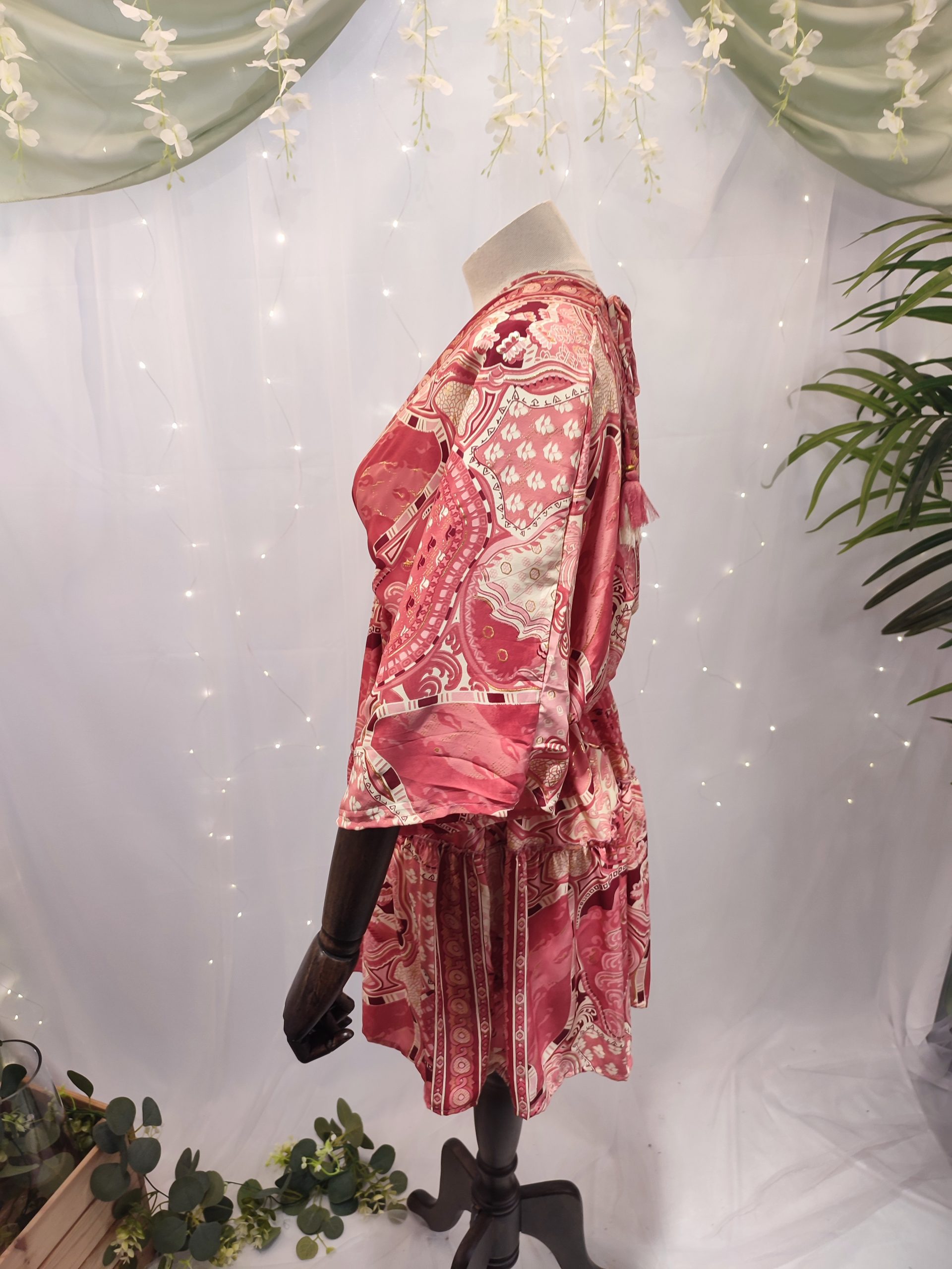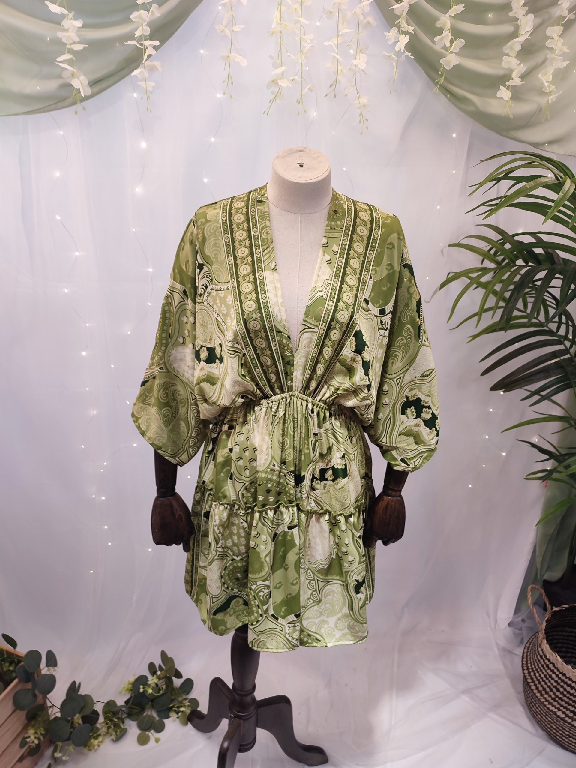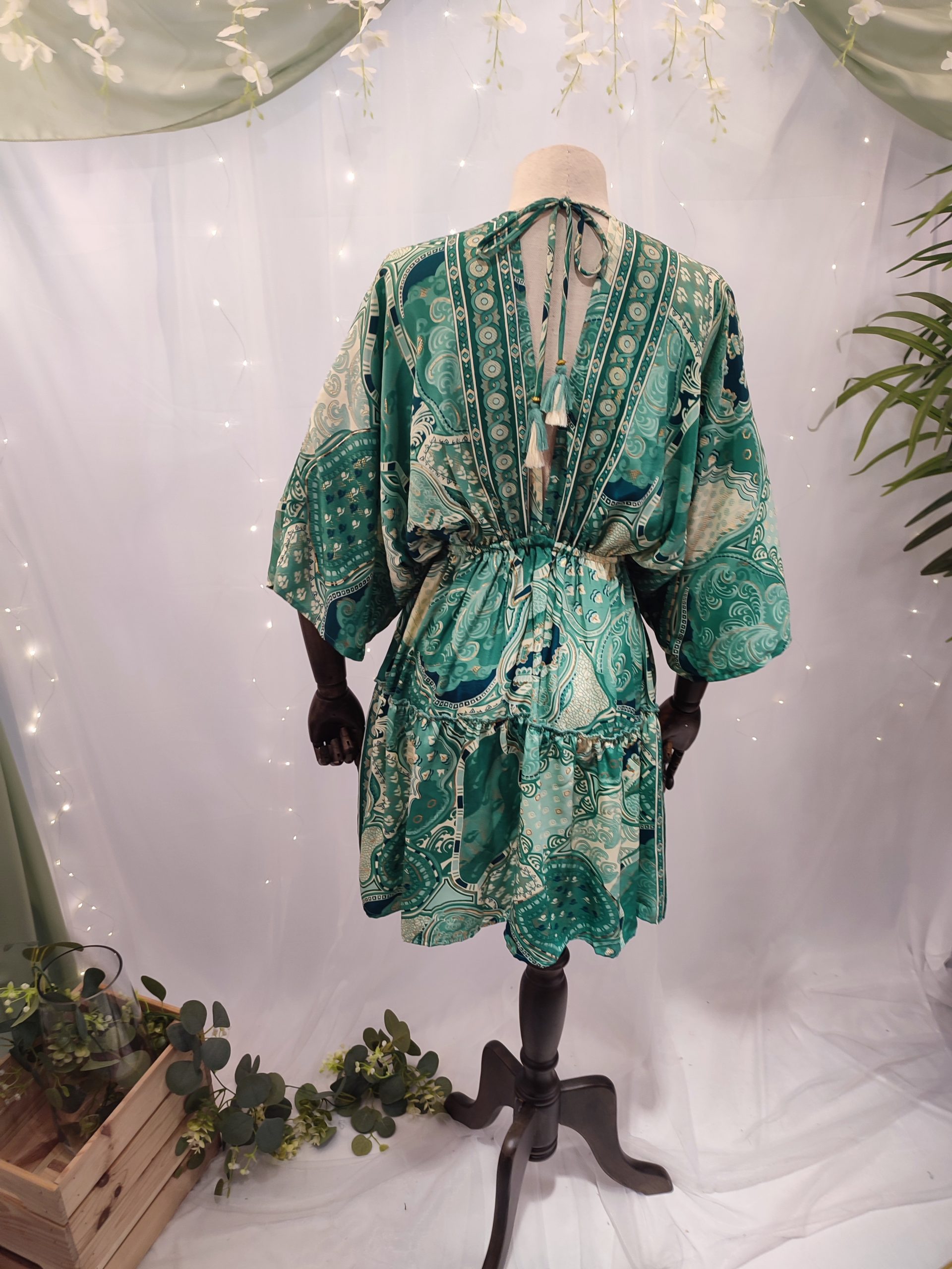Su corte corto aporta frescura y libertad de movimiento, mientras que sus mangas anchas de estilo oversize caen elegantemente sobre los brazos, creando una silueta fluida y sofisticada. La cintura regulable mediante una cuerda permite ajustarlo a tu figura según tu estilo o la ocasión, logrando un efecto más ceñido o más suelto, según prefieras.
