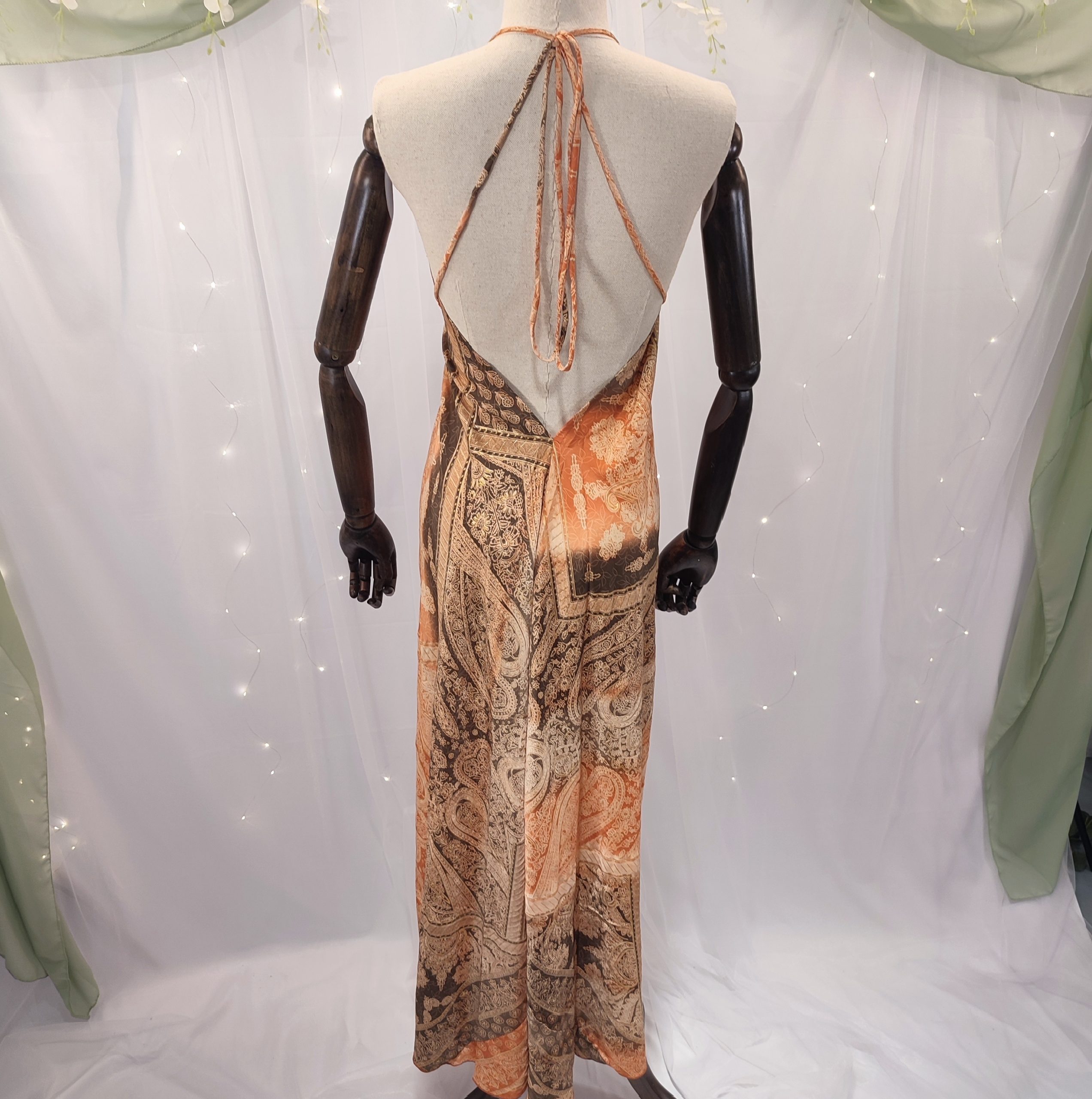 El diseño sin mangas con tiras finas que se atan al cuello realza el escote en forma de pico, estilizando la parte superior del cuerpo con un toque sutilmente seductor. El corte entallado se ajusta delicadamente a la figura, resaltando las curvas de forma natural, mientras que la espalda queda al descubierto, terminando en un elegante pico que aporta un aire sofisticado y muy femenino.