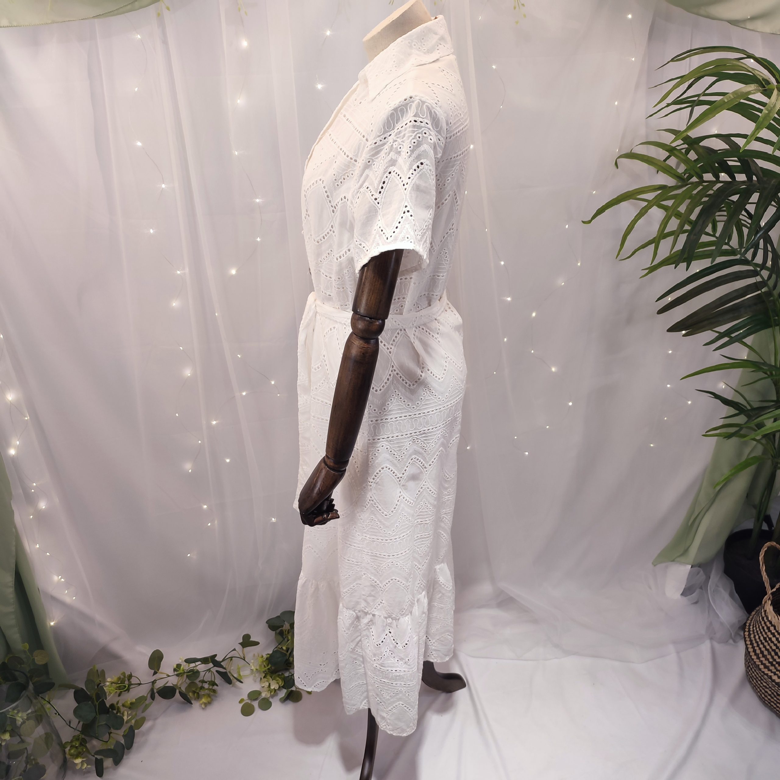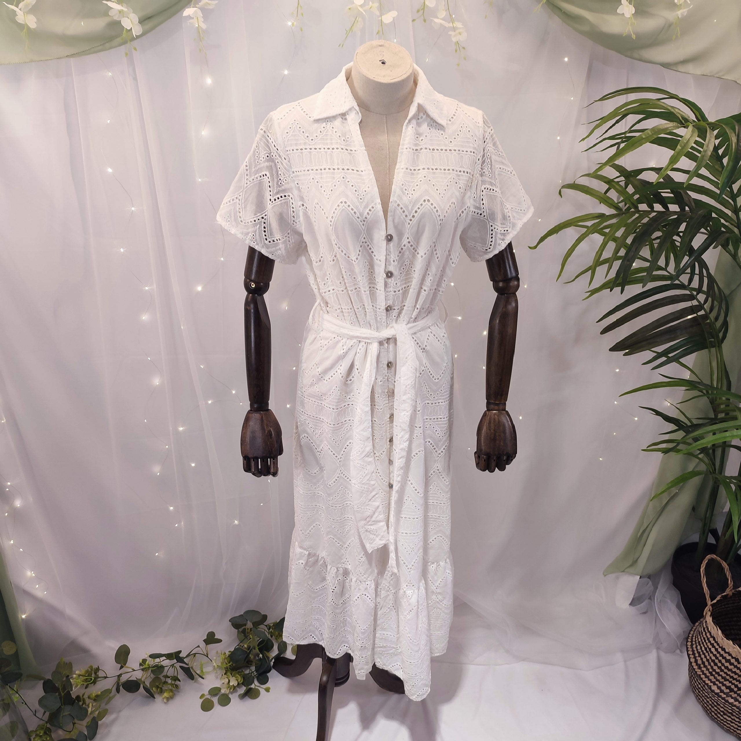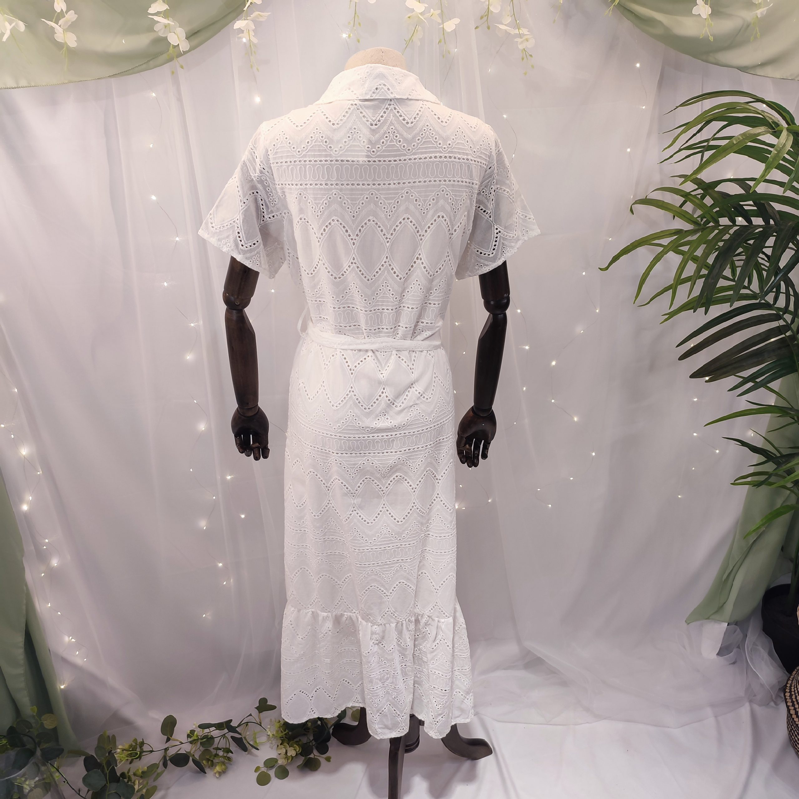 Completamente blanco, su diseño se inspira en la moda ibicenca más pura. Presenta mangas cortas y un cuello italiano tradicional con escote en pico, que estiliza el cuello y realza la silueta de forma delicada y muy femenina. El calado con motivos geométricos que adorna todo el vestido aporta un aire artesanal, bohemio y fresco, ideal para tus escapadas estivales o paseos al atardecer.